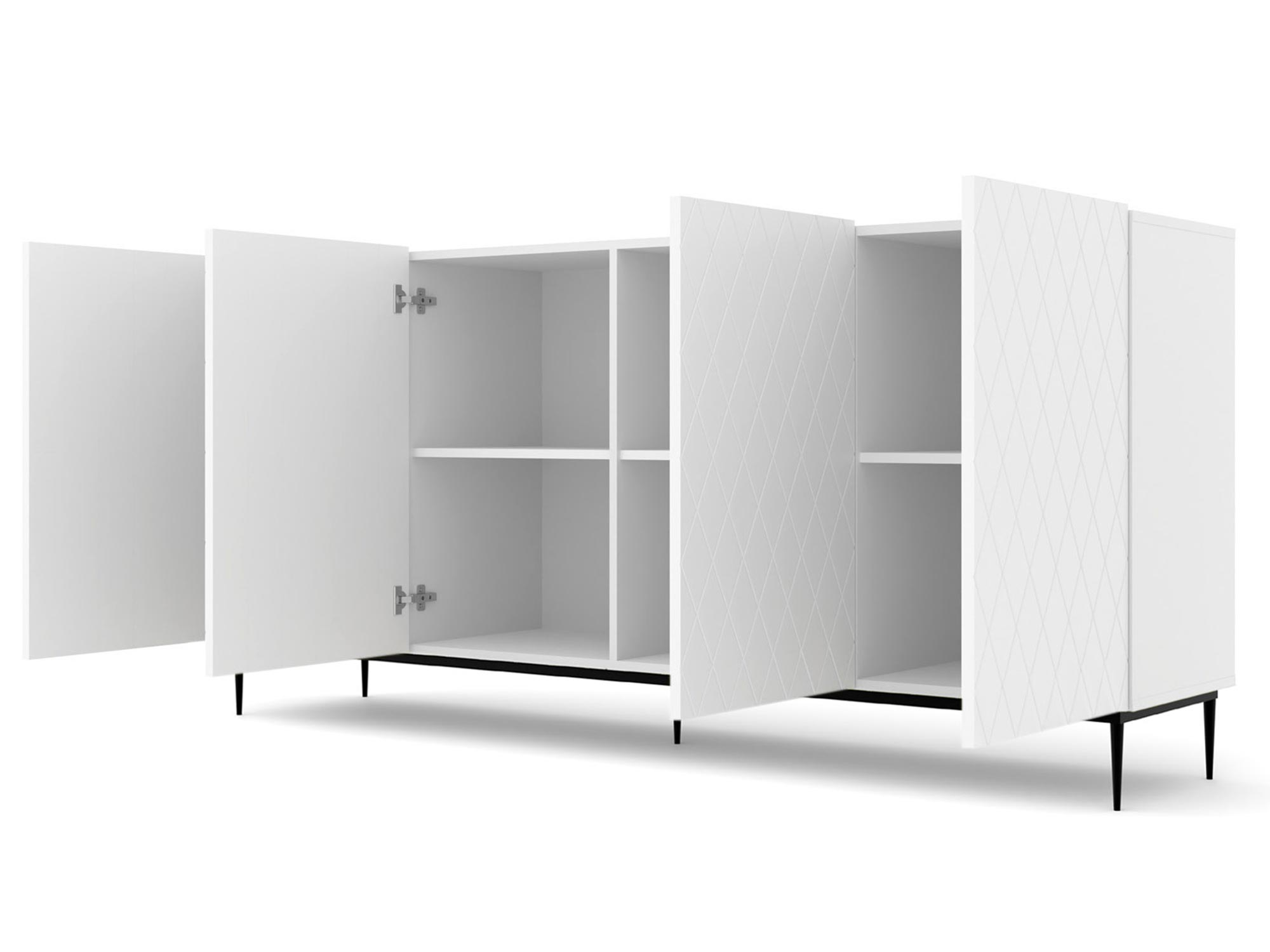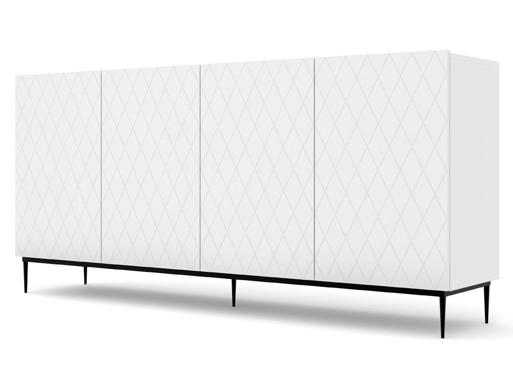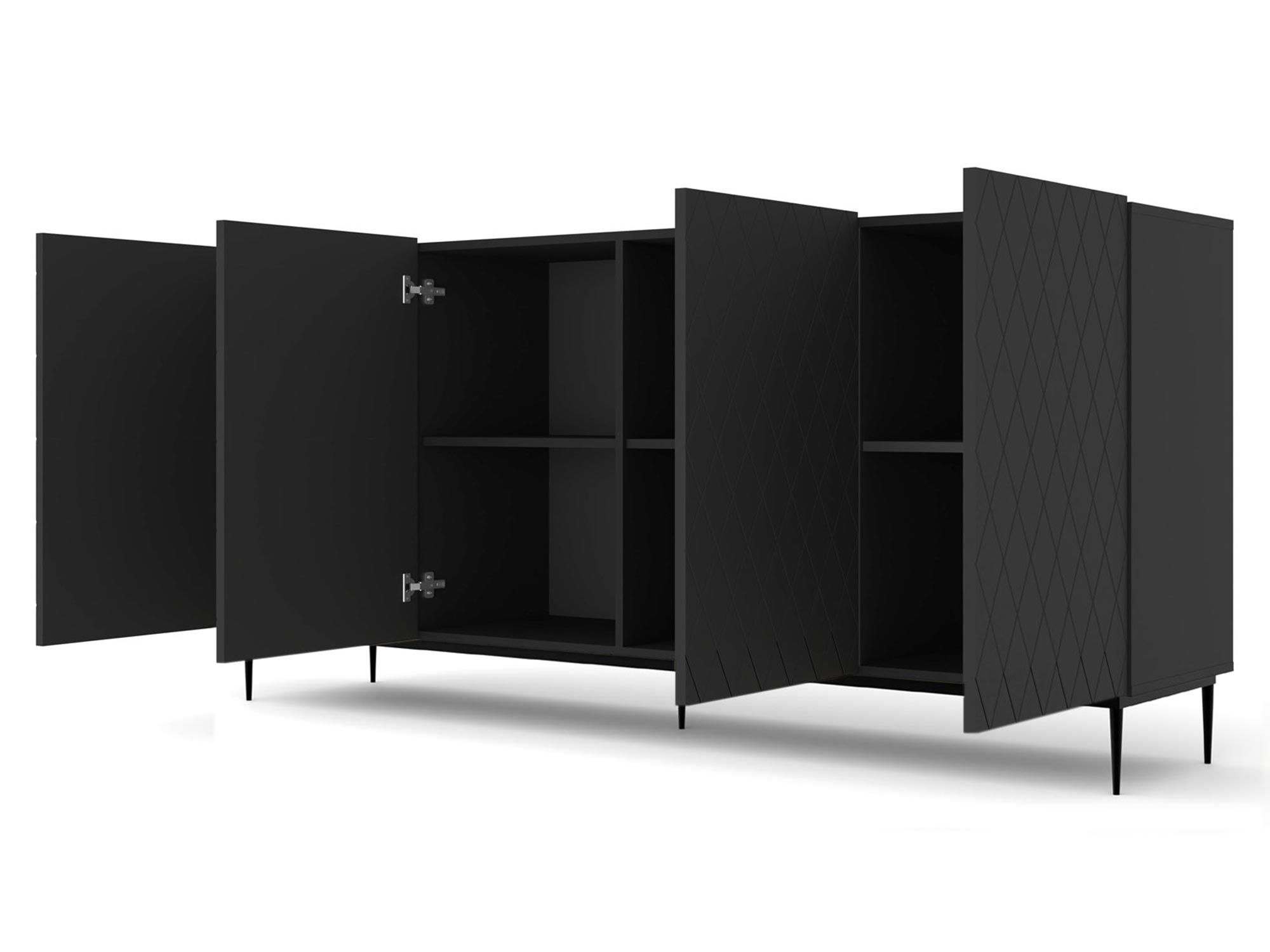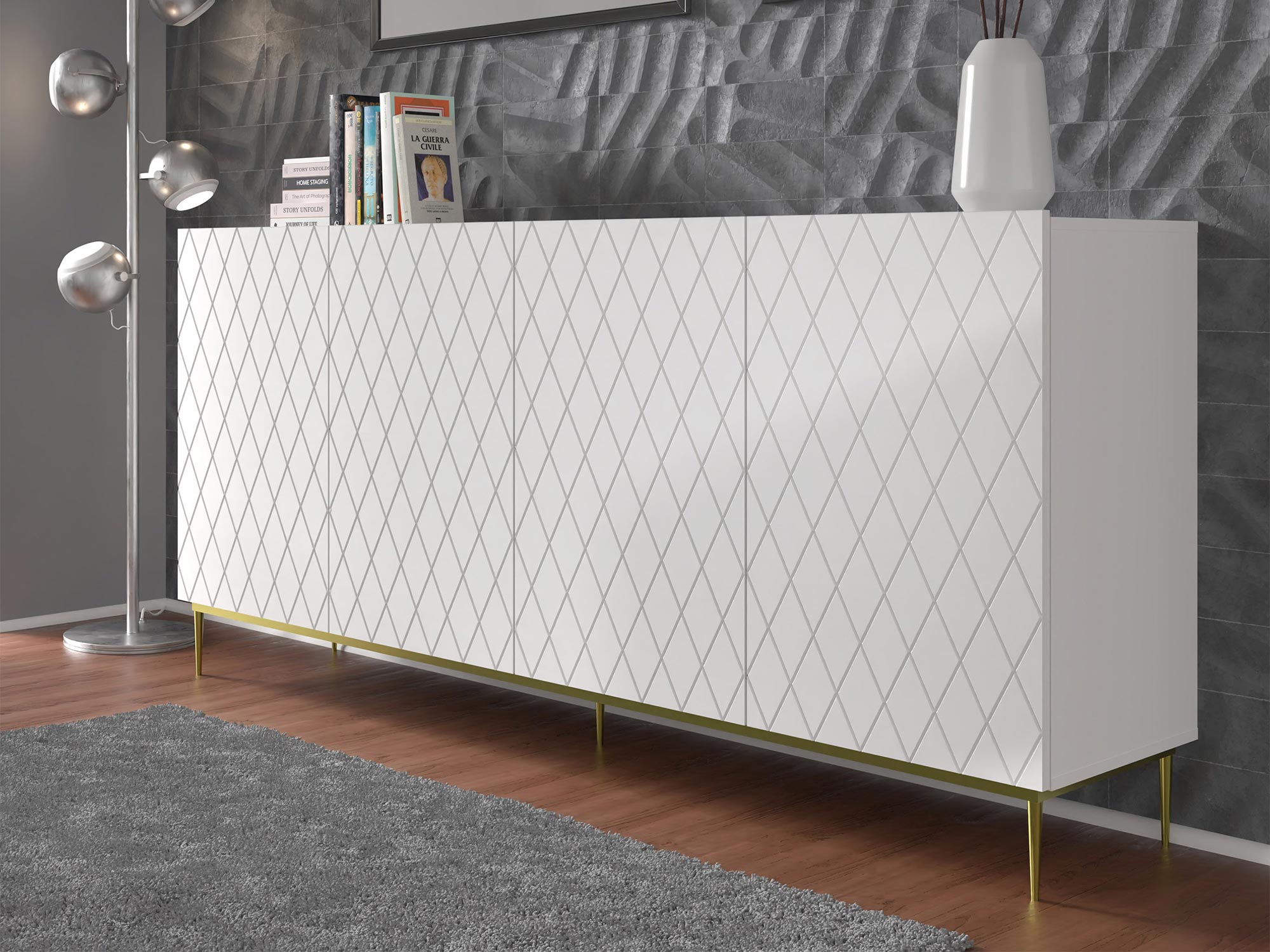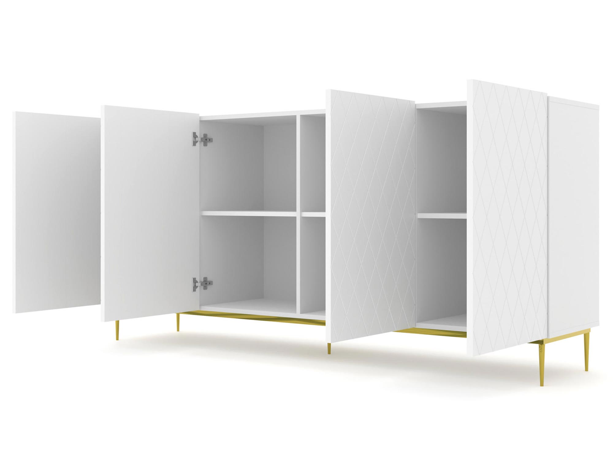 Korpus komody Bellagio wykonany jest z płyty laminowanej o grubości 16 mm, co zapewnia jej trwałość i odporność na codzienne użytkowanie. Fronty z płyty MDF o tej samej grubości, ozdobione atrakcyjnymi zdobieniami, dodają meblowi elegancji i nowoczesnego wyglądu. Komoda jest osadzona na stabilnych metalowych nogach, dostępnych w kolorze złotym lub czerni, co nadaje jej dodatkowego uroku i stabilności.