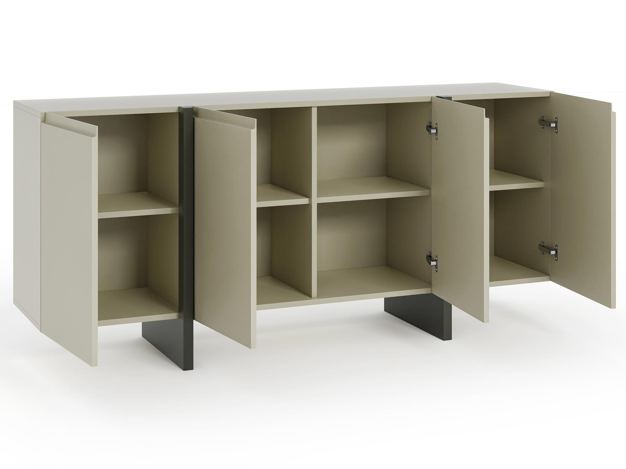 Komoda Crown została zaprojektowana z myślą o maksymalnej funkcjonalności. Wyposażona w cztery zamknięte schowki z półkami, oferuje dużo miejsca do przechowywania różnorodnych przedmiotów, takich jak ubrania, książki czy inne akcesoria. Wyfrezowane uchwyty ułatwiają otwieranie drzwiczek, jednocześnie podkreślając nowoczesny design mebla.