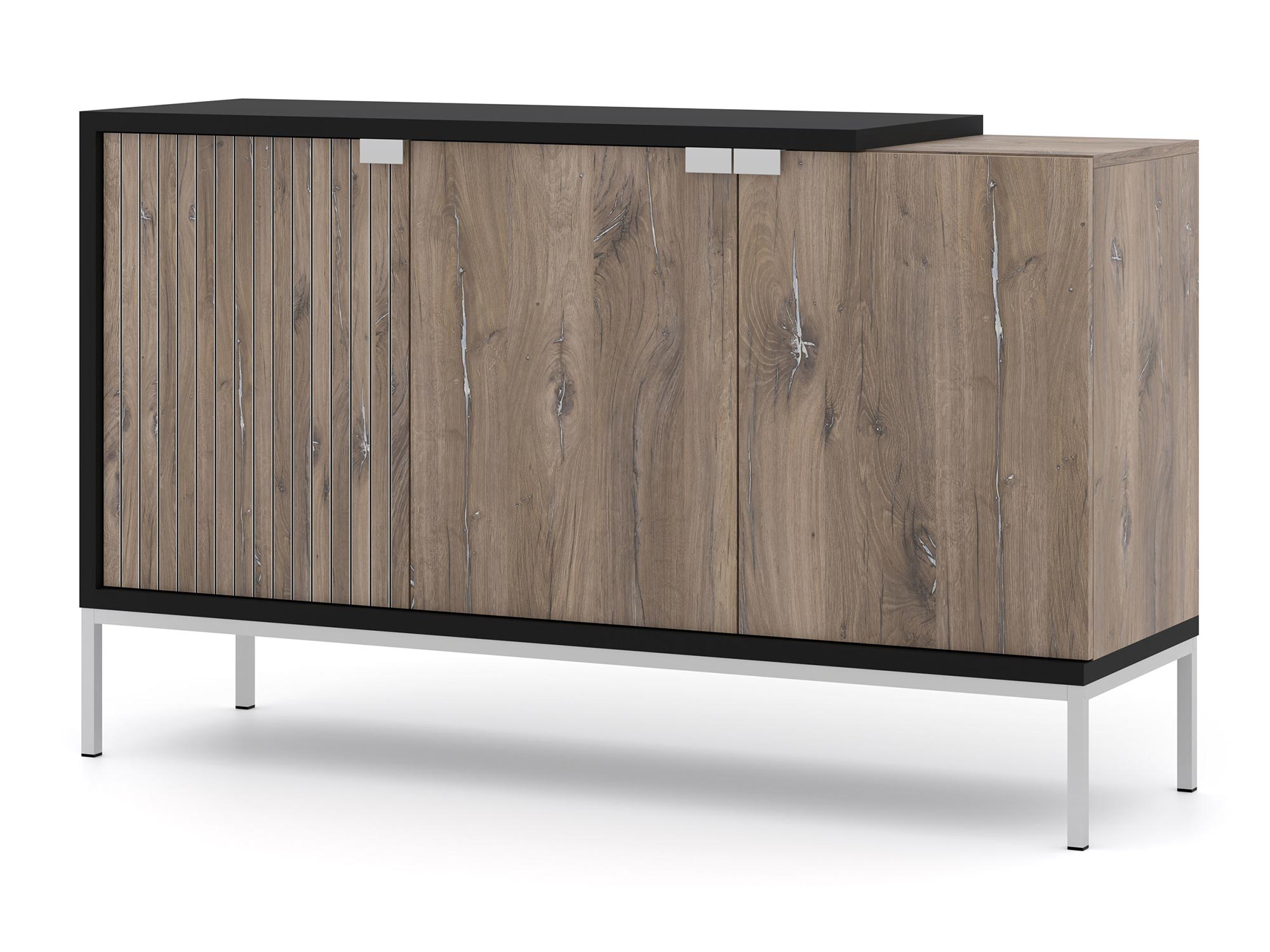 Rustykalny dekor dębu Flagstaff, imitujący postarzałe drewno, zestawiono z kontrastującym odcieniem matowej czerni. Całość dopełniają srebrne akcenty w postaci prostych, geometrycznych uchwytów oraz metalowej ramy. Nietypowa forma, w której ciemne płyty otaczają korpus, a zakończenie blatu dodaje wyrazistego charakteru i dynamiki, czynią tę komodę wyjątkową.