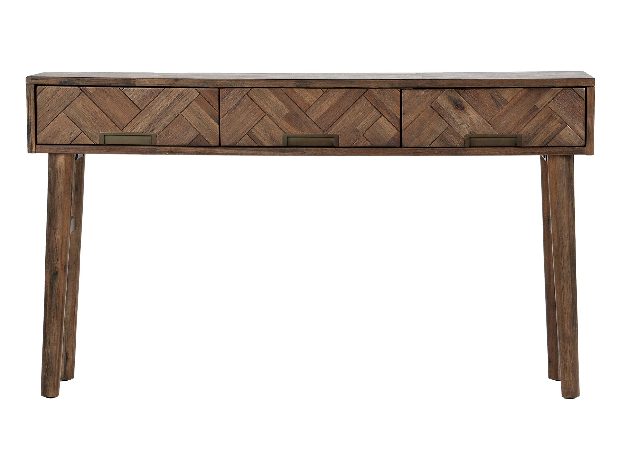 Konsola Willowbrook to elegancki mebel, który łączy w sobie klasyczny styl retro, vintage oraz boho. Wykonana z litego drewna akacjowego, posiada piękne ciemnobrązowe wykończenie, które dodaje jej ciepła i elegancji. Fronty ozdobione intarsją w jodełkę oraz uchwyty w kolorze mosiądzu podkreślają jej wyjątkowy charakter. Konsola wyposażona jest w trzy przestronne szuflady, idealna do przechowywania różnych drobiazgów. Doskonała do salonu, holu czy sypialni – jest zarówno funkcjonalna, jak i estetyczna.
