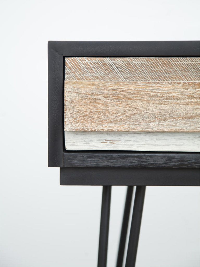 Konsola Mondo to mebel, który łączy w sobie klasykę retro z nowoczesnymi akcentami. Fronty wykonane z litego drewna akacji mają unikalną fakturę 3D, dzięki czemu mebel wyróżnia się na tle innych. Współczesny, czarny korpus z płyty MDF stanowi doskonałe tło dla frontów w odcieniach szarości i beżu, a metalowe nogi w kolorze czarnym nadają konsoli elegancji. Dodatkowo, szuflady wyłożone aksamitnym materiałem gwarantują wysoką jakość i styl. To idealna konsola do salonu, przedpokoju czy biura, która z pewnością przyciągnie uwagę gości.