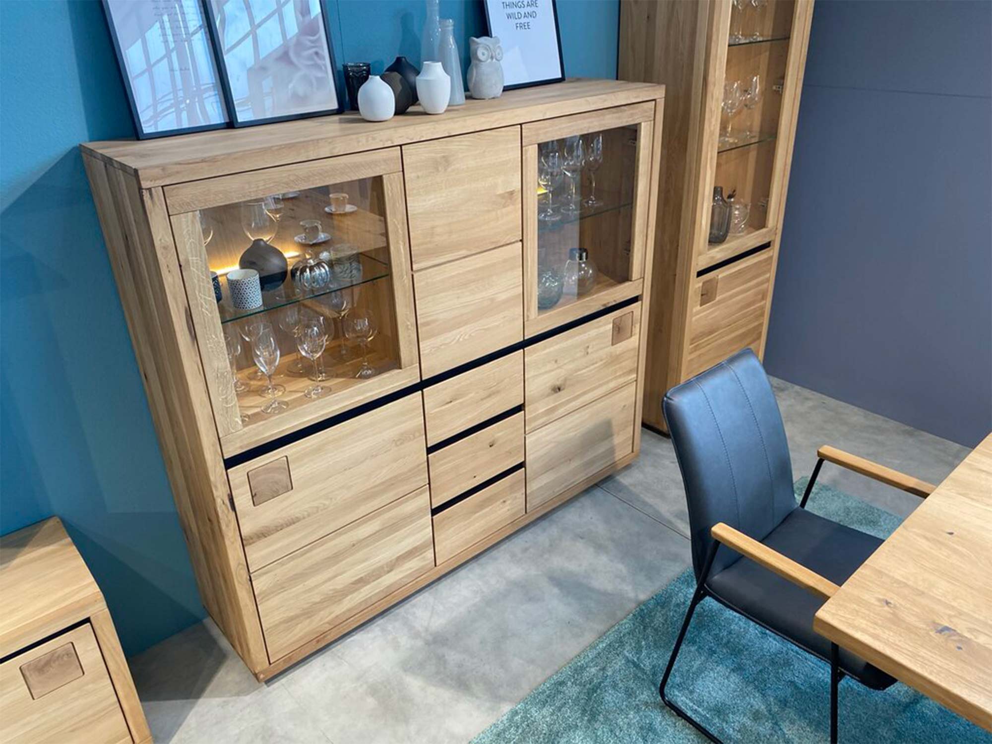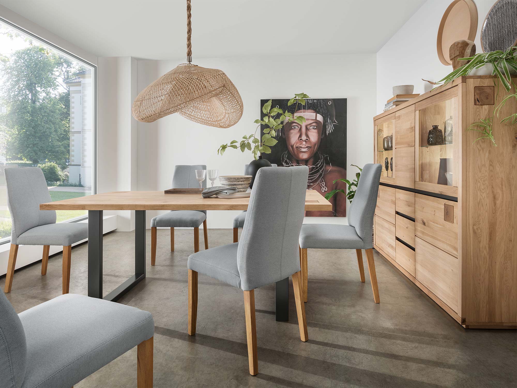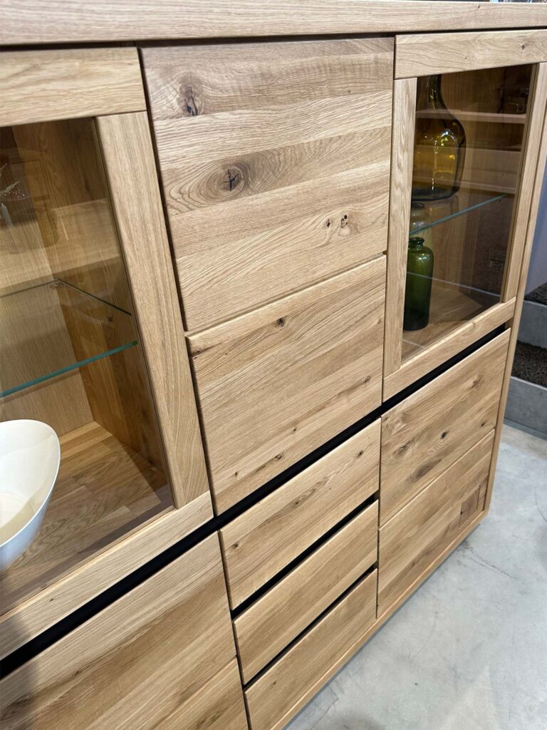 Szeroki Kredens z Litego Dębu Opus nie jest zwykłym meblem – to prawdziwe dzieło sztuki. Wyjątkowe czarne wstawki i kwadratowe detale dodają mu niepowtarzalnego charakteru. Zachowanie naturalnego układu słojów, sęków i barwy dębu, sprawia, że kredens posiada ciekawy design, który przykuwa uwagę i staje się punktem centralnym każdego pomieszczenia.