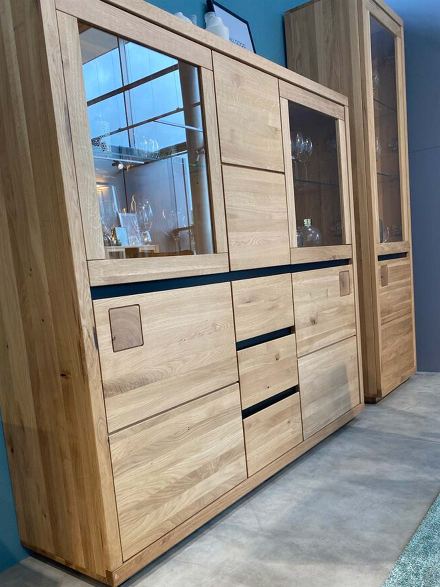 Witryna z drewnianymi frontami i dwiema szufladami dolnymi