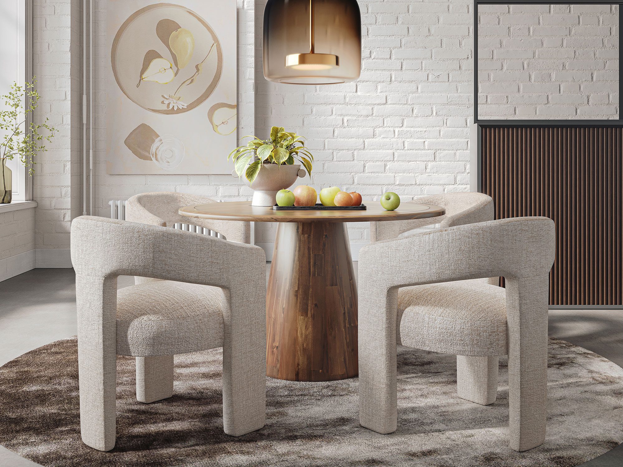 Eleganckie krzesło tapicerowane w kolorze jasnobeżowym wykonane z najwyższej jakości tkaniny szenilowej. Dzięki prostej formie i modnym, obłym kształtom, to krzesło stanowi doskonały wybór do każdej nowoczesnej jadalni. Jego luksusowa tapicerka oraz staranna konstrukcja zapewniają nie tylko estetyczny wygląd, ale także wygodę użytkowania.