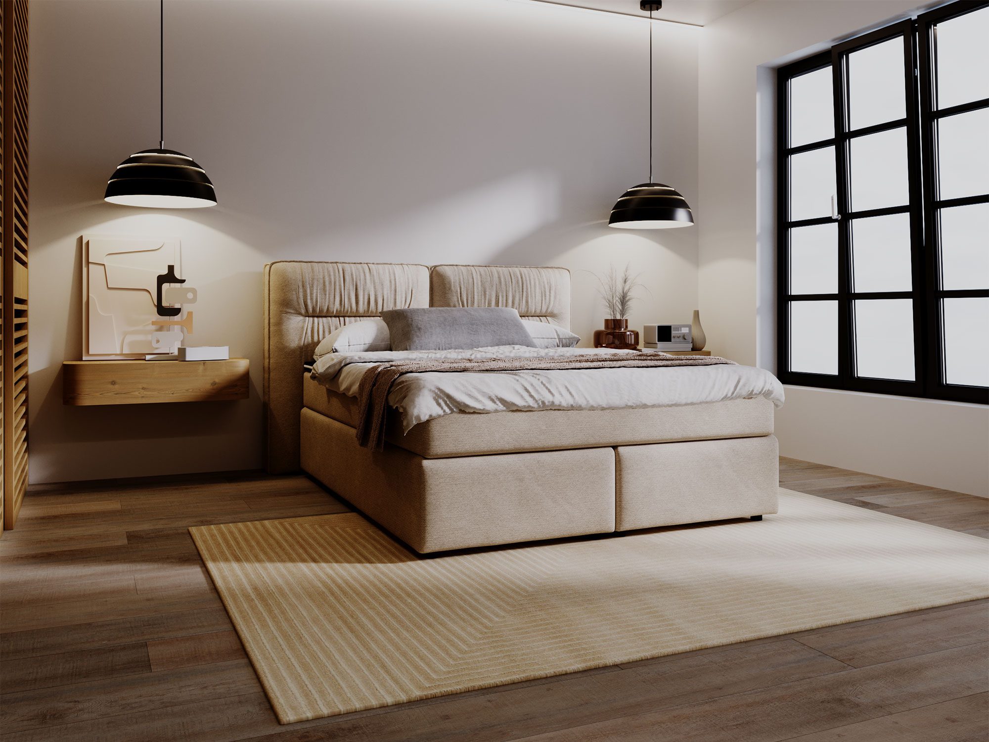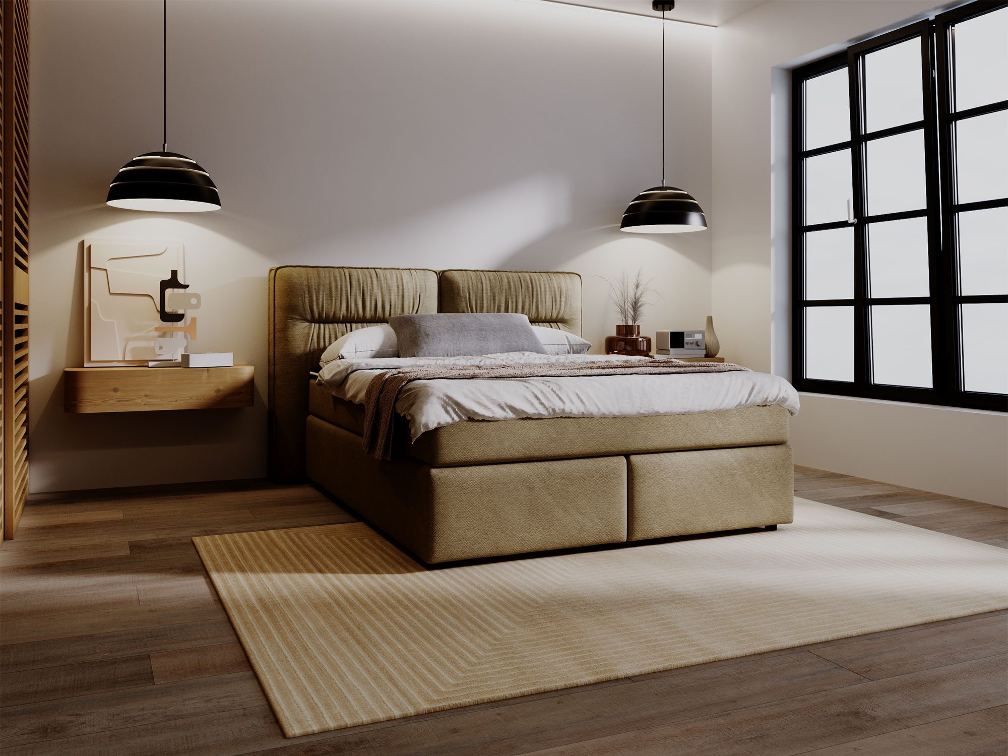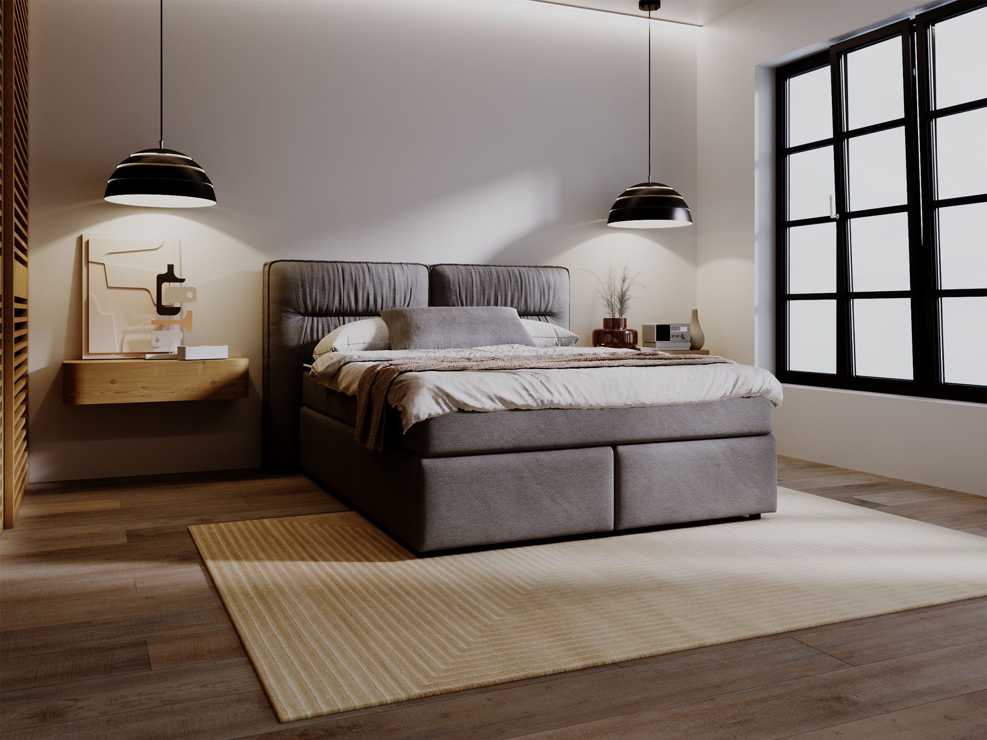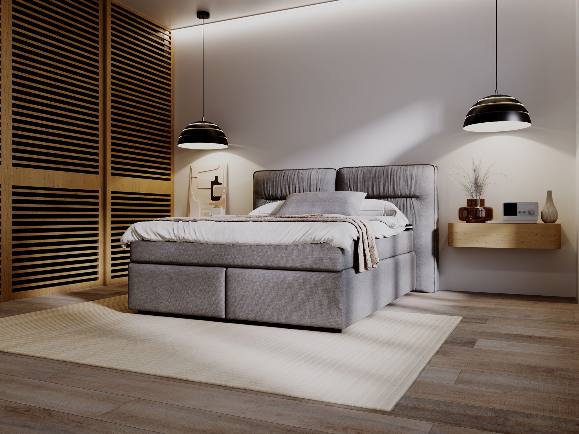 Najbardziej charakterystycznym elementem łóżka DOODII jest jego imponujące wezgłowie, które pełni funkcję zarówno dekoracyjną, jak i praktyczną. Zagłówek został podzielony na dwie części i ozdobiony głębokim, pionowym pikowaniem, co nadaje łóżku niepowtarzalny, nowoczesny wygląd. Jego wysokość wynosząca 133 cm sprawia, że łóżko staje się dominującym elementem aranżacji sypialni, podkreślając luksusowy charakter wnętrza. Zagłówek nie tylko dodaje stylu, ale również zapewnia wygodne podparcie podczas wieczornego relaksu, czytania książki lub oglądania telewizji.