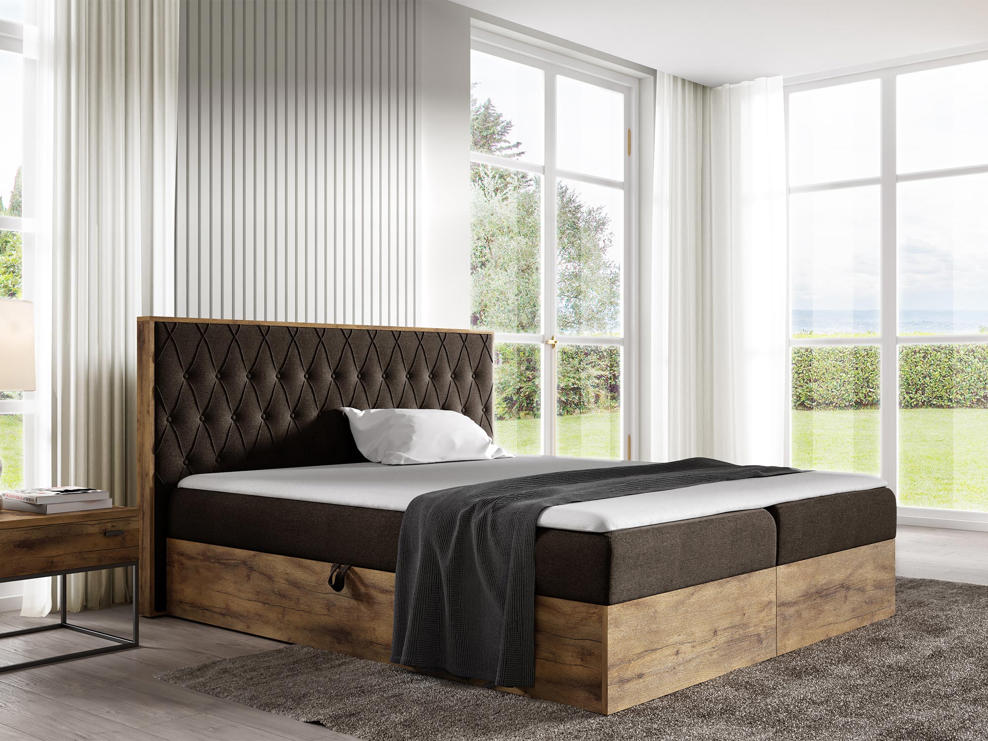 Klasyczne Kontynentalne Łóżko z Pojemnikiem SIMBA 3- to wyjątkowe połączenie ponadczasowego stylu i praktycznych rozwiązań, które idealnie wpasuje się w każdą sypialnię. Wykonane z solidnych materiałów, z płyty laminowanej w kolorze dąb wotan, łóżko SIMBA 3 oferuje nie tylko estetyczny wygląd, ale także komfortowy sen dzięki wysokiej jakości materacowi bonell oraz dodatkowej warstwie komfortu w postaci topperu z pianki wysokoelastycznej T-25. Ponadto, praktyczne dwa pojemniki na pościel sprawiają, że łóżko jest nie tylko piękne, ale także funkcjonalne.