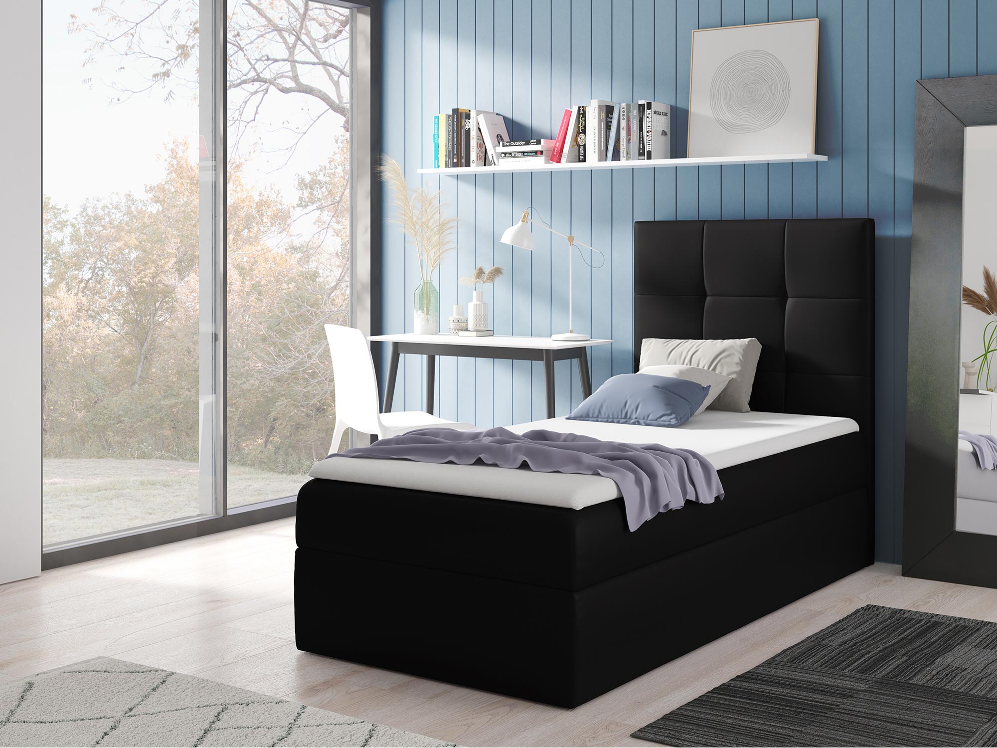 Czarne łóżko z wysokim zagłówkiem – dla młodzieży lub dorosłych.