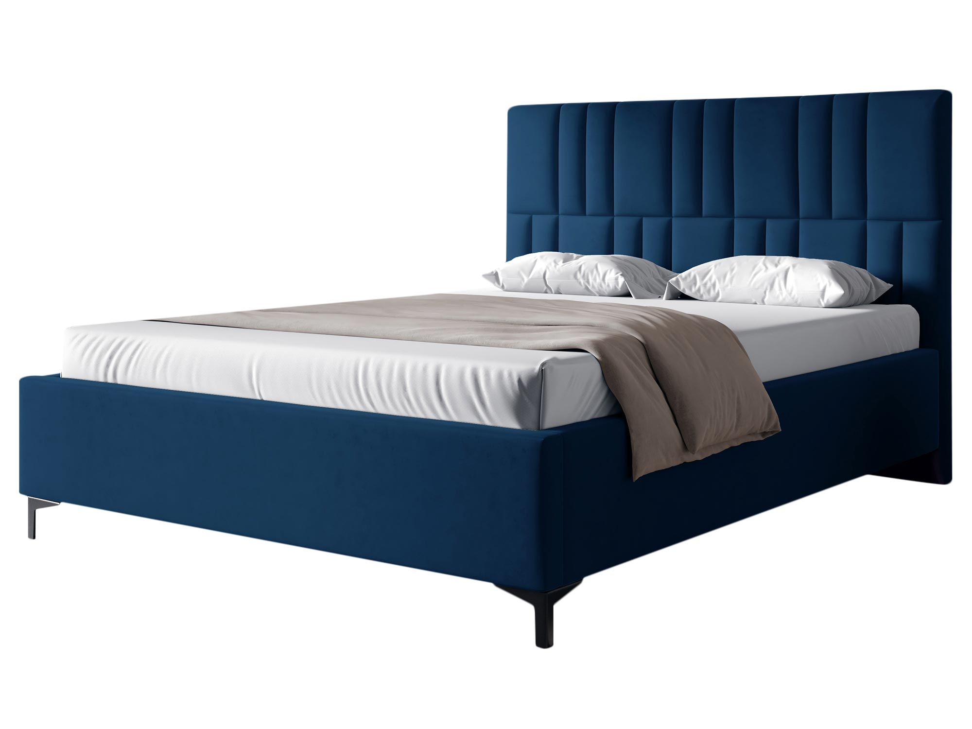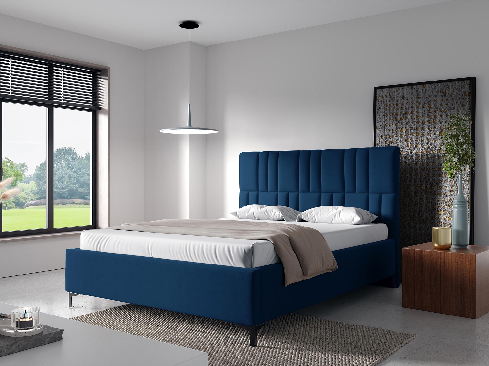 Granatowe łóżko z ozdobnym przeszyciem i metalowymi czarnymi nóżkami