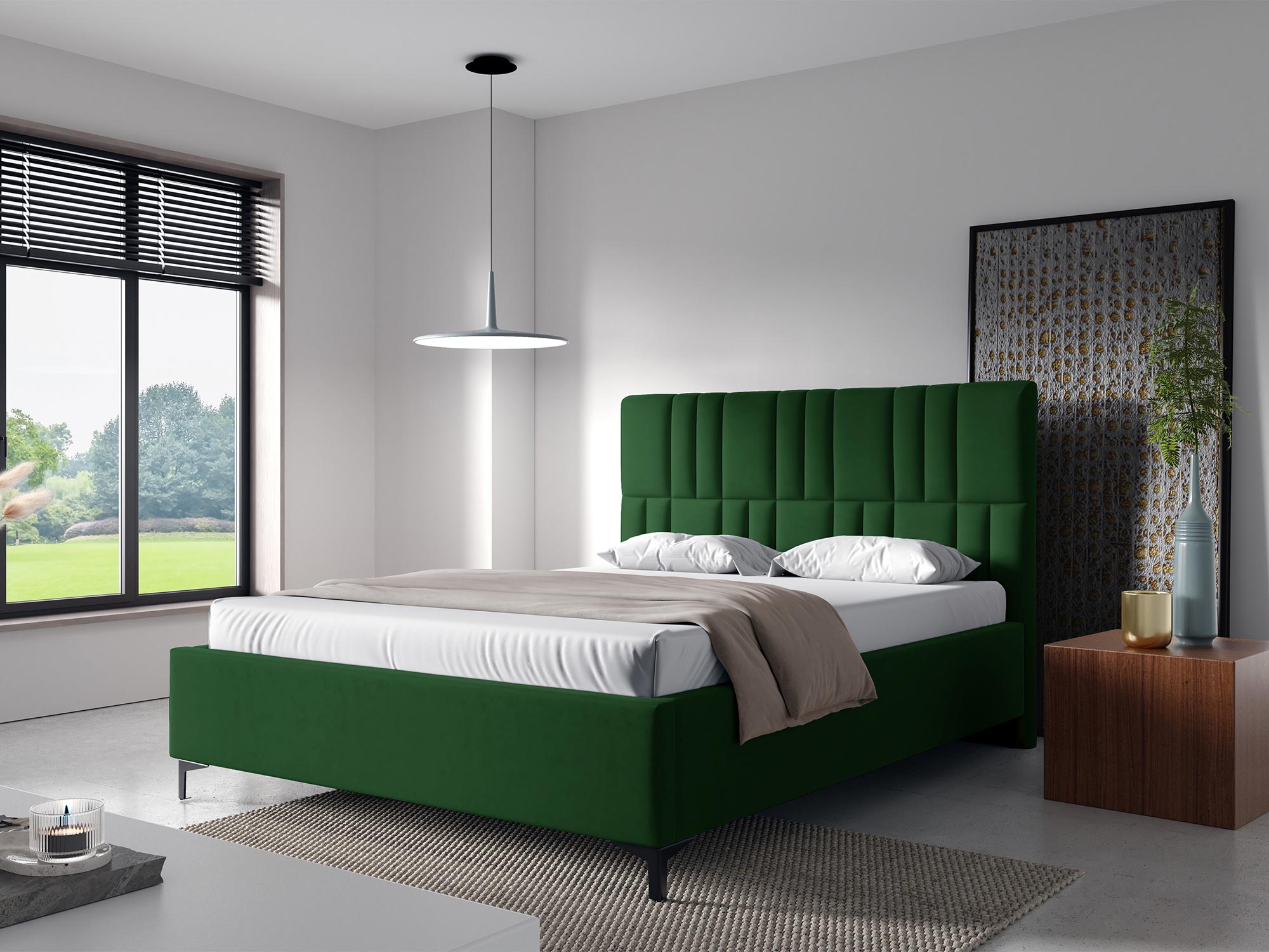 Zielone łóżko z wysokim zagłówkiem i białym materacem