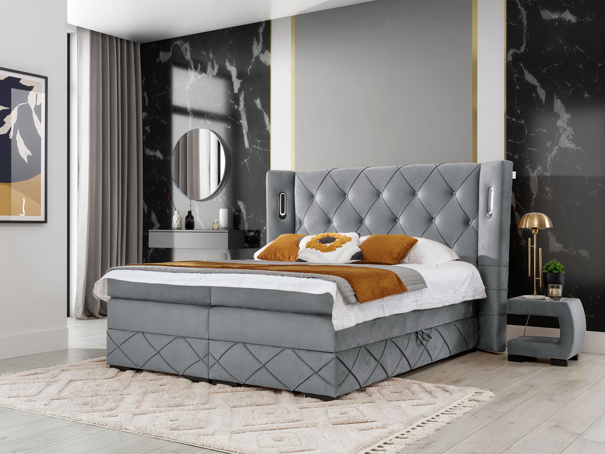 Jeżeli poszukujesz idealnego połączenia elegancji, komfortu i funkcjonalności, Kontynentalne Łóżko z Oświetleniem Sensorycznym Nexus Lux to propozycja, która spełni Twoje oczekiwania. Zaprojektowane w nowoczesnym stylu, to łóżko wprowadzi do Twojej sypialni odrobinę luksusu i wyjątkowej wygody. Od starannie zaprojektowanego zagłówka po praktyczne rozwiązania takie jak pojemniki na pościel czy oświetlenie sterowane dotykowo – Nexus Lux to kwintesencja nowoczesnego designu.