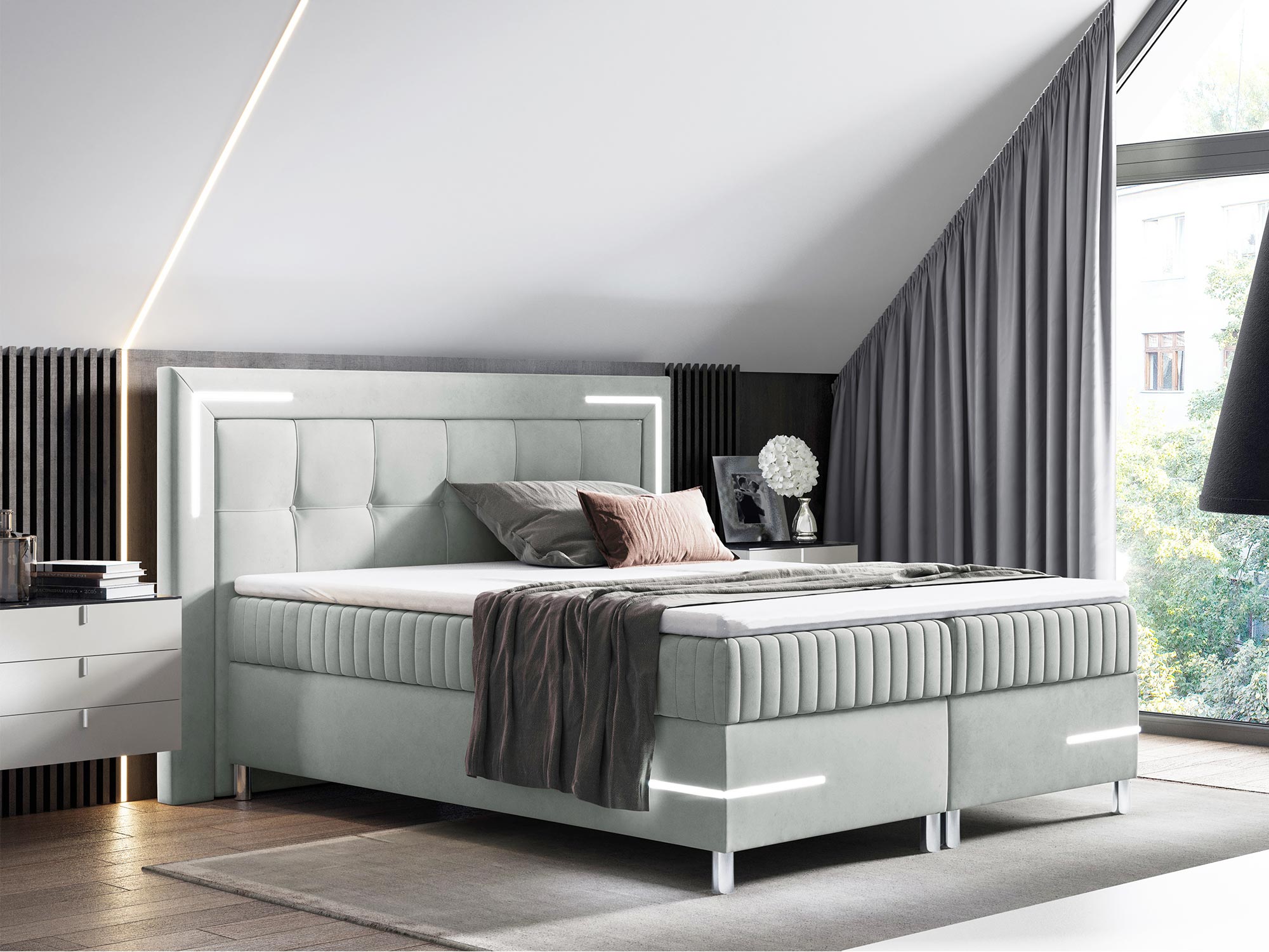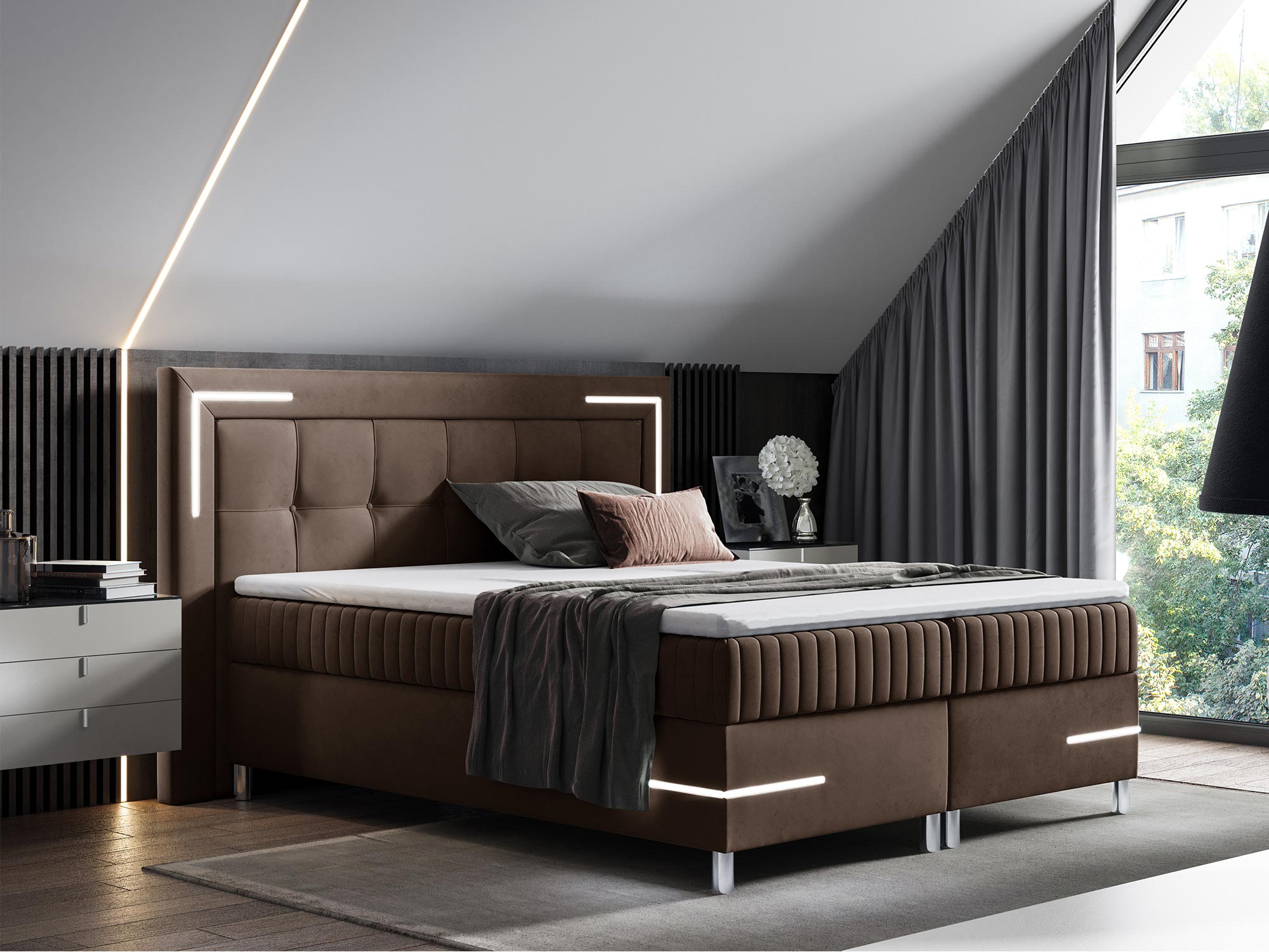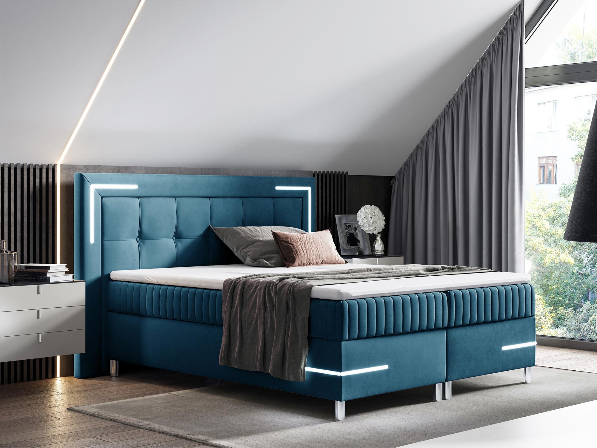 Dodatkowo, pikowanie na zagłówku oraz przodzie łóżka z eleganckimi guzikami wprowadza element wyrafinowania, dzięki czemu łóżko Eclipse doskonale komponuje się z wnętrzami w stylu nowoczesnym i futurystycznym. Chromowane detale podkreślają luksusowy charakter łóżka, tworząc wyjątkowy punkt centralny w każdej sypialni.