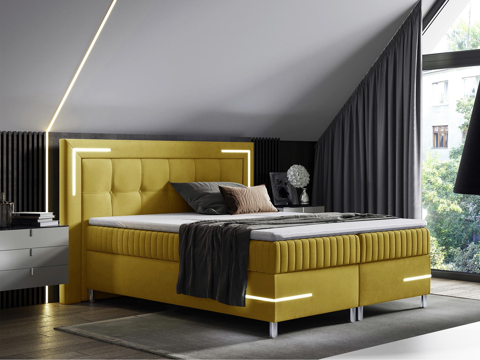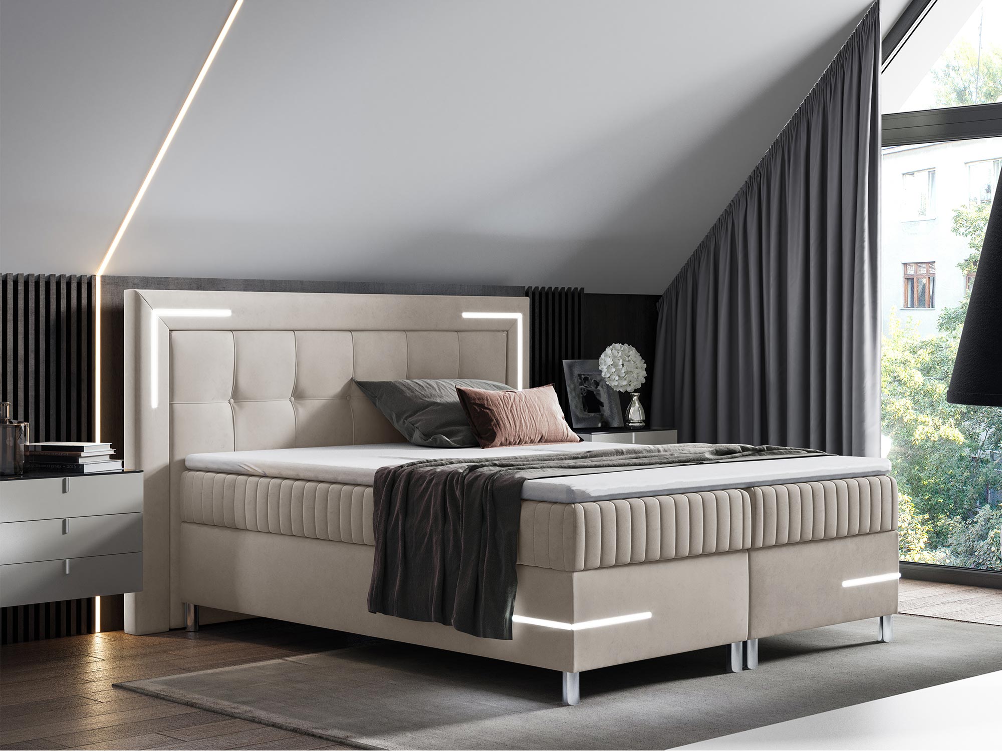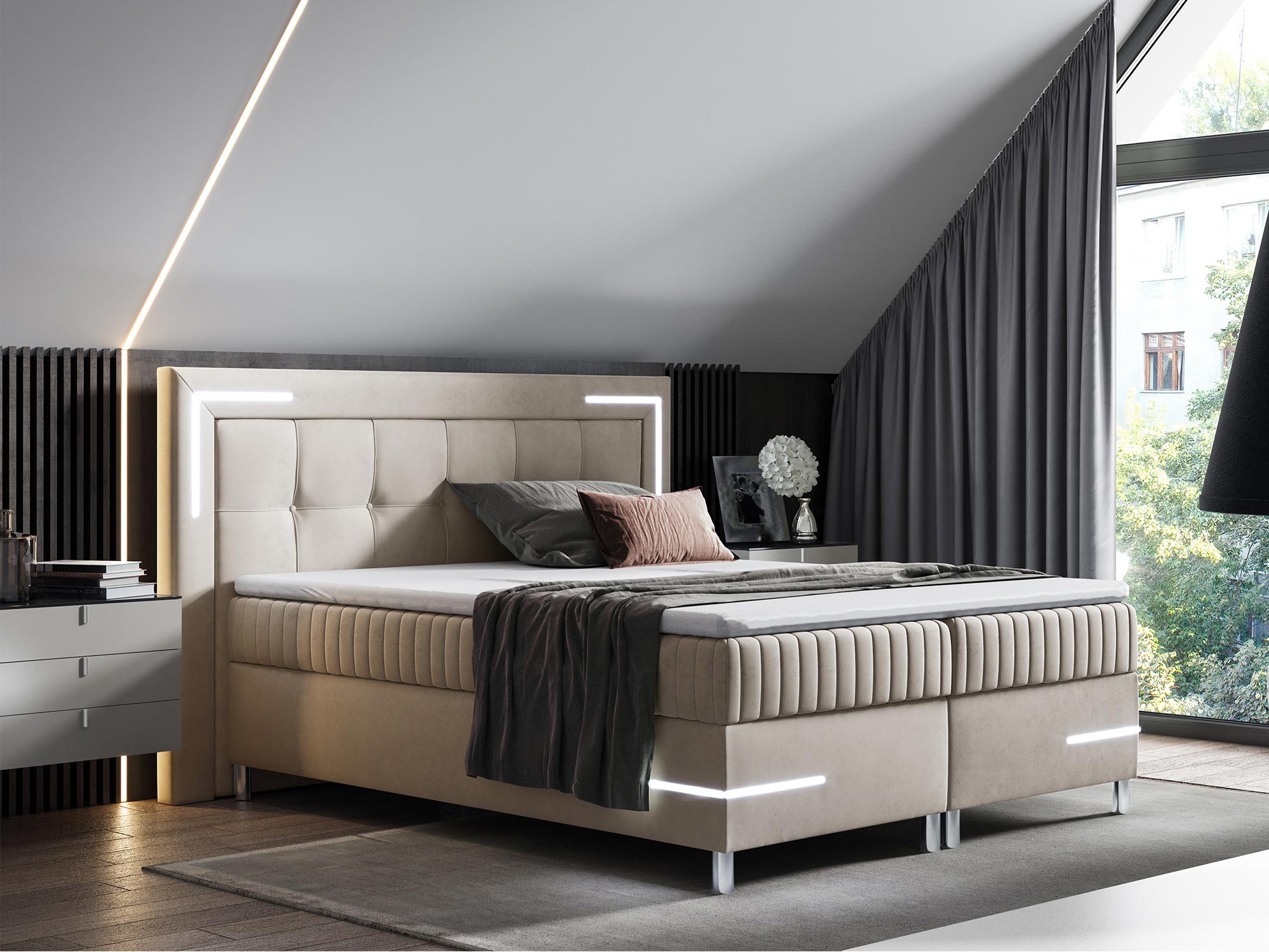 Dodatkowo, pikowanie na zagłówku oraz przodzie łóżka z eleganckimi guzikami wprowadza element wyrafinowania, dzięki czemu łóżko Eclipse doskonale komponuje się z wnętrzami w stylu nowoczesnym i futurystycznym. Chromowane detale podkreślają luksusowy charakter łóżka, tworząc wyjątkowy punkt centralny w każdej sypialni.