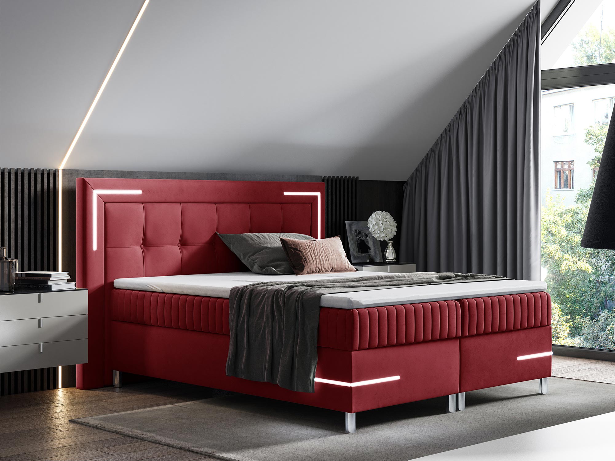 Kontynentalne Łóżko z Podświetleniem LED Eclipse to idealne rozwiązanie dla osób, które poszukują nie tylko komfortu, ale także stylu w nowoczesnym, futurystycznym wydaniu. Dzięki wyjątkowej konstrukcji, nowoczesnym technologiom i eleganckim wykończeniom, łóżko Eclipse stanowi doskonałe połączenie luksusu i funkcjonalności. Styl futurystyczny, w którym zostało wykonane, nadaje sypialni nowoczesnego charakteru, a inteligentne podświetlenie LED sterowane pilotem wprowadza atmosferę relaksu i wyciszenia.