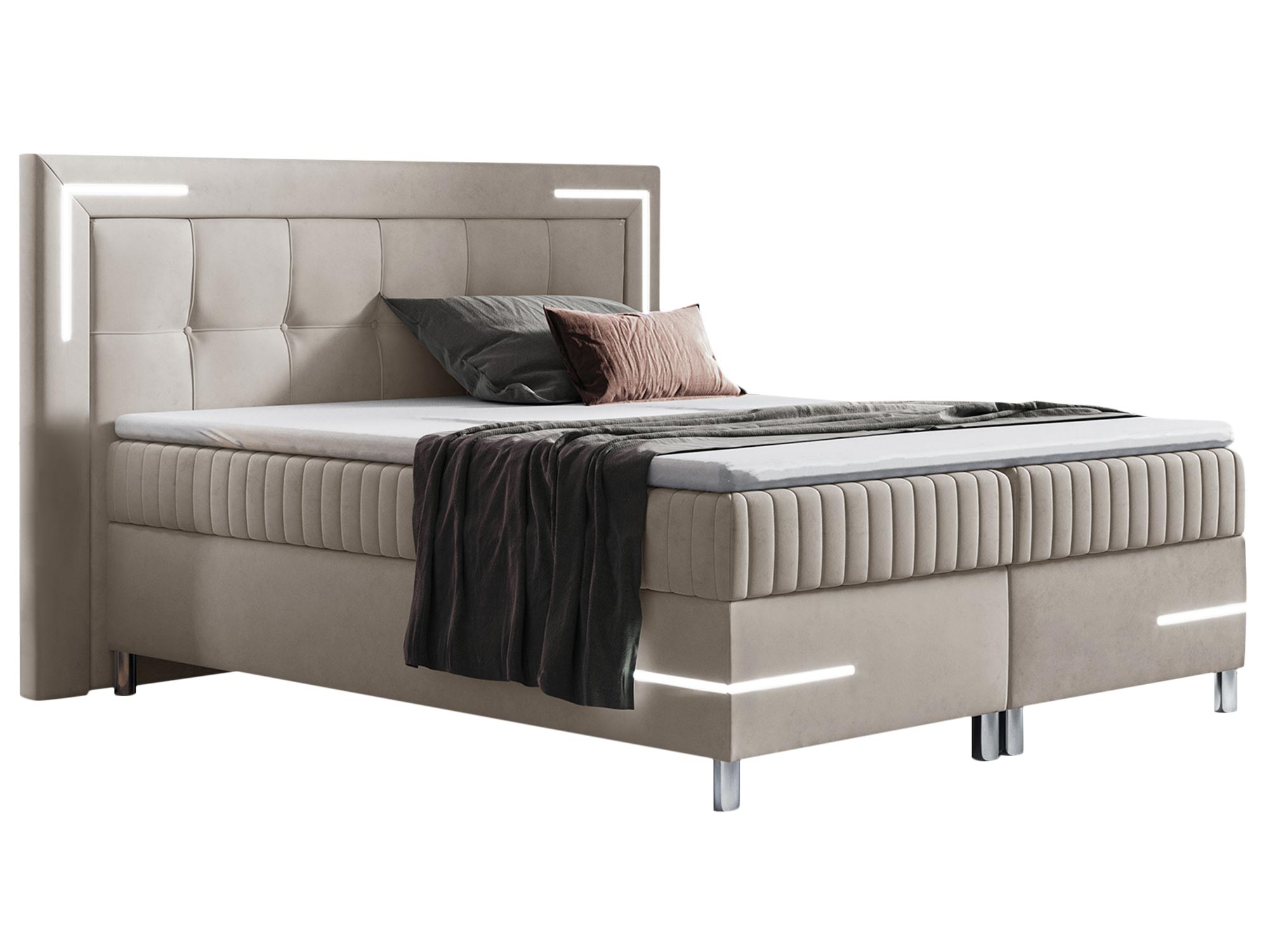 Kontynentalne Łóżko z Podświetleniem LED Eclipse to idealne rozwiązanie dla osób, które pragną wprowadzić do swojej sypialni nowoczesny styl i wyjątkowy komfort. Dzięki innowacyjnemu oświetleniu LED, eleganckiemu pikowaniu oraz praktycznym pojemnikom na pościel, łóżko Eclipse łączy w sobie luksusowy design z funkcjonalnością. Materac bonellowy, topper z pianki wysokoelastycznej oraz solidne wykonanie zapewniają długotrwały komfort snu, a nowoczesne rozwiązania techniczne wprowadzają do wnętrza futurystyczny charakter.