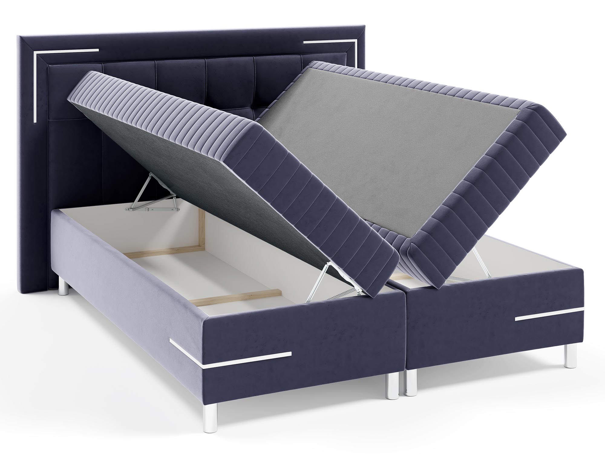 Łóżko Eclipse to także gwarancja trwałości i solidnego wykonania. Chromowane nóżki nadają meblowi nowoczesnego, eleganckiego charakteru, a jednocześnie zapewniają stabilność konstrukcji. Zarówno korpus, jak i zagłówek są w pełni tapicerowane, co dodaje całości spójności i stylowego wyglądu.