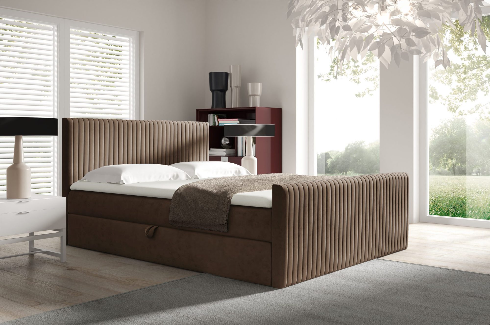 Łóżko Nobile wyróżnia się eleganckim wyglądem, który doskonale wpisuje się w styl skandynawski, charakteryzujący się prostotą, funkcjonalnością i naturalnymi materiałami. Tapicerowany zagłówek z ozdobnymi, pionowymi przeszyciami nadaje łóżku lekkości i elegancji, a przody łóżka z takim samym wzorem harmonijnie dopełniają całość.