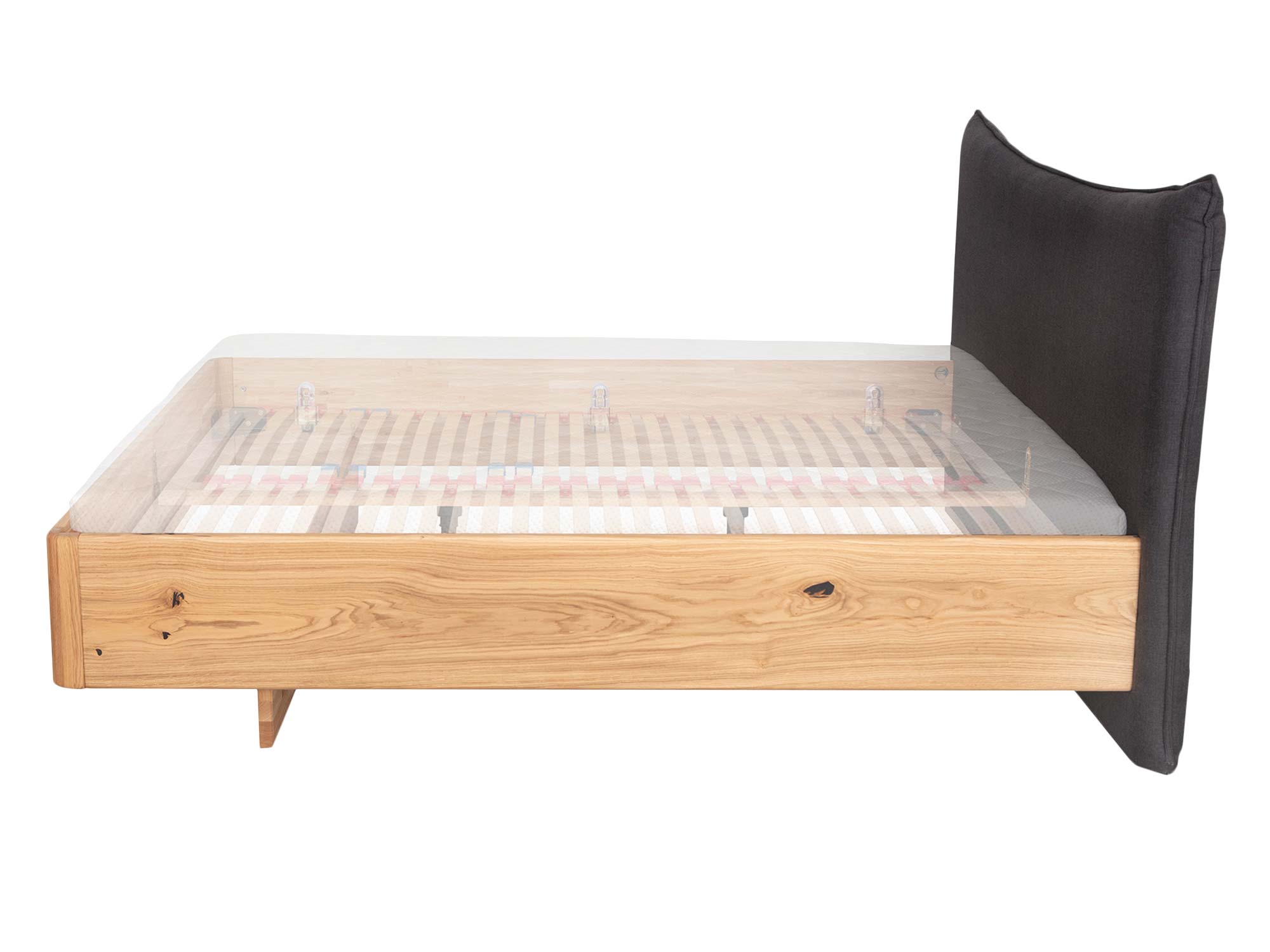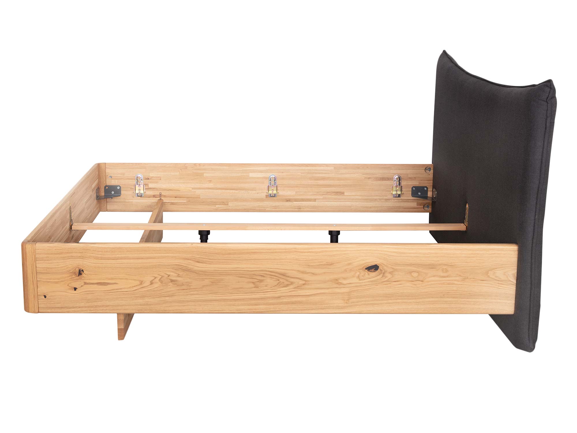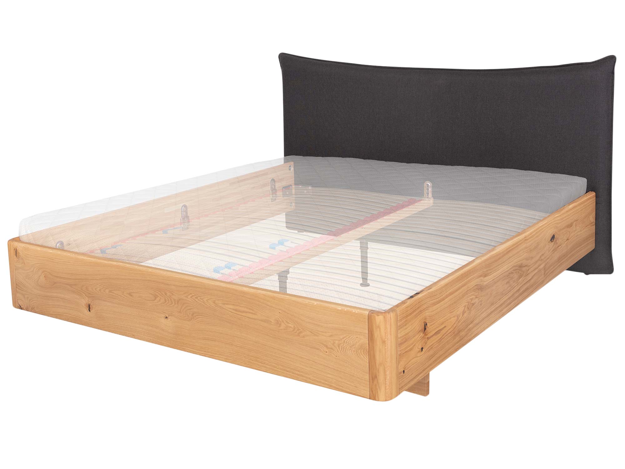 Zaokrąglona rama łączy nowoczesną prostotę z organiczną miękkością. Zaoblone narożniki zwiększają bezpieczeństwo użytkowania, a subtelnie wyoblone krawędzie sprawiają, że łóżko wygląda lekko nawet przy masywnej, dębowej konstrukcji. To detal, który czuć w dotyku i widać w każdym ujęciu.