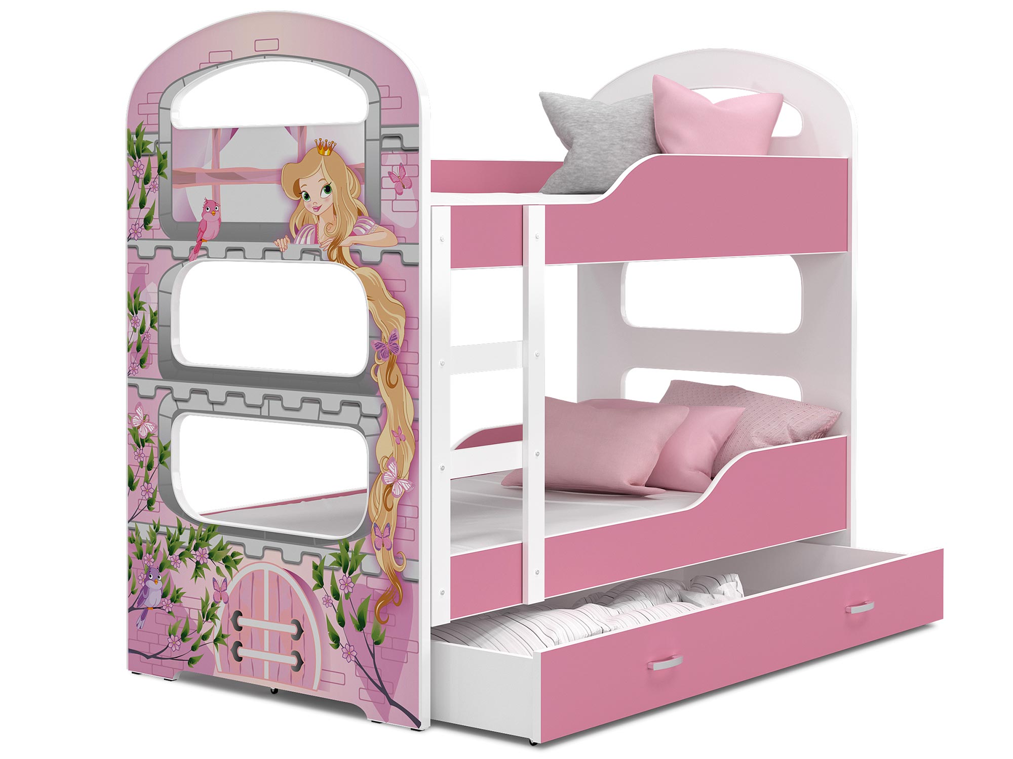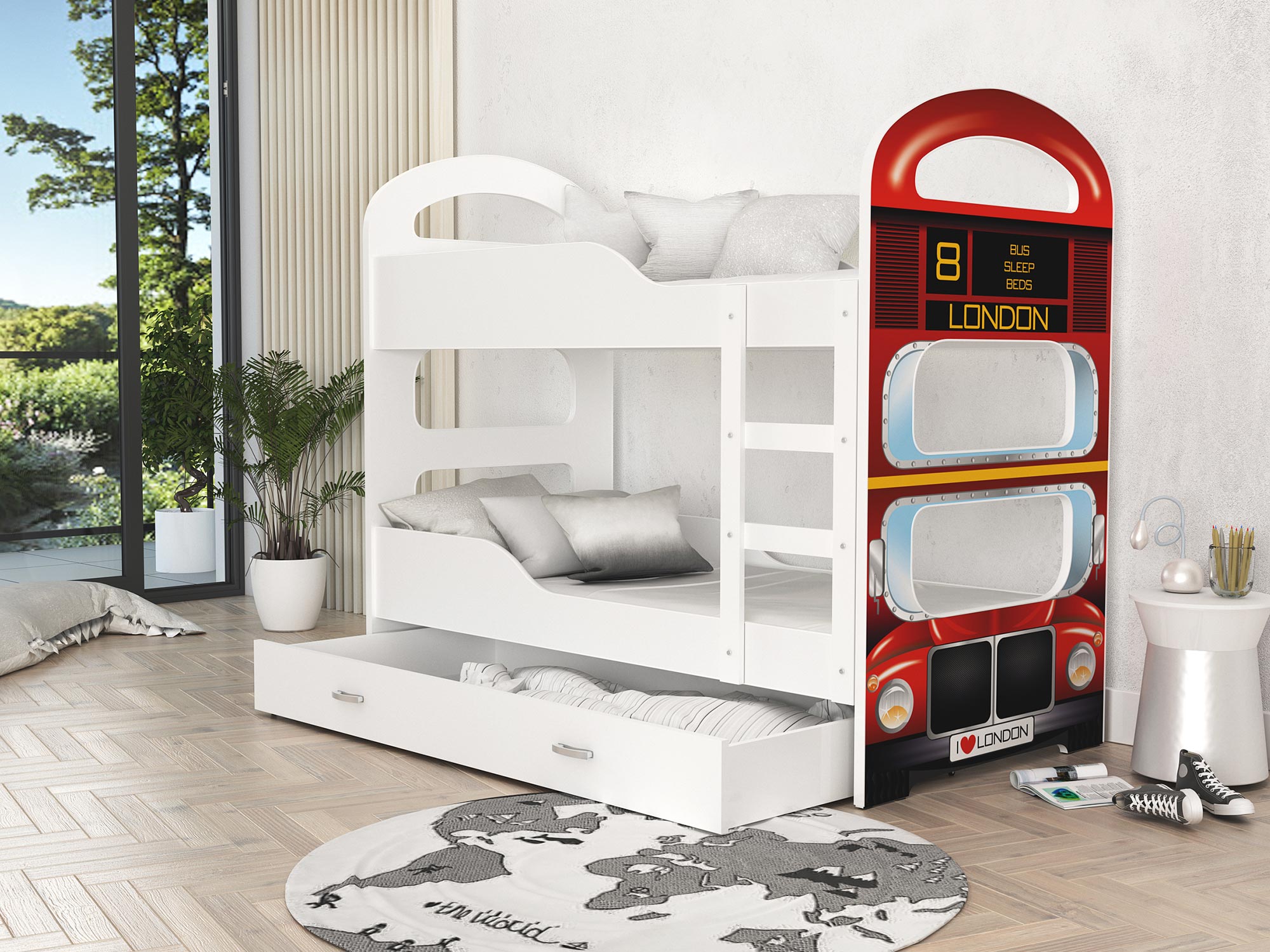 Piętrowe łóżka dla dzieci z nadrukiem FIROME to mebel, który cechuje się wygodą, bezpiecznym użytkowaniem i świeżym designem. Wytrzymała i trwała konstrukcja gwarantują solidność łóżka a także jego trwałość. Mebel wykonano z najwyższej klasy płyty MDF z zaokrąglonymi krawędziami i profilowanymi bokami, które mają na celu zapewnić bezpieczeństwo śpiącym dzieciom. Łóżko zostało wyposażone w pojemną wysuwaną na kółkach szufladę dedykowaną do przechowywania pościeli, drabinkę ułatwiającą wejście na piętro łóżka oraz barierki ochronne, które uniemożliwiają wypadnięcie dziecka, a także stelaż flex zrobiony z osadzonych w plastikowych kieszonkach sprężynujących listw. W opcji jest też materac z pianki w pokrowcu o grubości 7 cm. Ze względu na rozmaitość wykończeń i stylów w jakich urządzono dziecięce sypialnie nasze produkty są dostępne w wielu nadrukach do wyboru. Do łóżka został dodany zestaw przeznaczony do montażu jak również instrukcja.