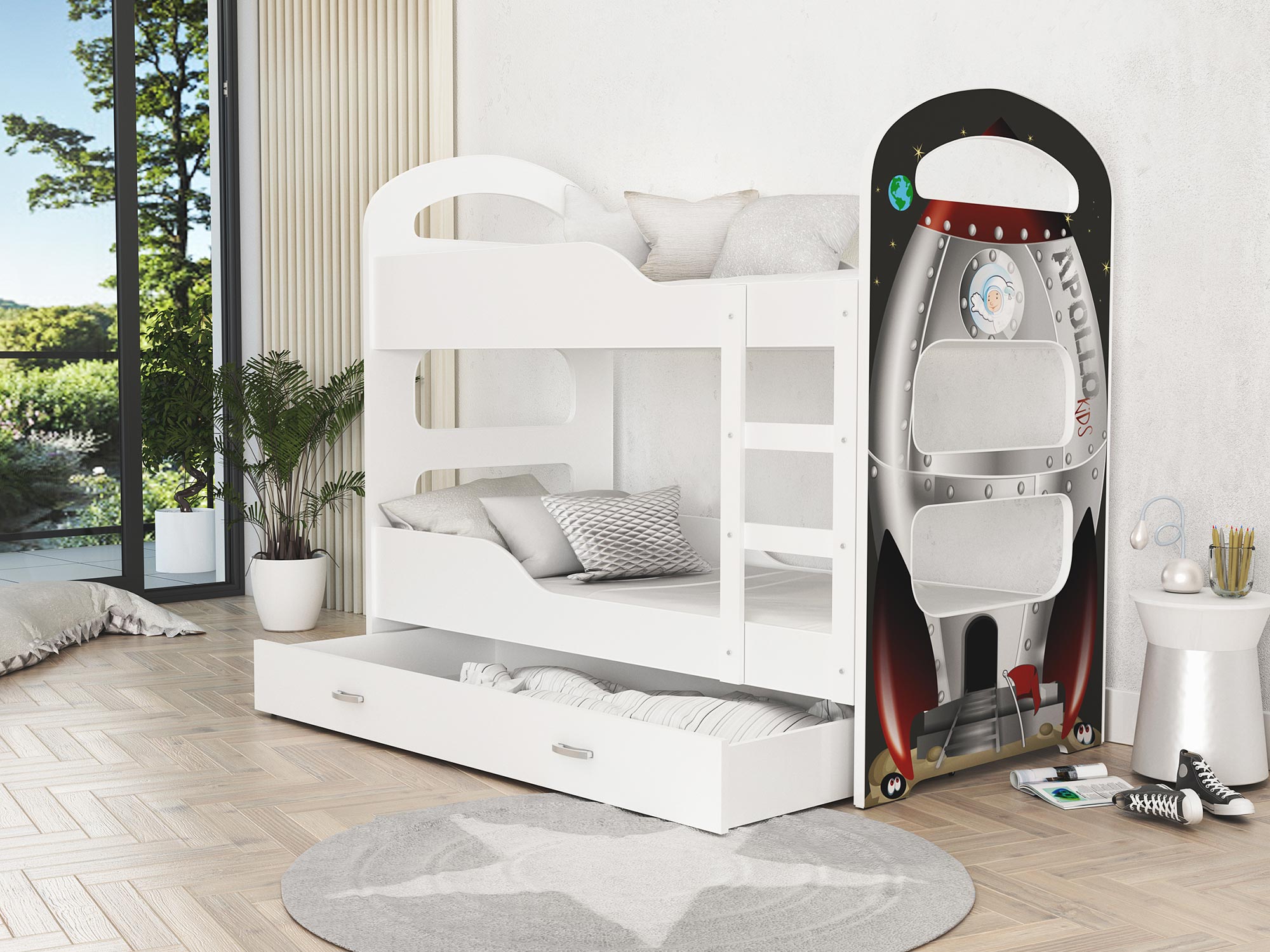 Aranżacja dziecięcego łóżka piętrowego z rysunkiem technicznym