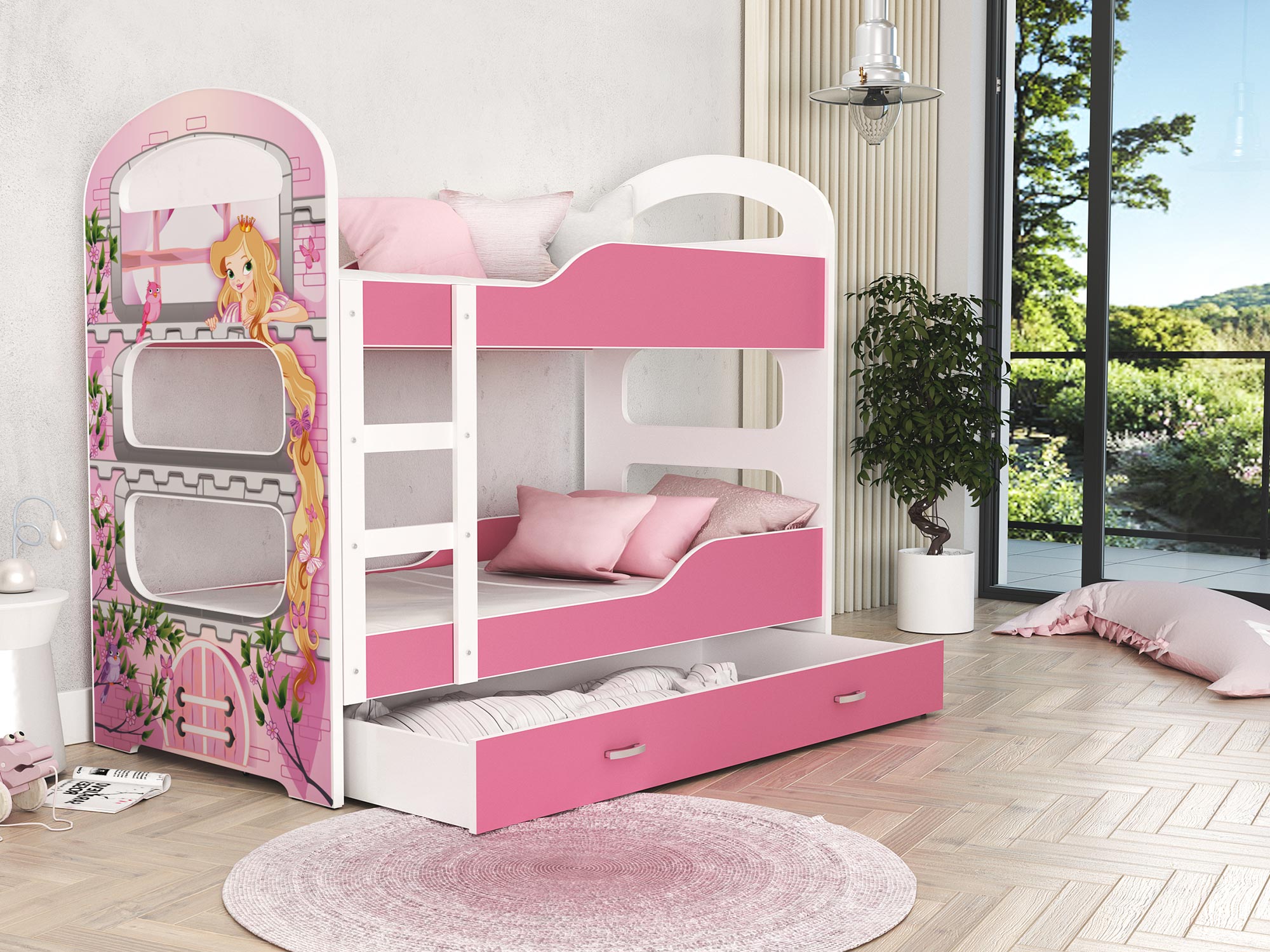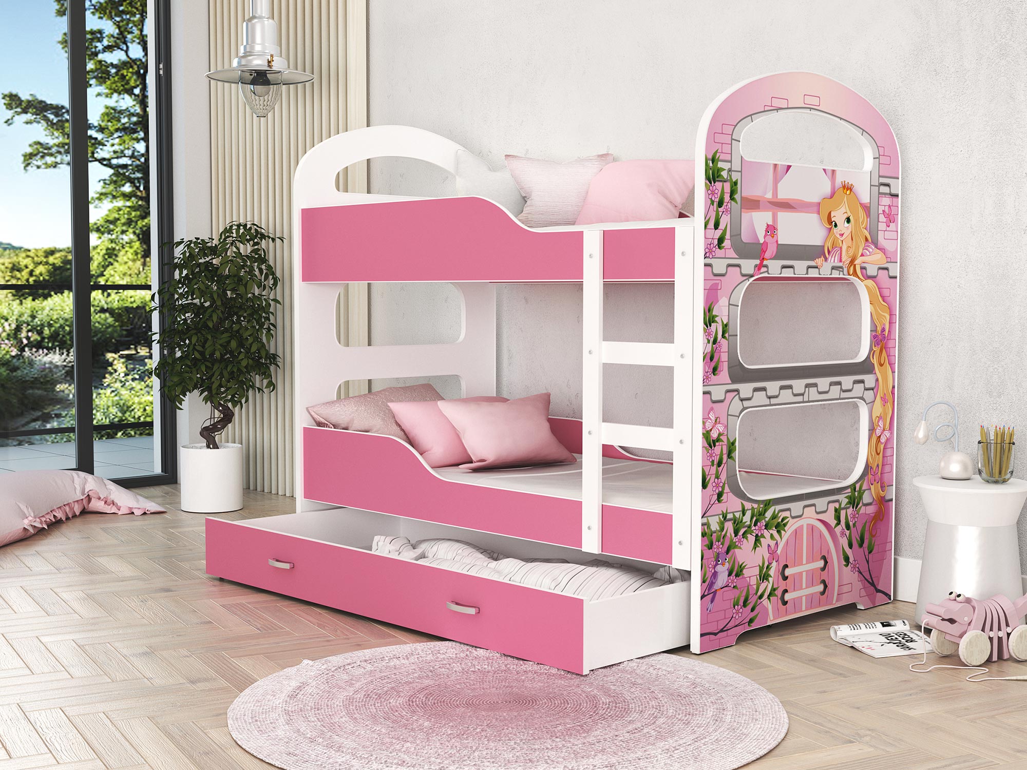 Przede wszystkim piętrowe łóżka dla dzieci z nadrukiem FIROME posiada wytrzymałą i trwałą konstrukcję. Ponadto mebel wykonano z najwyższej klasy płyty MDF, wyposażony w pojemną wysuwaną na kółkach szufladę do przechowywania pościeli, drabinkę ułatwiającą wejście na piętro łóżka oraz barierki ochronne.