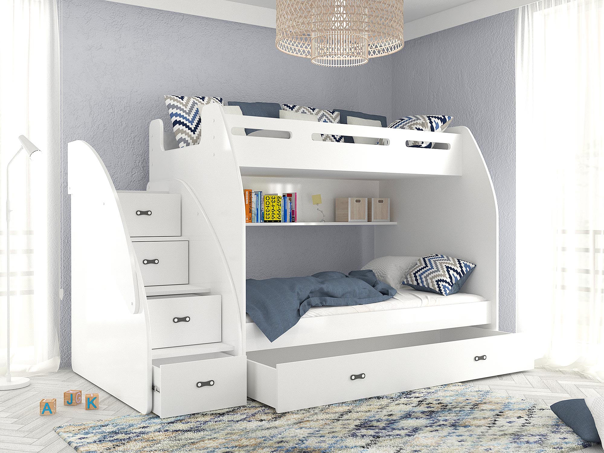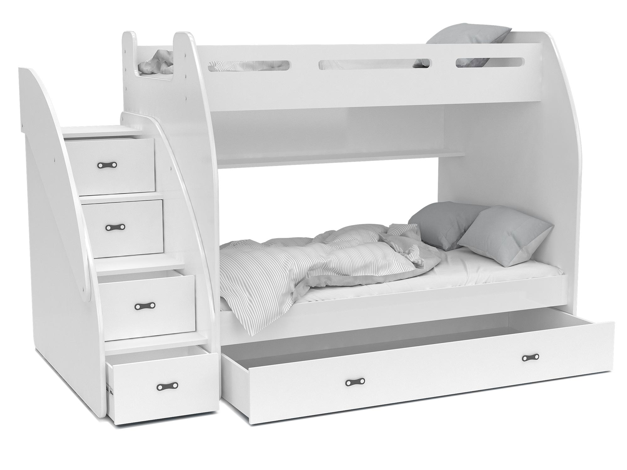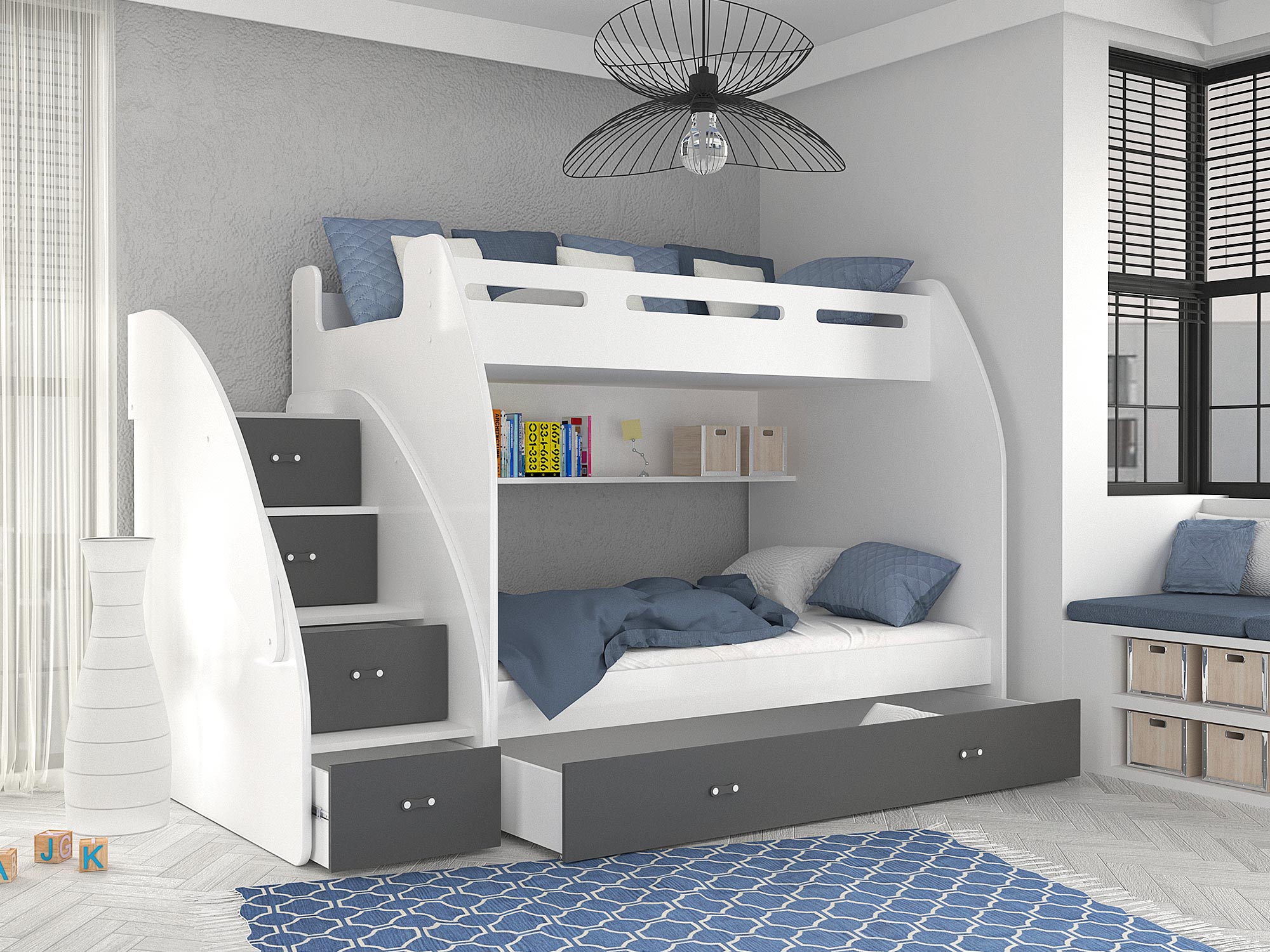 Łóżko piętrowe ze schodami biało szare aranż ROKO