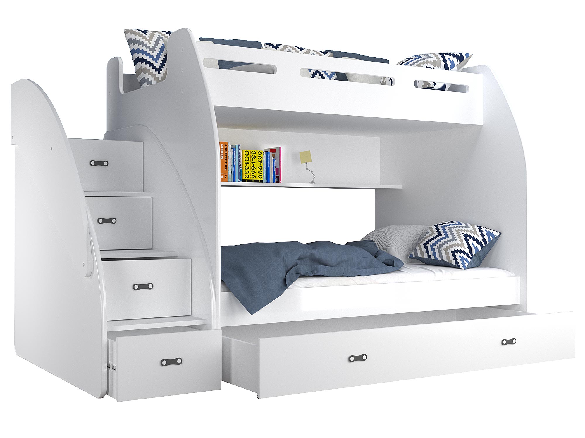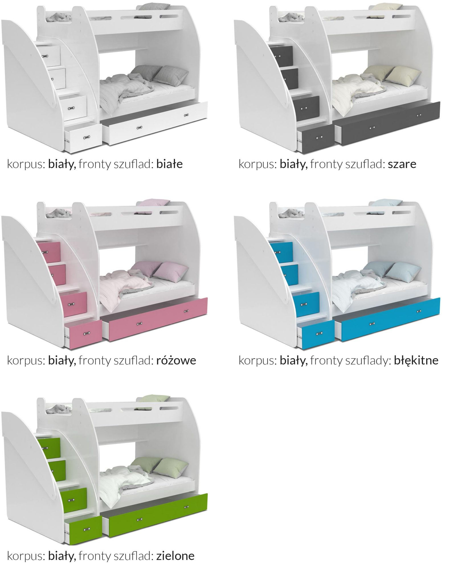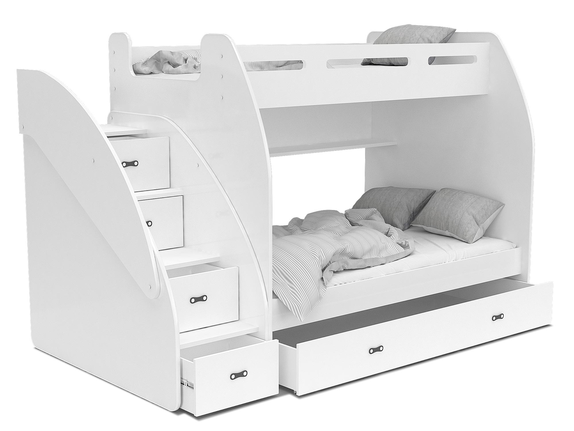 Łóżko piętrowe ze schodami biało szare aranż ROKO
