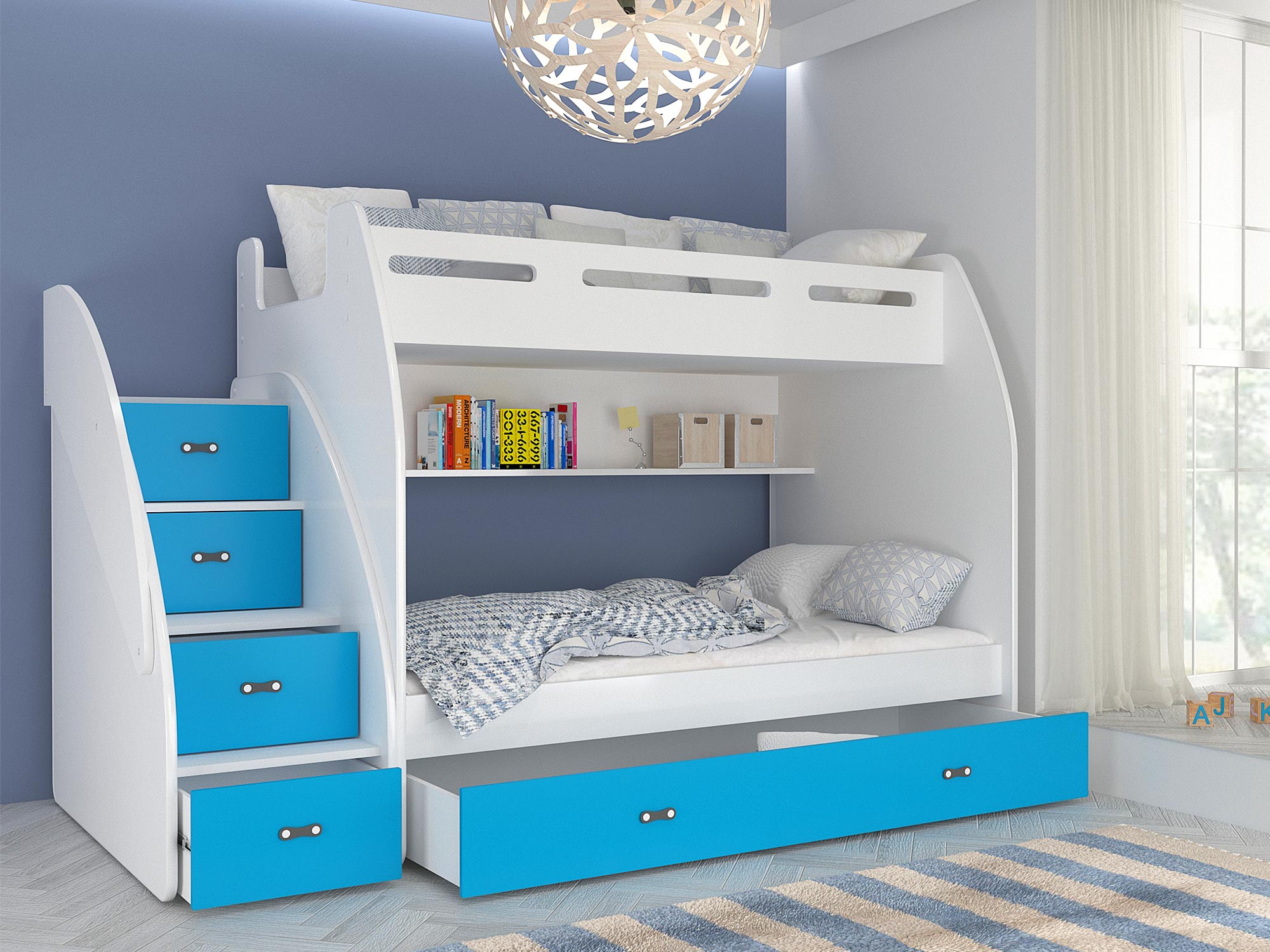 Przedstawione na zdjęciu po lewej łóżko piętrowe dla dzieci ROKO to doskonała metoda na zdobycie cennego miejsca w mieszkaniu czy domu, które nie mają dużego metrażu a każdy obszar jest bardzo cenny. Produkt spaja nowoczesność i praktyczność a do tego wspaniale się wizualizuje, jest komfortowy i zabiera stosunkowo mało miejsca. Ze względu na solidne wykonanie mebel wytrzyma każde dziecięce zabawy oraz na pewno posłuży długi okres czasu. Nasze produkty można dopasować do panującej stylizacji dlatego że są dostępne w różnych kolorach, które są trwałe i nie blakną z upływem czasu. Gwarancja obejmująca okres dwóch lat to kolejną zaletę produktu.