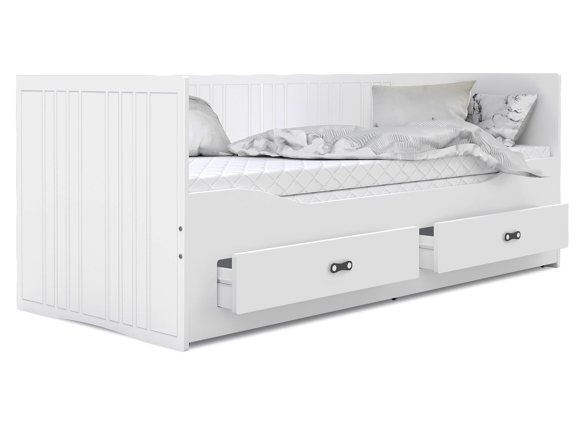 Białe łóżko rozkładane dla dziecka z szufladami rozłożone białe tło PEGASUS