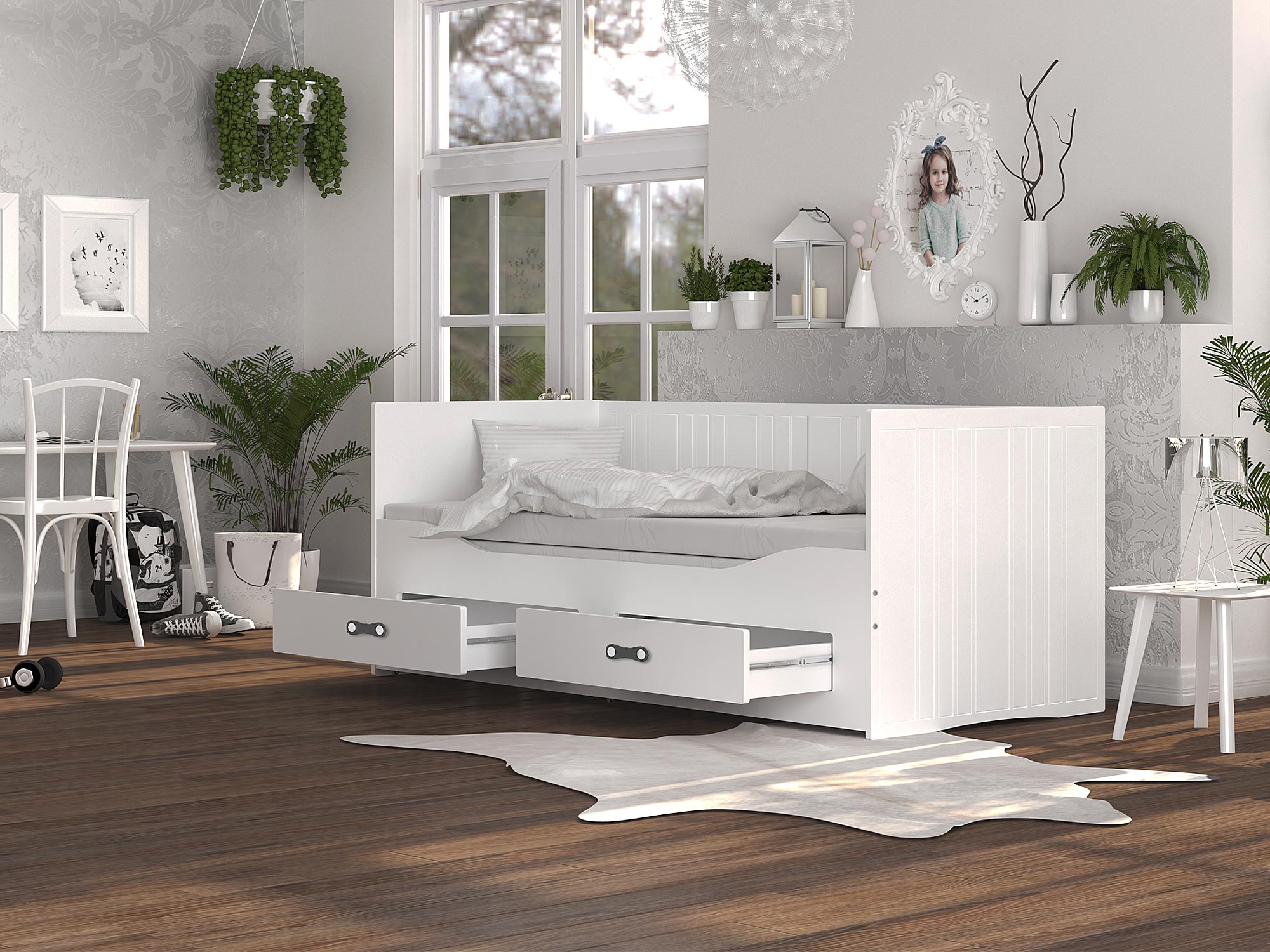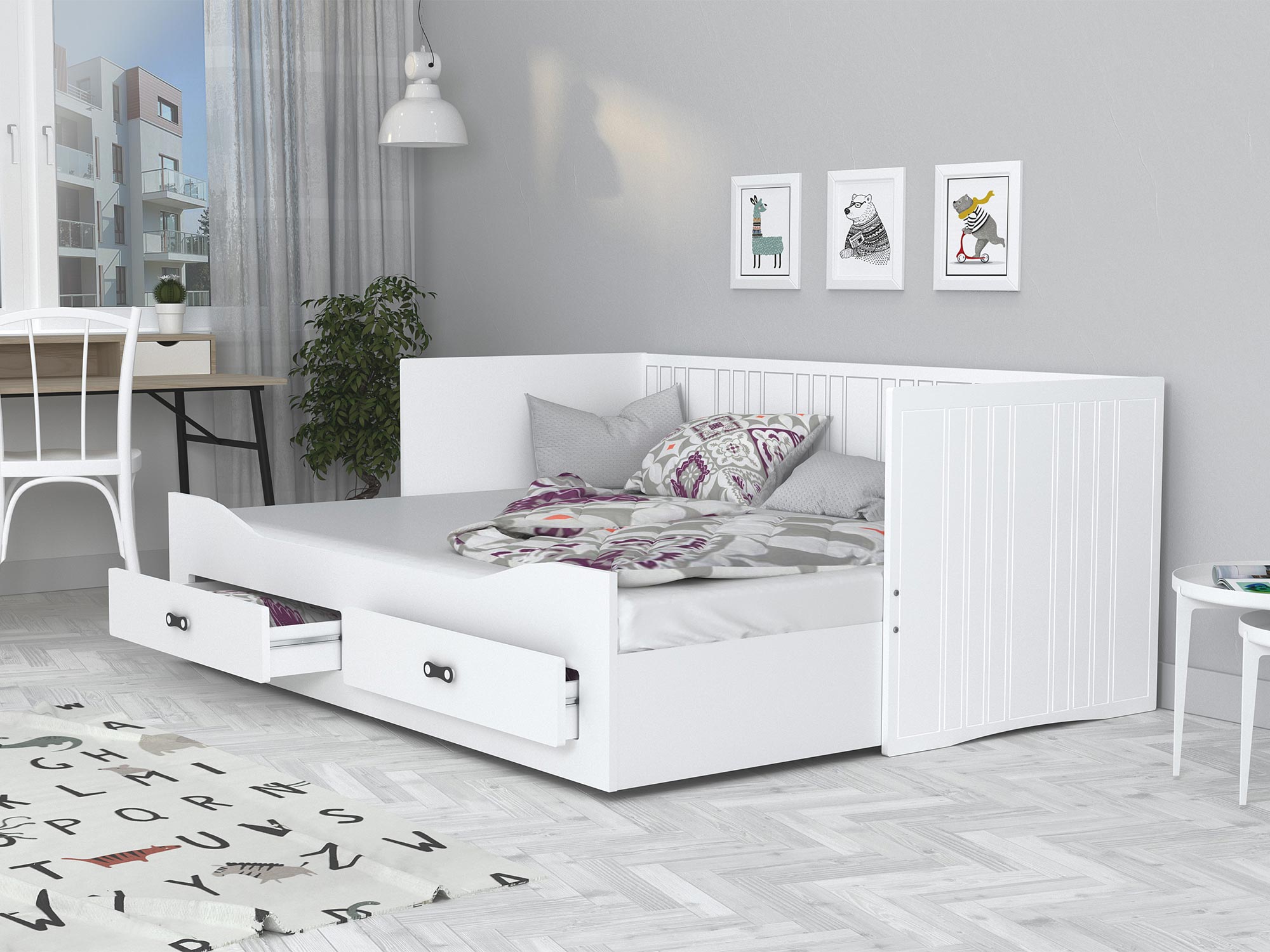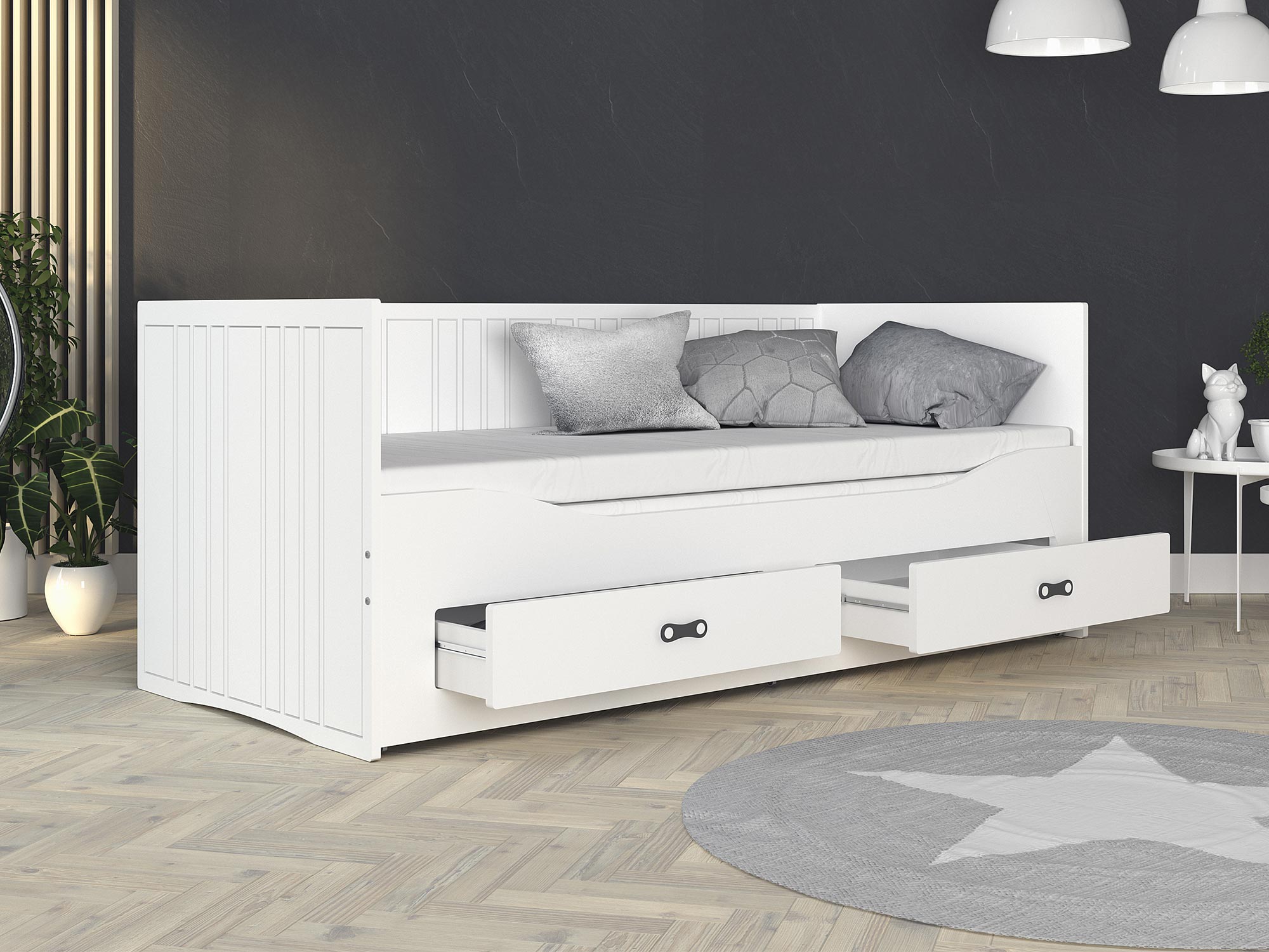 Białe łóżko rozkładane dla dziecka z szufladami rozłożone aranżacja PEGASUS