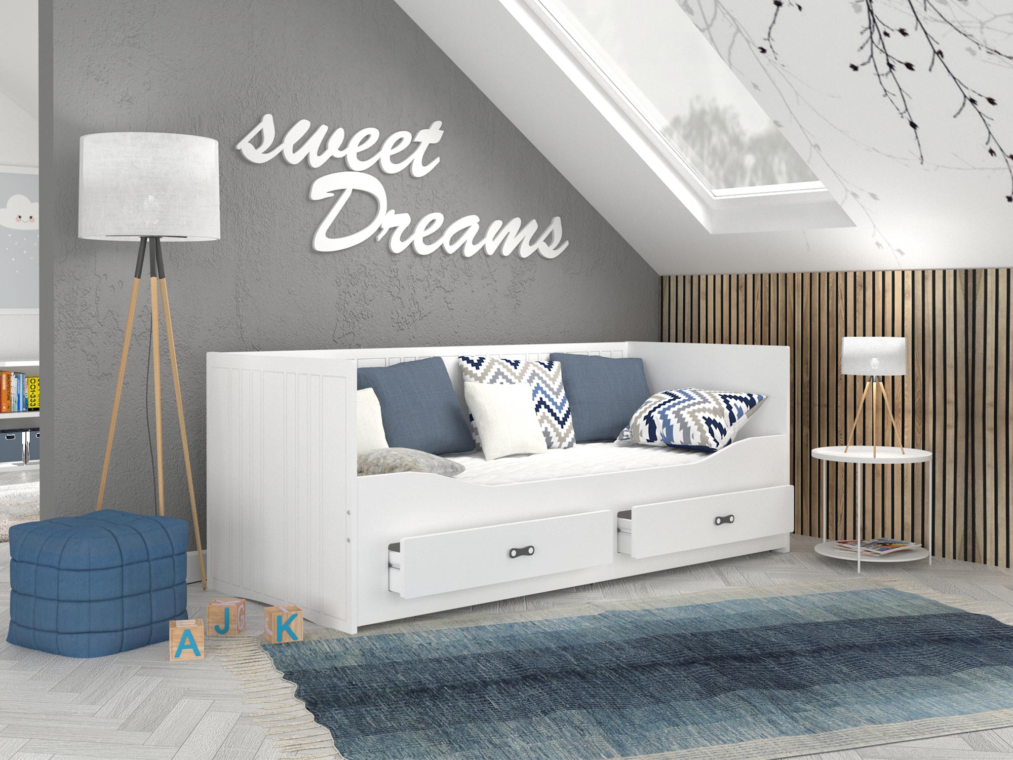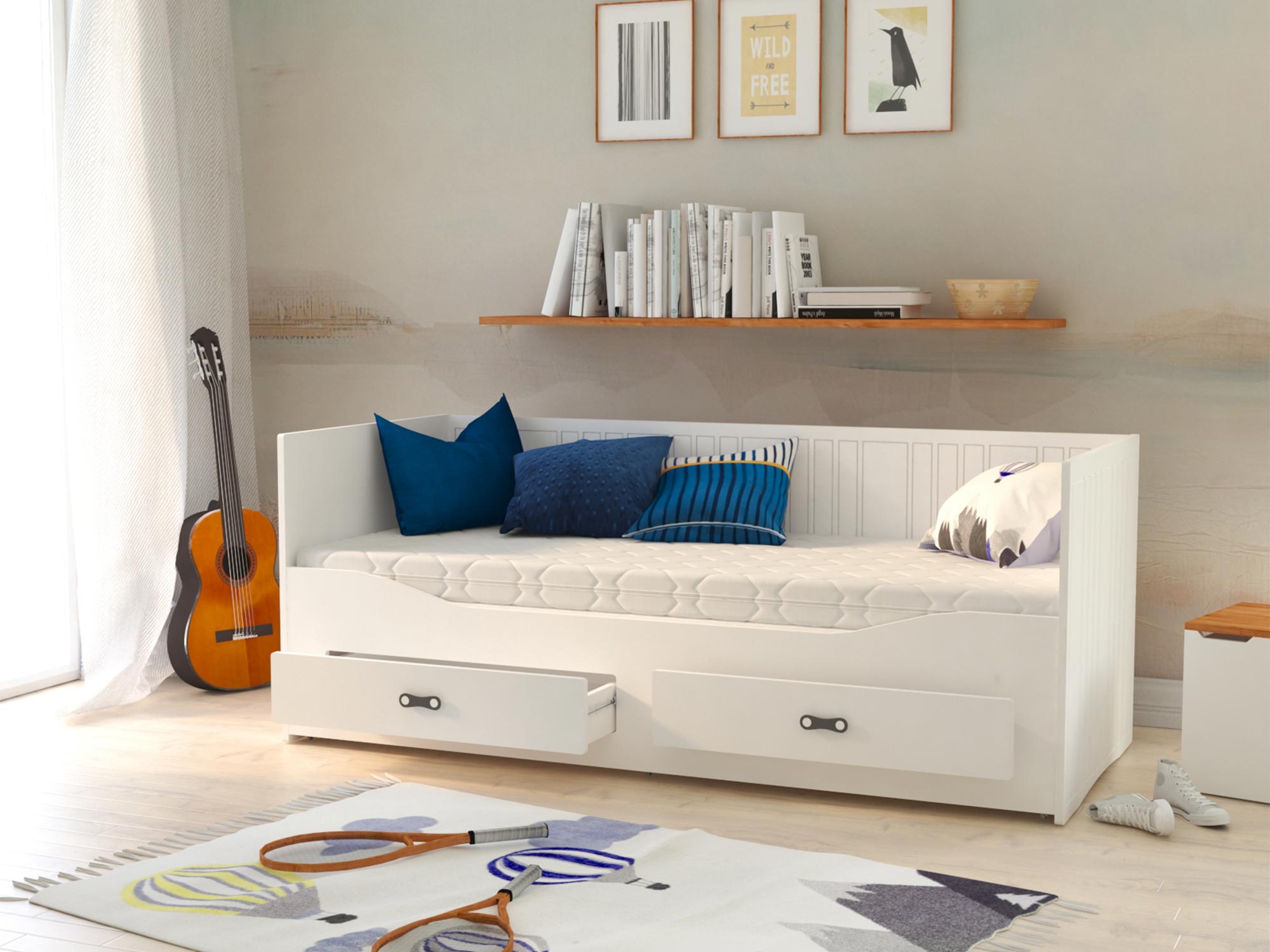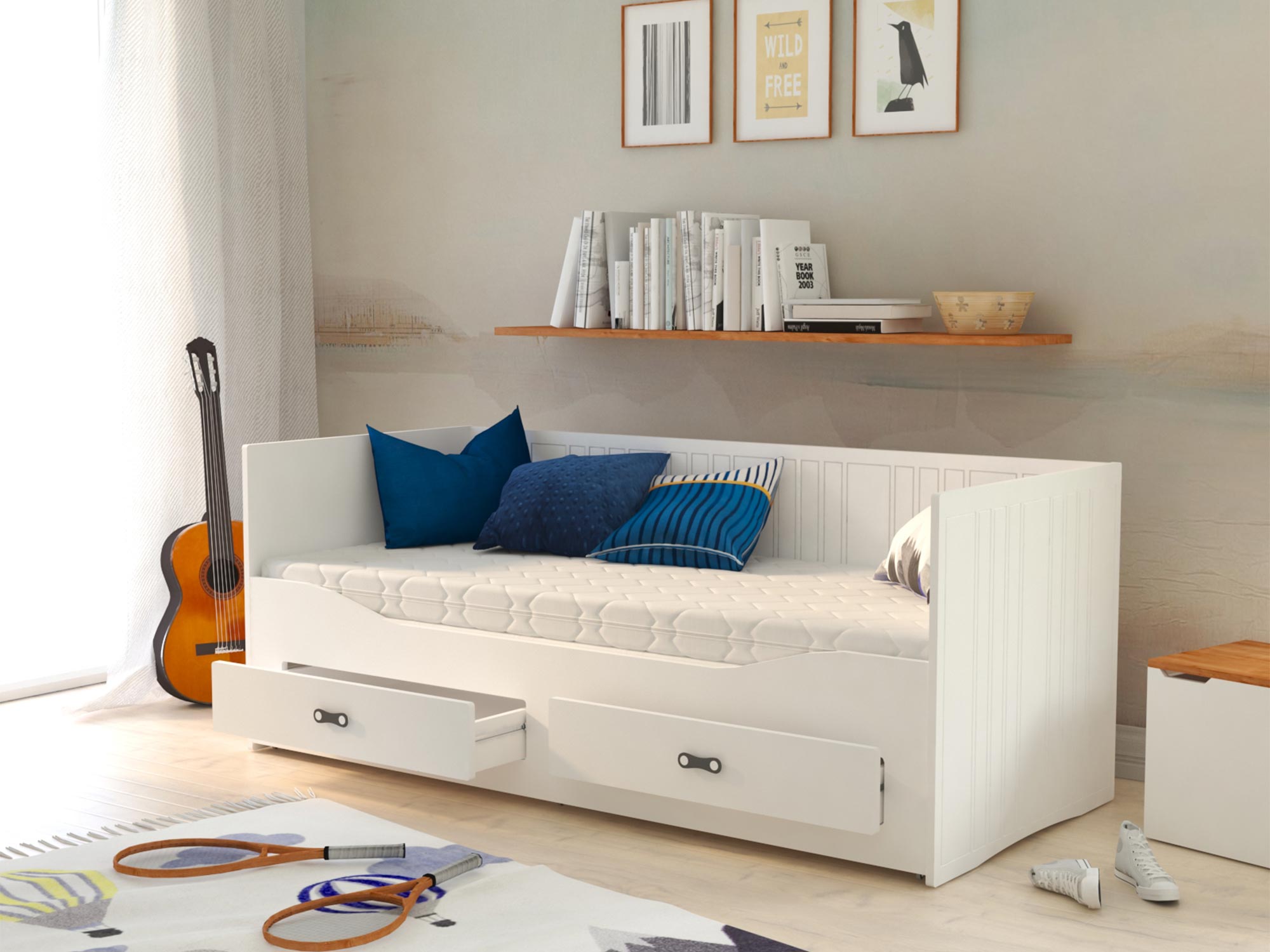 Białe łóżko rozkładane dla dziecka z szufladami rozłożone aranżacja PEGASUS