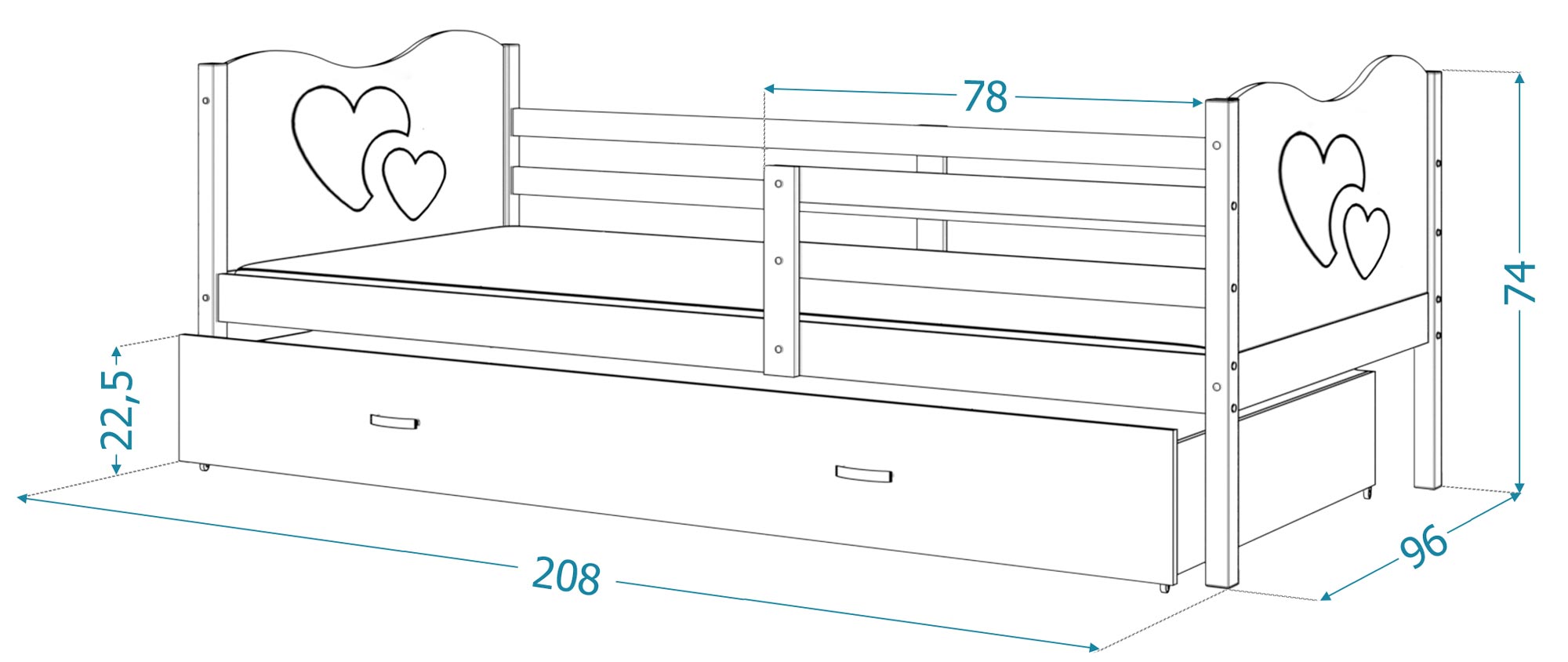Przede wszystkim łóżko z barierką dla dziecka CUBI P to produkt, który charakteryzuje się wygodą, bezpiecznym użytkowaniem i oryginalnym wyglądem. Ponadto wytrzymała i mocna struktura gwarantują odporność łóżka, a także jego trwałość. Co najważniejsze mebel wykonano z wysokogatunkowej płyty meblowej z zaokrąglonymi krawędziami i wyprofilowanymi ściankami, które mają za zadanie zapewnić bezpieczeństwo śpiącym dzieciom. W celu zwiększenia bezpieczeństwa korzystania z produktu został on pomalowany bezwonnym wodnym lakierem przeznaczonym do produktów dziecięcych. Łóżko wyposażono w stelaż flex zrobiony z sprężynujących listw osadzonych w plastikowych kieszonkach, który zapewnia właściwą amortyzację materaca wraz z ciałem dziecka. W opcji jest też piankowy materac w pokrowcu o grubości 7 cm. Przez wzgląd na różnorodność charakterów i wykończeń w jakich zorganizowano dziecięce sypialnie nasze produkty są dostępne w kilku wybarwieniach i wzorach do wyboru. Dodatkowo do łóżka dołączono zestaw przeznaczony do montażu, który jest łatwy i szybki, jak również instrukcja.