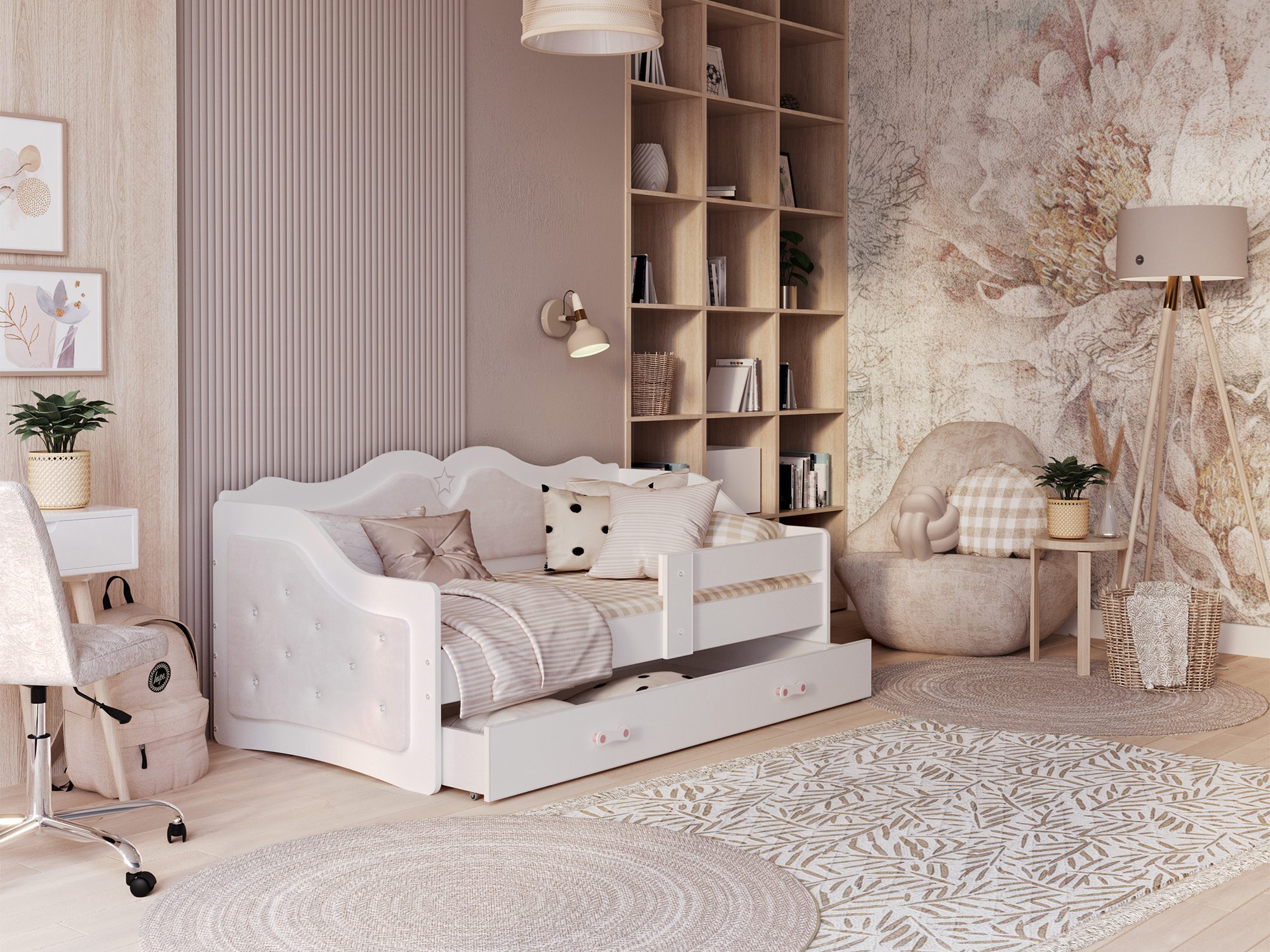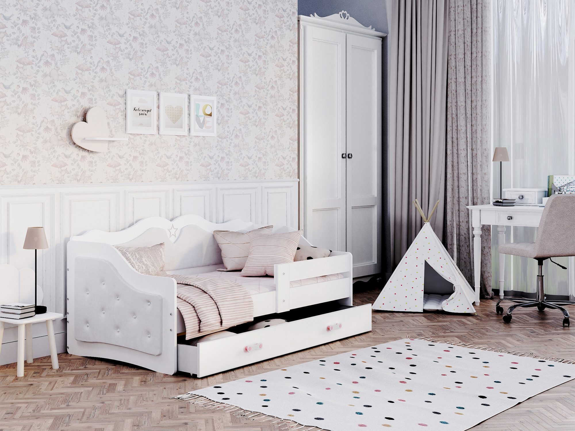 Łóżko Emi to również bogata paleta kolorystyczna – dostępne barwy pozwalają dopasować mebel do wystroju pokoju dziewczynki lub chłopca, tworząc przestrzeń przyjazną i estetyczną. Tapicerowane detale dodają wnętrzu elegancji i sprawiają, że łóżko staje się ozdobą całego pomieszczenia.