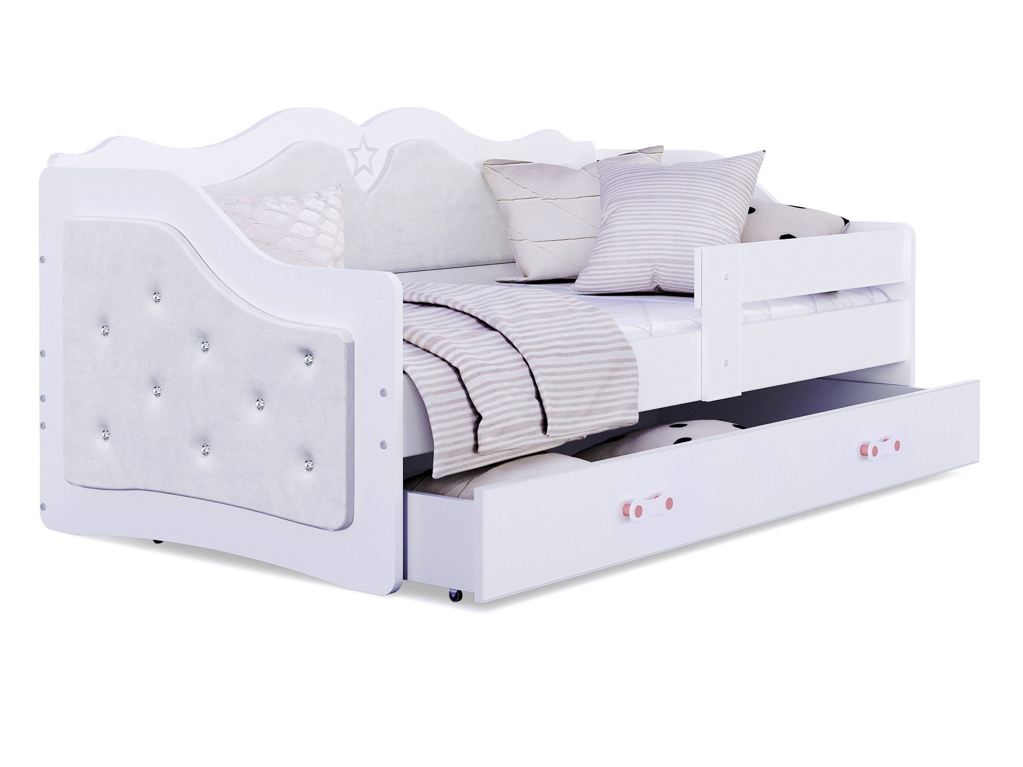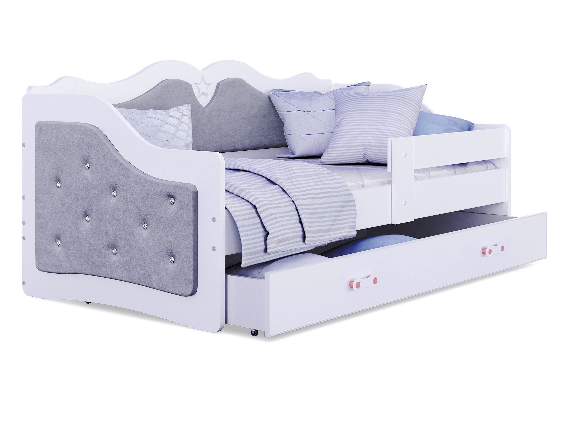 Łóżko Emi zostało stworzone z myślą o najmłodszych użytkownikach – dzieciach w wieku od 5 do 9 lat, a dzięki solidnej konstrukcji sprawdzi się również dla starszych pociech. Tapicerowane elementy nadają mu eleganckiego wyglądu i przytulnego charakteru. Co więcej, rodzice mogą wybrać wariant gładki, zdobiony guzikiem tapicerskim lub eleganckim kryształkiem, co pozwala idealnie dopasować mebel do aranżacji pokoju dziecka.