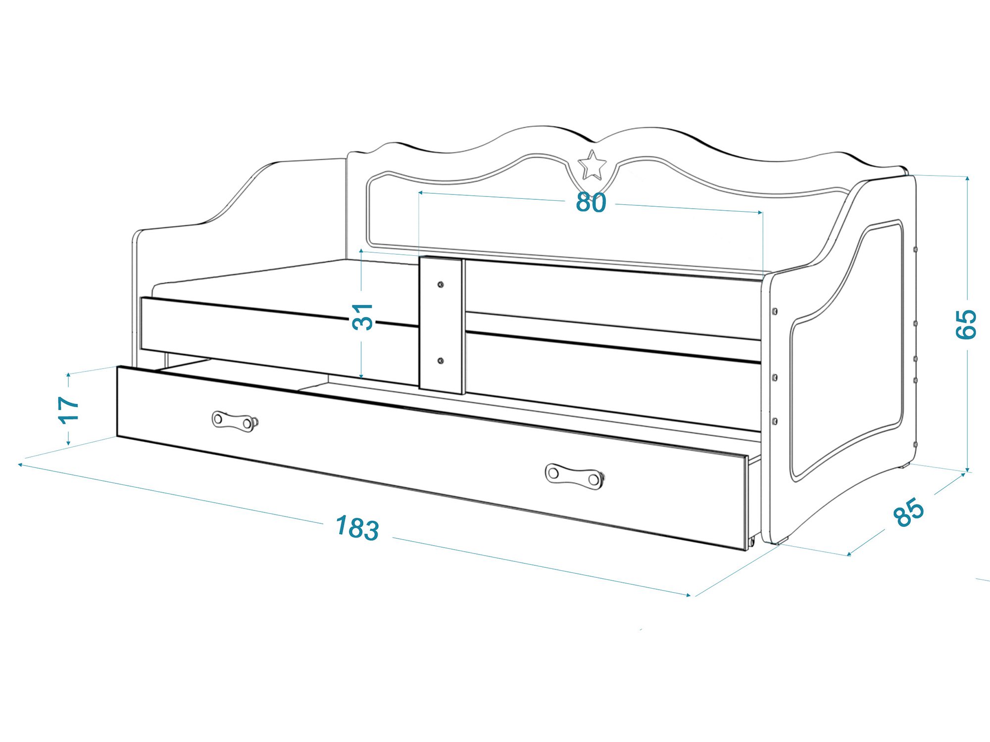 - Funkcjonalna szuflada – dodatkowa przestrzeń na pościel, zabawki czy ubrania.