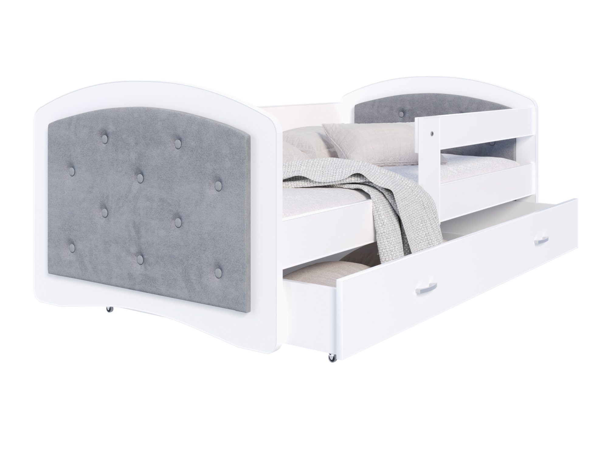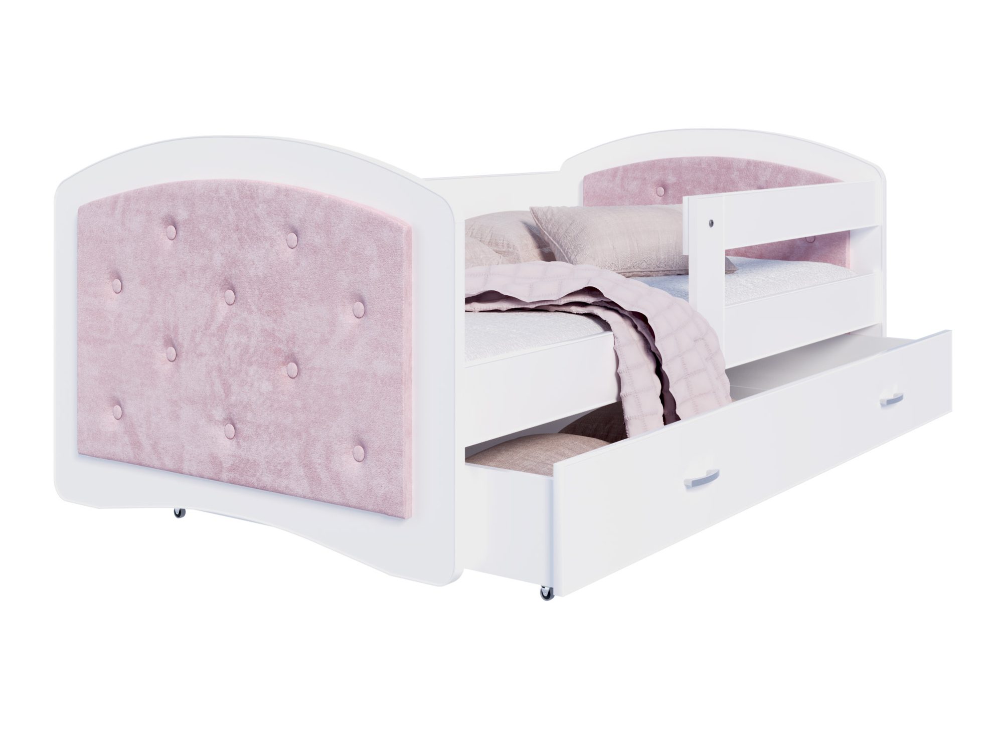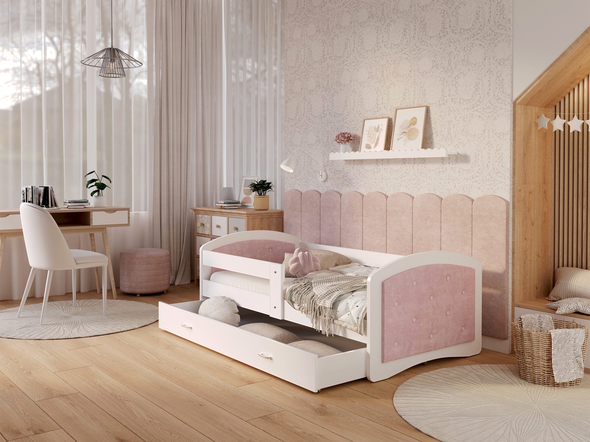 Łóżko Mia to jednak nie tylko estetyka. Ważną częścią jego konstrukcji jest praktyczna szuflada na kółkach, umieszczona pod ramą. To doskonałe rozwiązanie do przechowywania pościeli, koców czy zabawek, które pozwala na utrzymanie porządku w pokoju dziecka. Dzięki ergonomicznym uchwytom nawet najmłodsi mogą samodzielnie z niej korzystać.