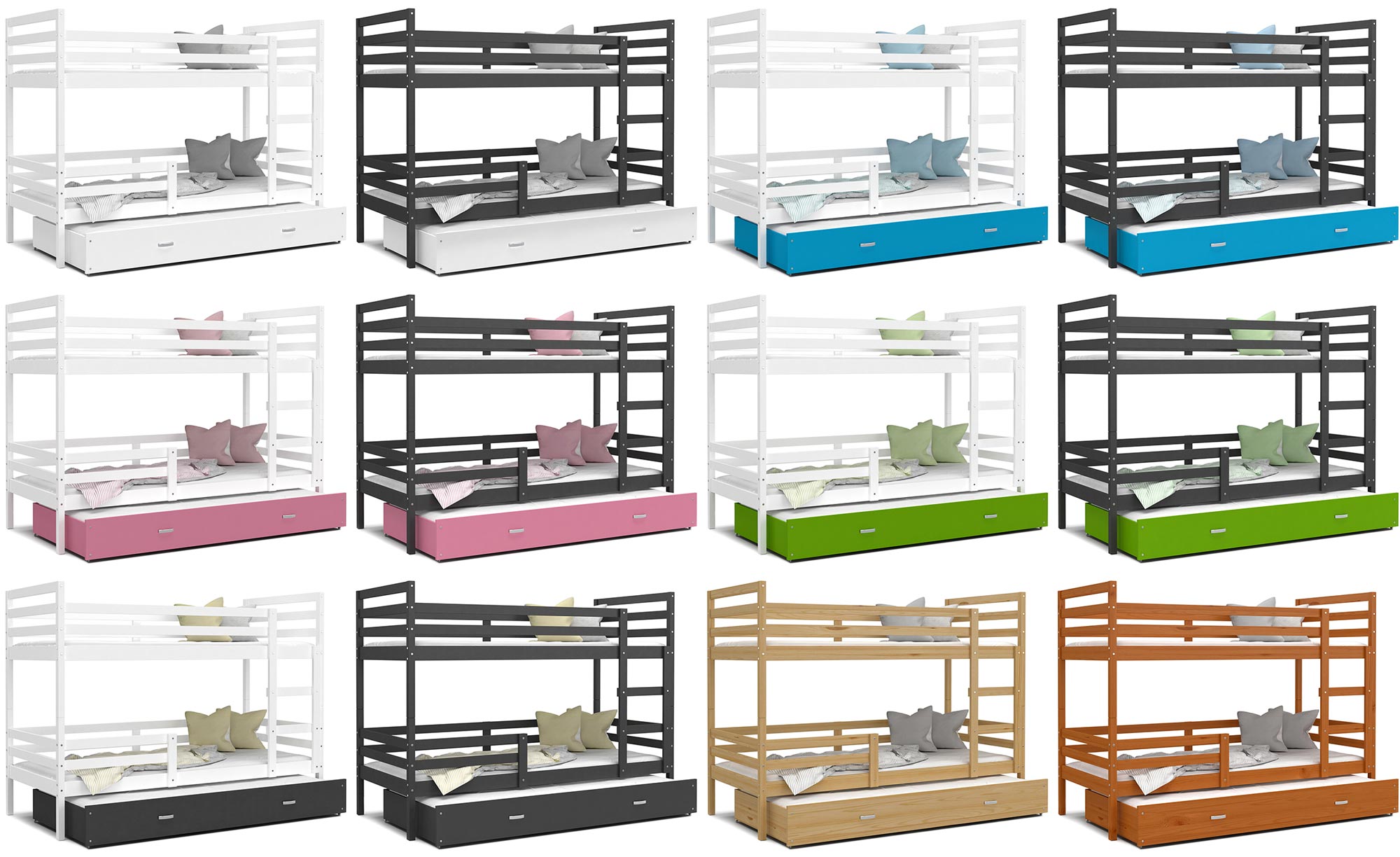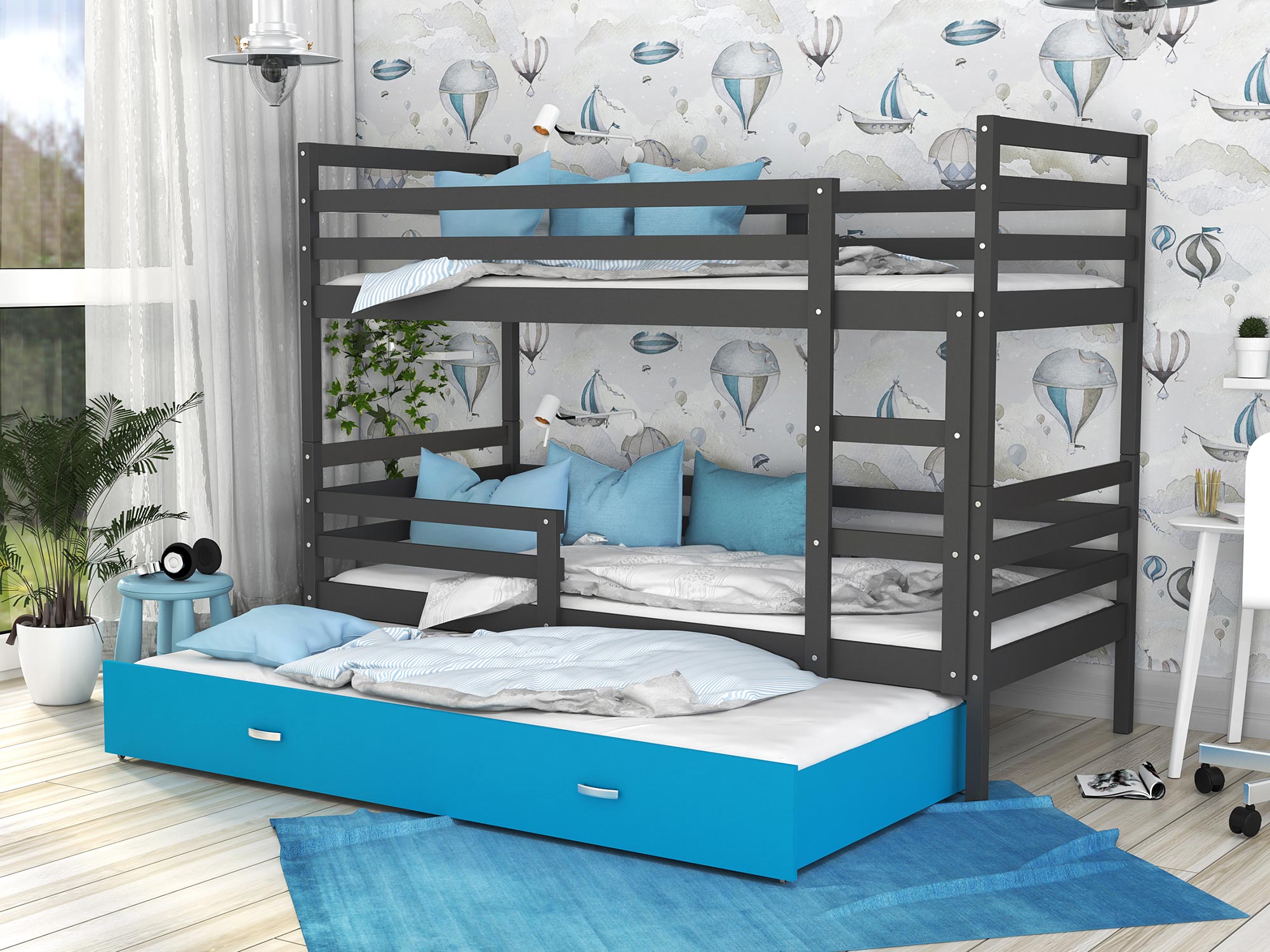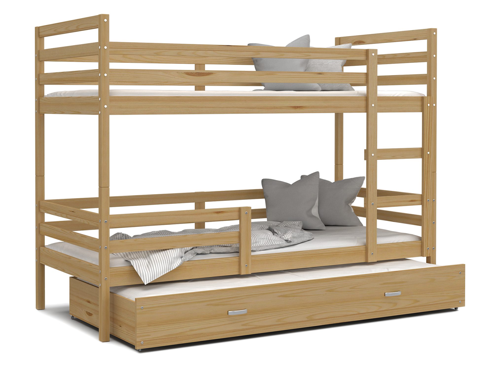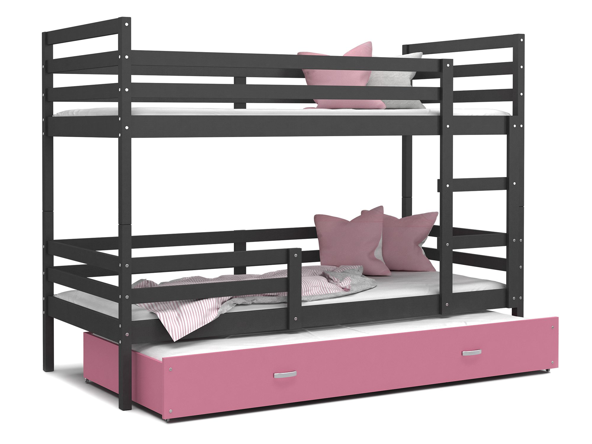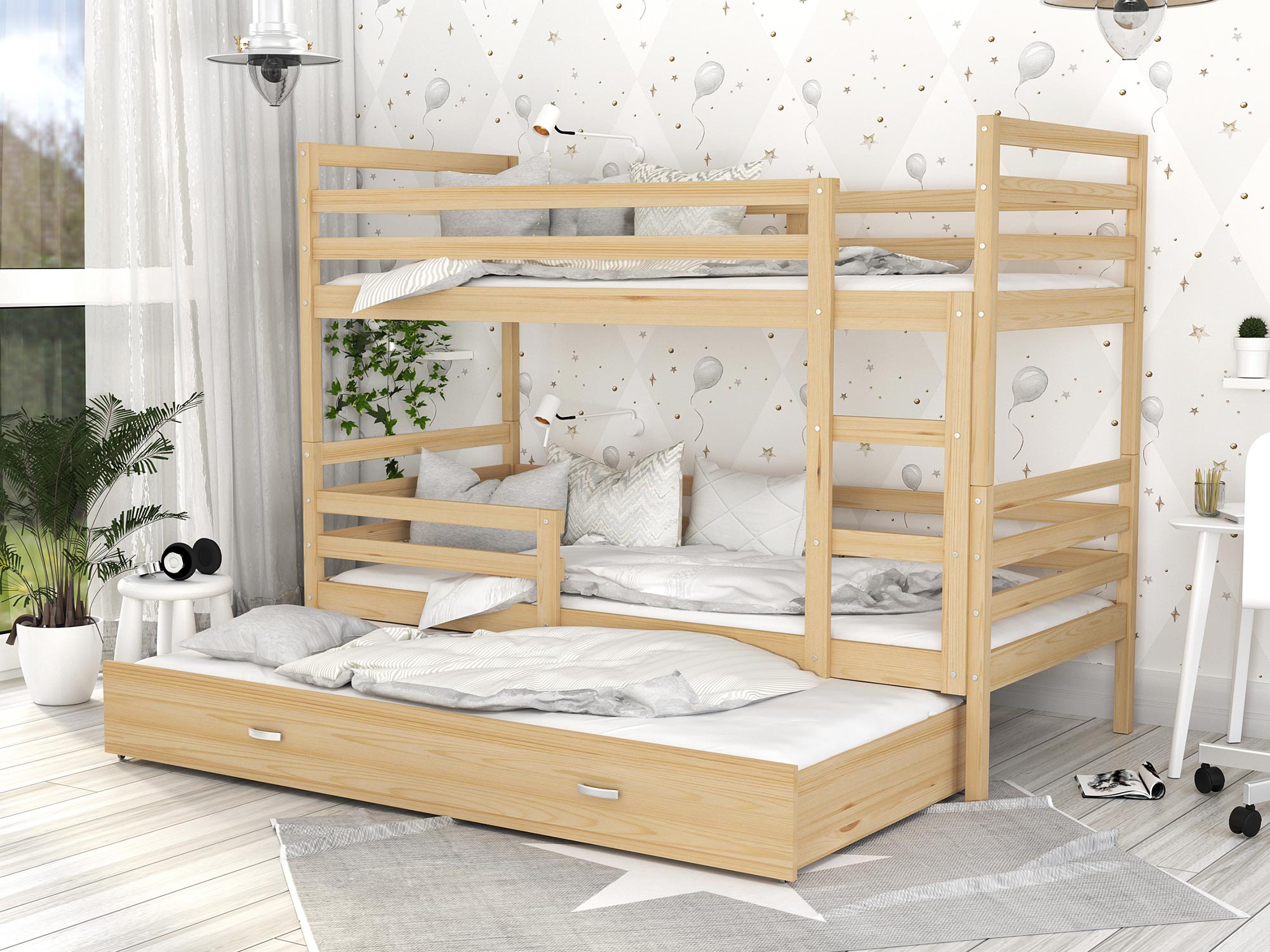 Piętrowe łóżko łóżko trzyosobowe DAVIS 3 to produkt, który charakteryzuje się komfortem, bezpiecznym użytkowaniem i oryginalnym designem. Stabilna i mocna struktura gwarantują solidność łóżka a także jego wytrzymałość. Mebel wyprodukowano z wysokiego gatunku płyty MDF z zaokrąglonymi krawędziami i profilowanymi bokami, które mają na celu zagwarantować bezpieczeństwo śpiącym dzieciom. Łóżko posiada pakową wysuwaną na kółkach szufladę dedykowaną do przechowywania pościeli, drabinkę ułatwiającą wejście na piętro łóżka oraz barierki ochronne, które zapobiegają wypadnięciu dziecka, a także stelaż flex wykonany z sprężynujących listw osadzonych w plastikowych kieszonkach. W opcji jest też piankowy materac w pokrowcu o grubości 7 cm. Przez wzgląd na rozmaitość charakterów i wykończeń w jakich umeblowano sypialnie dziecięce nasze produkty są dostępne w wielu wybarwieniach do wyboru. Do łóżka został dodany zestaw przeznaczony do montażu jak również instrukcja.