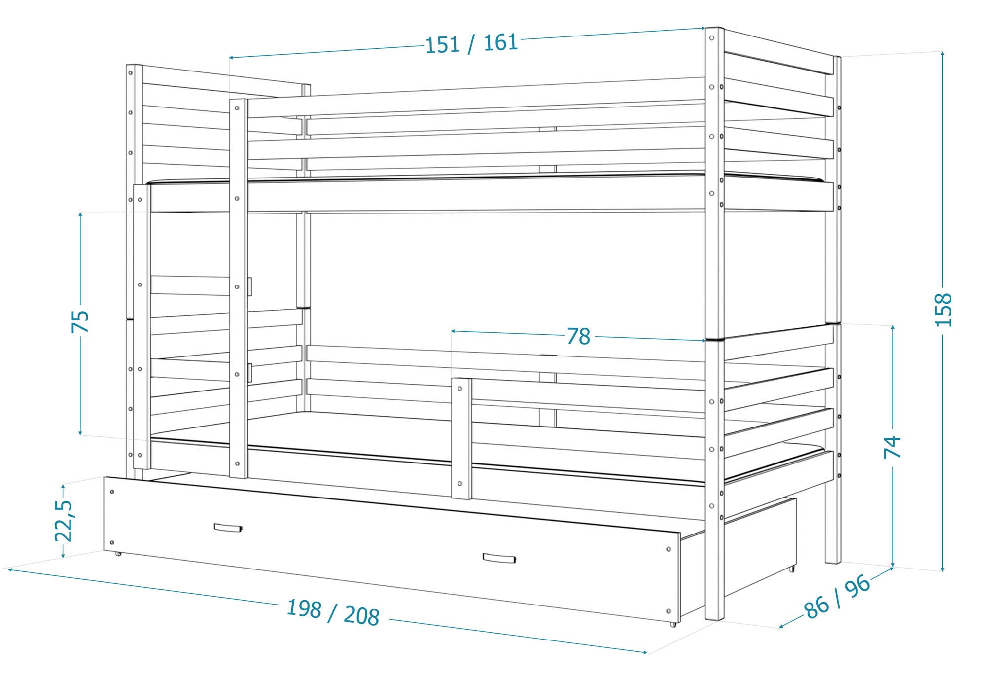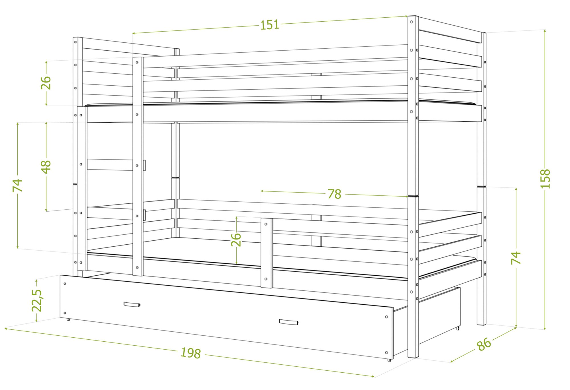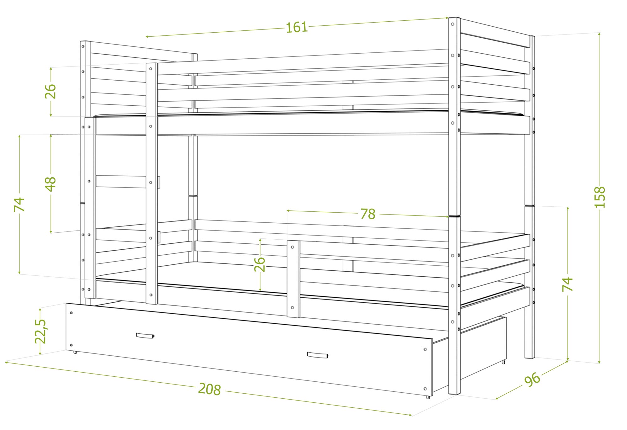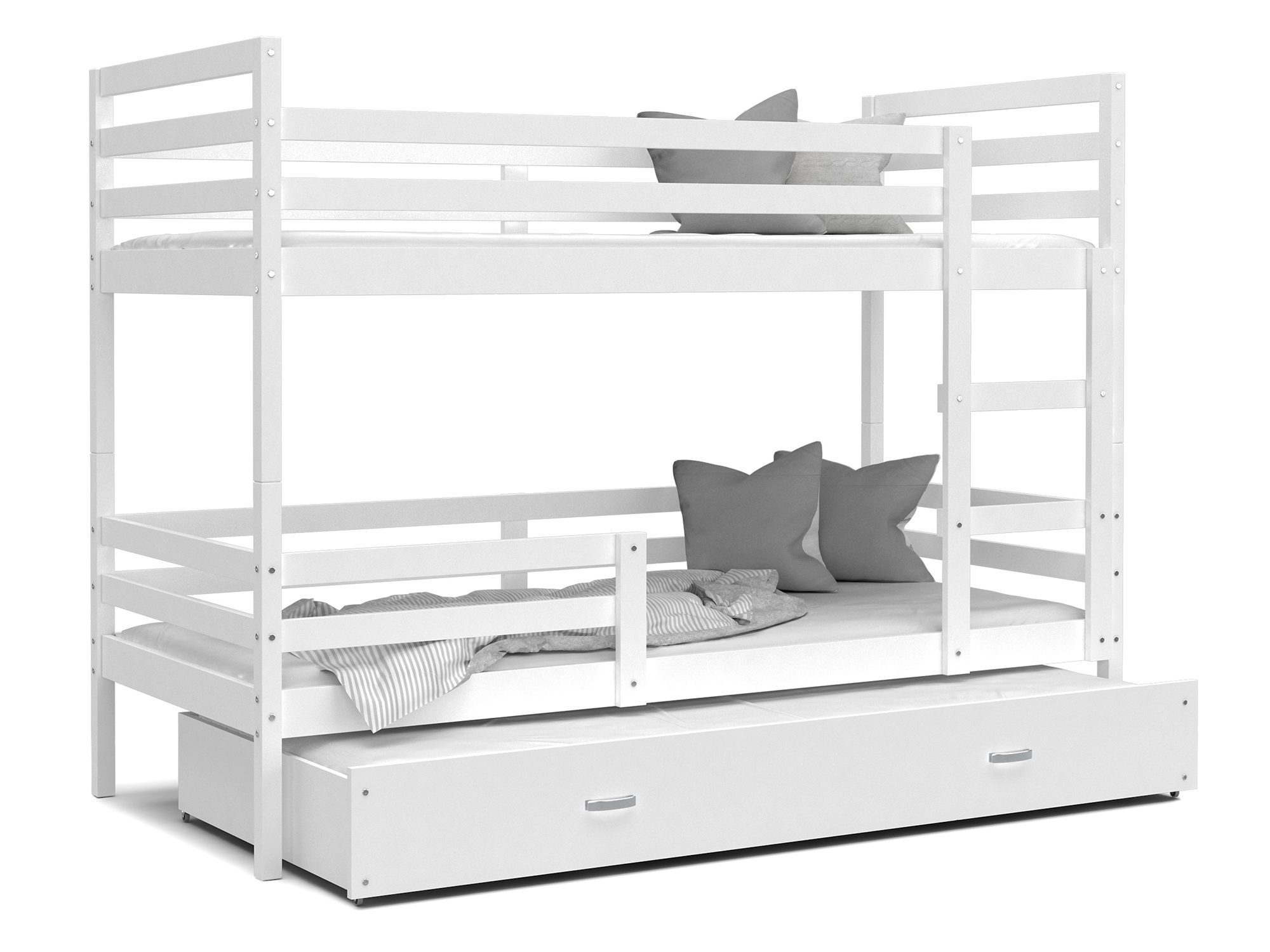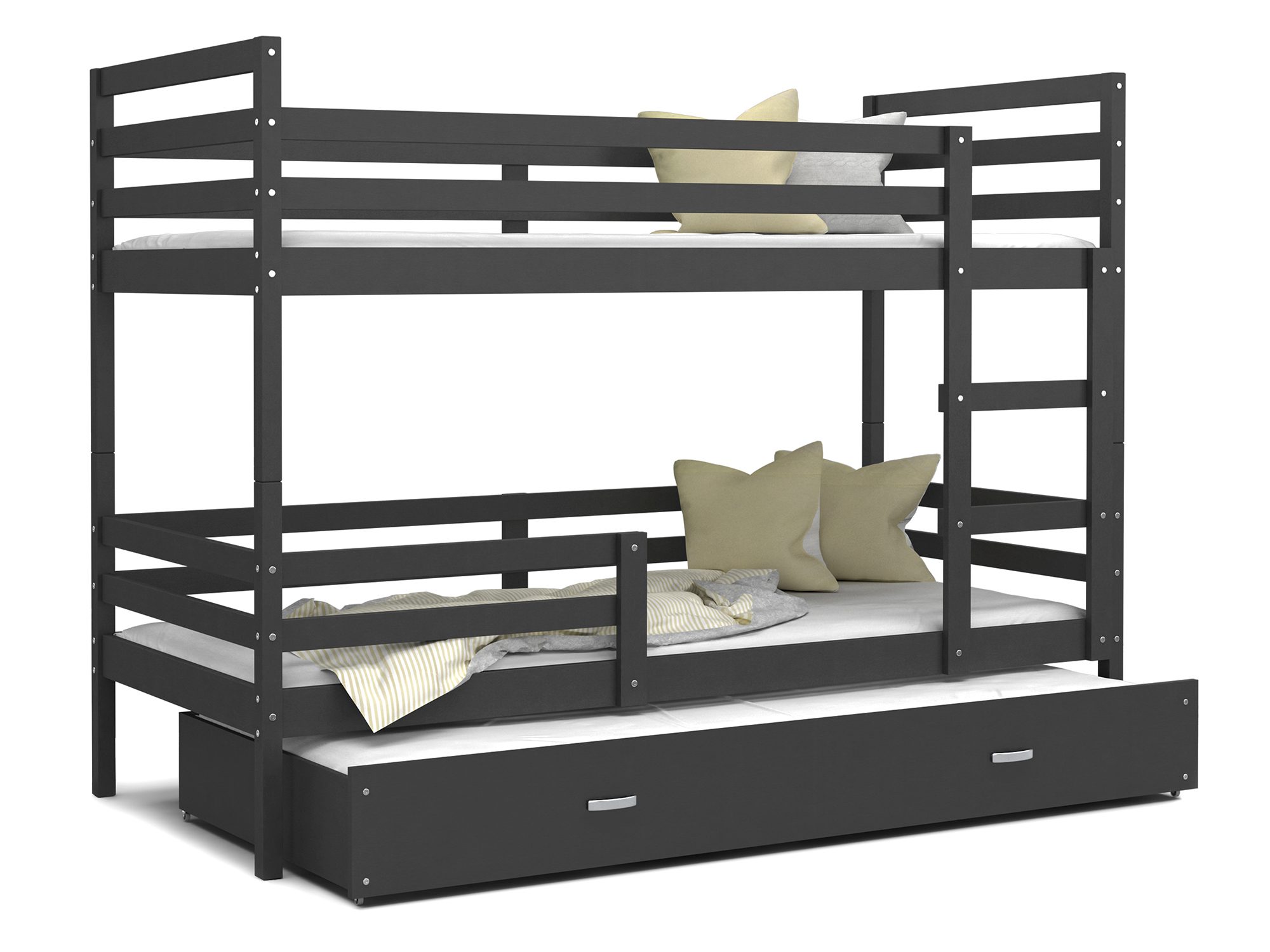 Piętrowe łóżko łóżko trzyosobowe DAVIS 3 to produkt, który charakteryzuje się komfortem, bezpiecznym użytkowaniem i oryginalnym designem. Stabilna i mocna struktura gwarantują solidność łóżka a także jego wytrzymałość. Mebel wyprodukowano z wysokiego gatunku płyty MDF z zaokrąglonymi krawędziami i profilowanymi bokami, które mają na celu zagwarantować bezpieczeństwo śpiącym dzieciom. Łóżko posiada pakową wysuwaną na kółkach szufladę dedykowaną do przechowywania pościeli, drabinkę ułatwiającą wejście na piętro łóżka oraz barierki ochronne, które zapobiegają wypadnięciu dziecka, a także stelaż flex wykonany z sprężynujących listw osadzonych w plastikowych kieszonkach. W opcji jest też piankowy materac w pokrowcu o grubości 7 cm. Przez wzgląd na rozmaitość charakterów i wykończeń w jakich umeblowano sypialnie dziecięce nasze produkty są dostępne w wielu wybarwieniach do wyboru. Do łóżka został dodany zestaw przeznaczony do montażu jak również instrukcja.