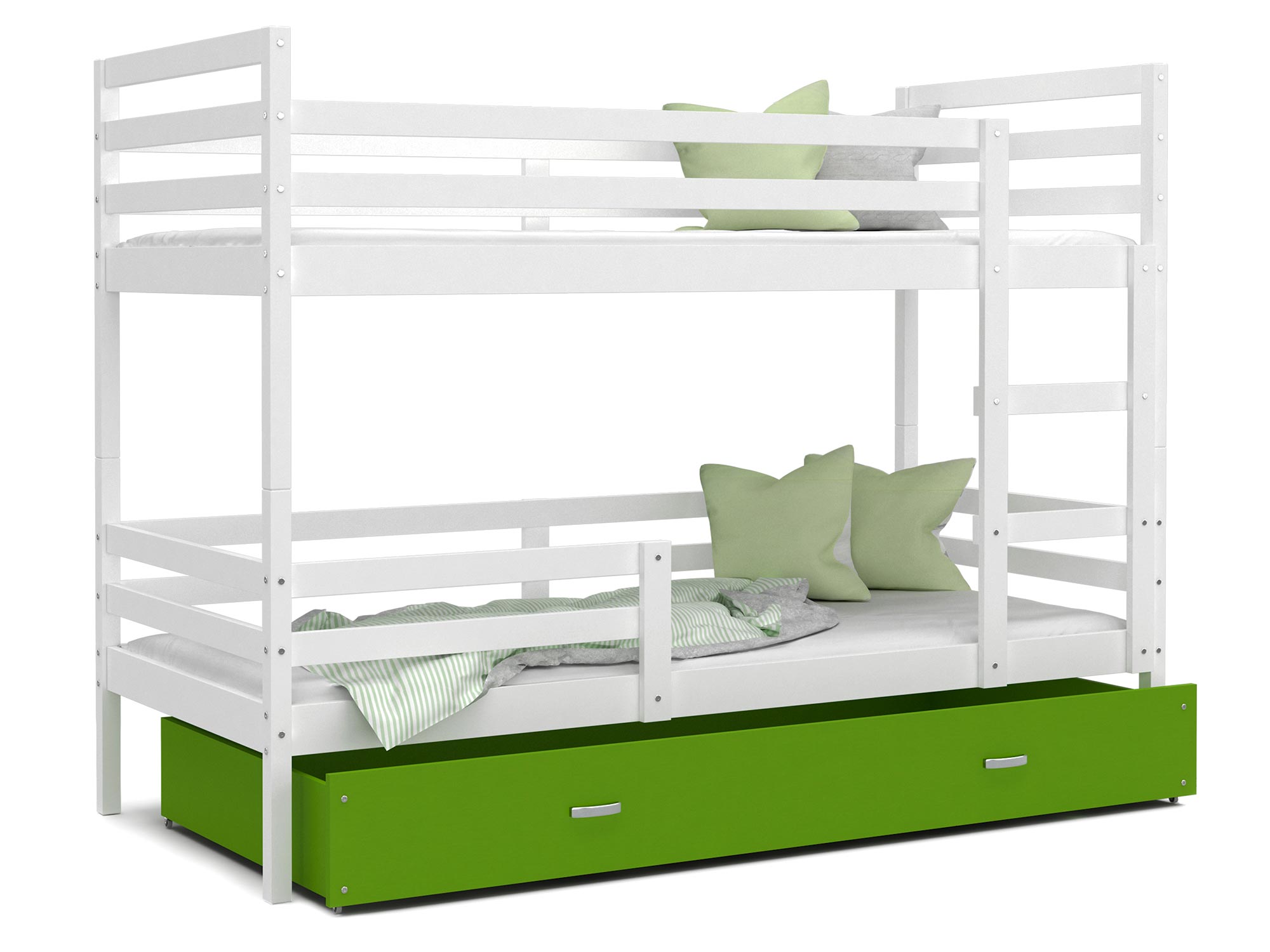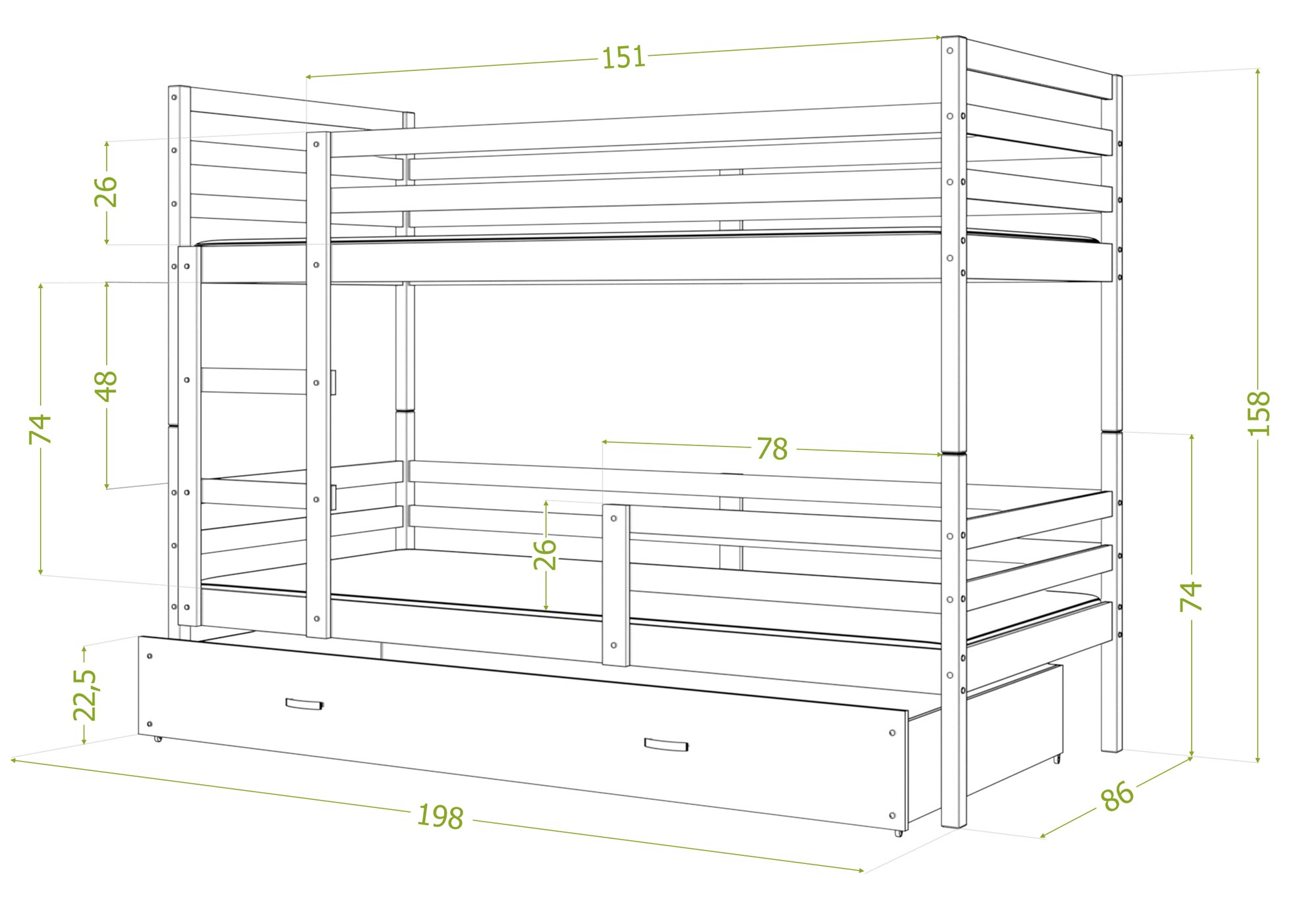 Piętrowe łóżko dziecięce DAVIS to mebel, który charakteryzuje się komfortem, bezpieczeństwem użytkowania i oryginalnym designem. Stabilna i trwała konstrukcja gwarantują odporność łóżka a także jego wytrzymałość. Mebel wykonano z najwyższej klasy drewna sosnowego i płyt MDF z zaokrąglonymi krawędziami i wyprofilowanymi ściankami, które mają za zadanie zapewnić bezpieczeństwo śpiącym dzieciom. Łóżko zostało wyposażone w pojemną wysuwaną na kółkach szufladę przeznaczoną do przechowywania pościeli, drabinkę która ułatwia wejście na piętro łóżka oraz barierki ochronne, które zapobiegają wypadnięciu dziecka, a także stelaż flex wykonany z sprężynujących listw osadzonych w plastikowych kieszonkach. W opcji jest też piankowy materac w pokrowcu o grubości 7 cm. Przez wzgląd na różnorodność charakterów i wykończeń w jakich urządzono sypialnie dziecięce nasze produkty są dostępne w wielu wybarwieniach do wyboru. Do łóżka został dodany zestaw przeznaczony do montażu jak również instrukcja.