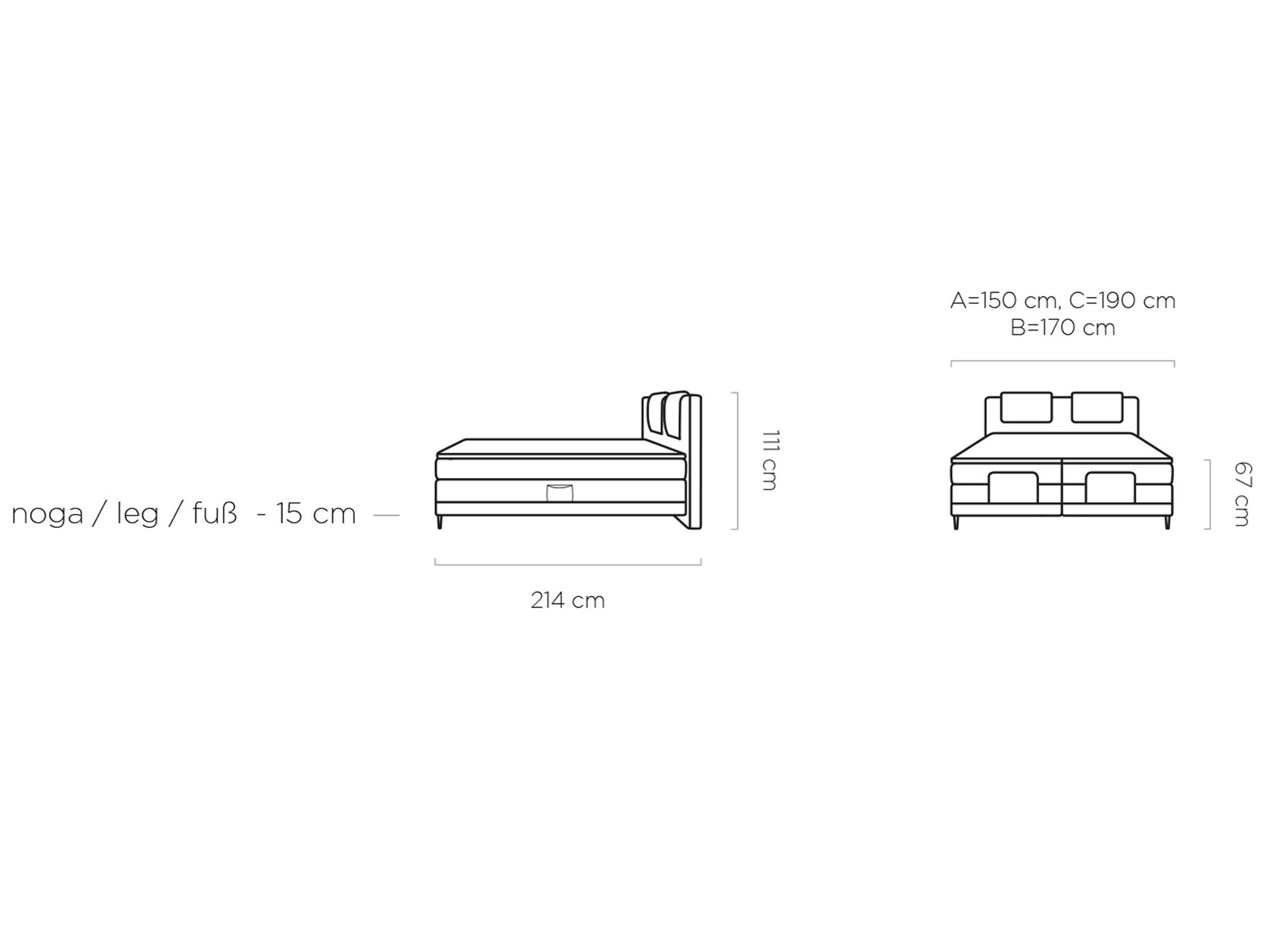 • Powierzchnia spania: A=140×200 cm, B=160×200 cm, C=180×200 cm