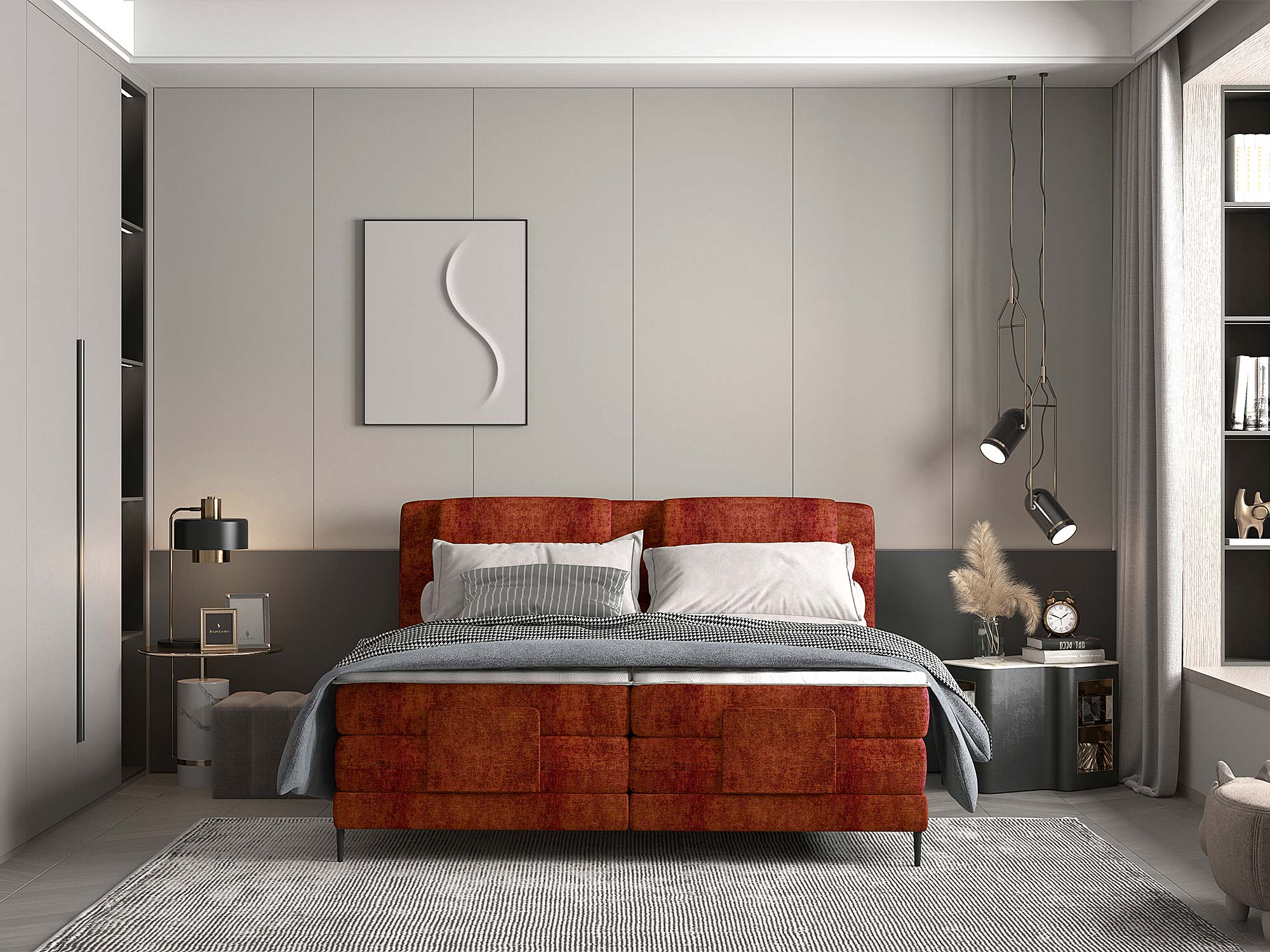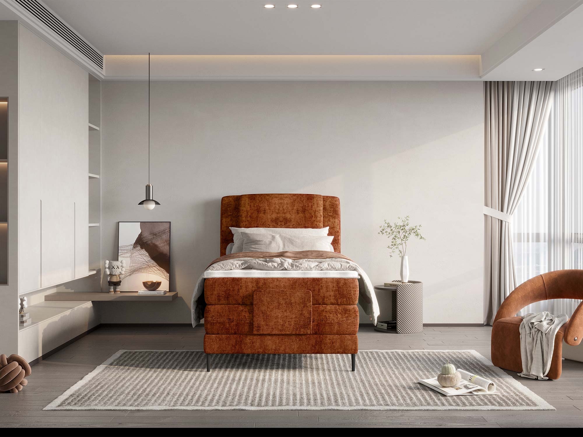 Wyobraź sobie, że jednym dotknięciem pilota unosisz część łóżka, by przeczytać jeszcze jeden rozdział, obejrzeć odcinek ulubionego serialu albo po prostu znaleźć idealny kąt podparcia. WAVE 2026 to łóżko kontynentalne, które zamienia codzienny odpoczynek w zrytualizowaną przyjemność. Smukła, nowoczesna bryła, metalowe czarne nogi (15 cm) i dopracowane detale tworzą spójny, elegancki obraz – a za nim stoi technologia elektrycznej regulacji pozycji spania, dająca pełną kontrolę nad komfortem.