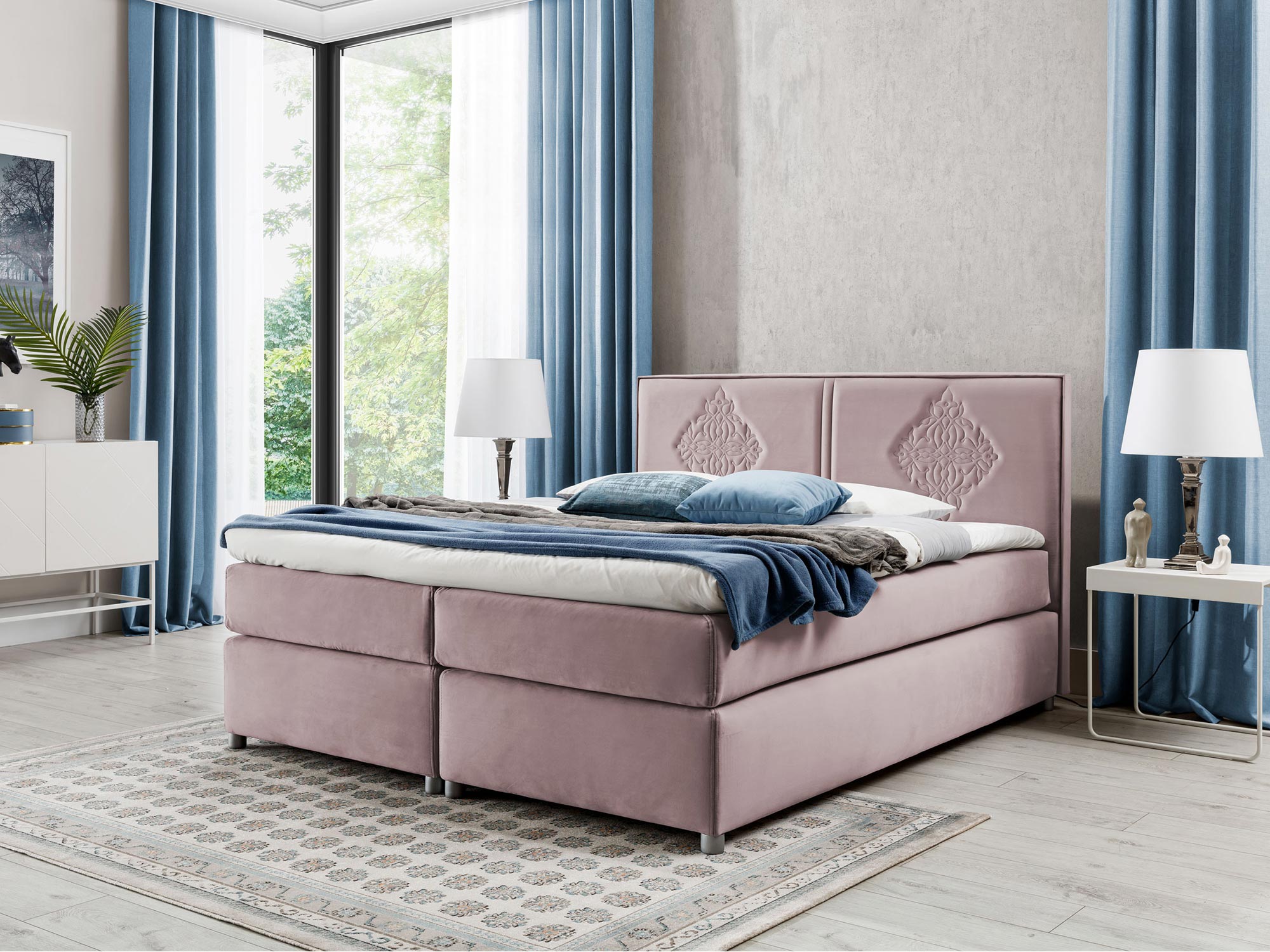 Łóżko tapicerowane w pudrowym różu z eleganckim wykończeniem
