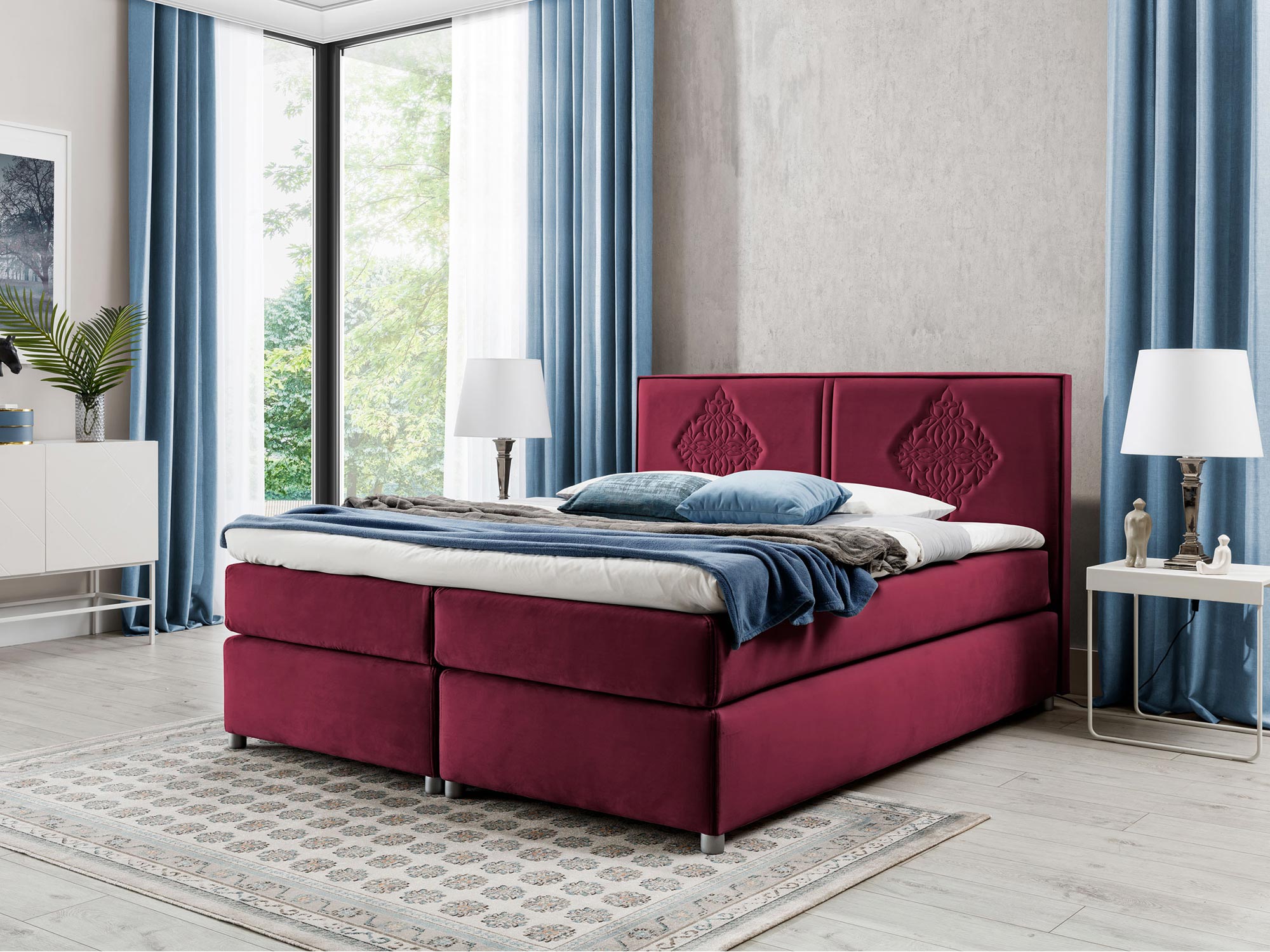 Łóżko tapicerowane w bordowym kolorze z geometrycznym pikowaniem