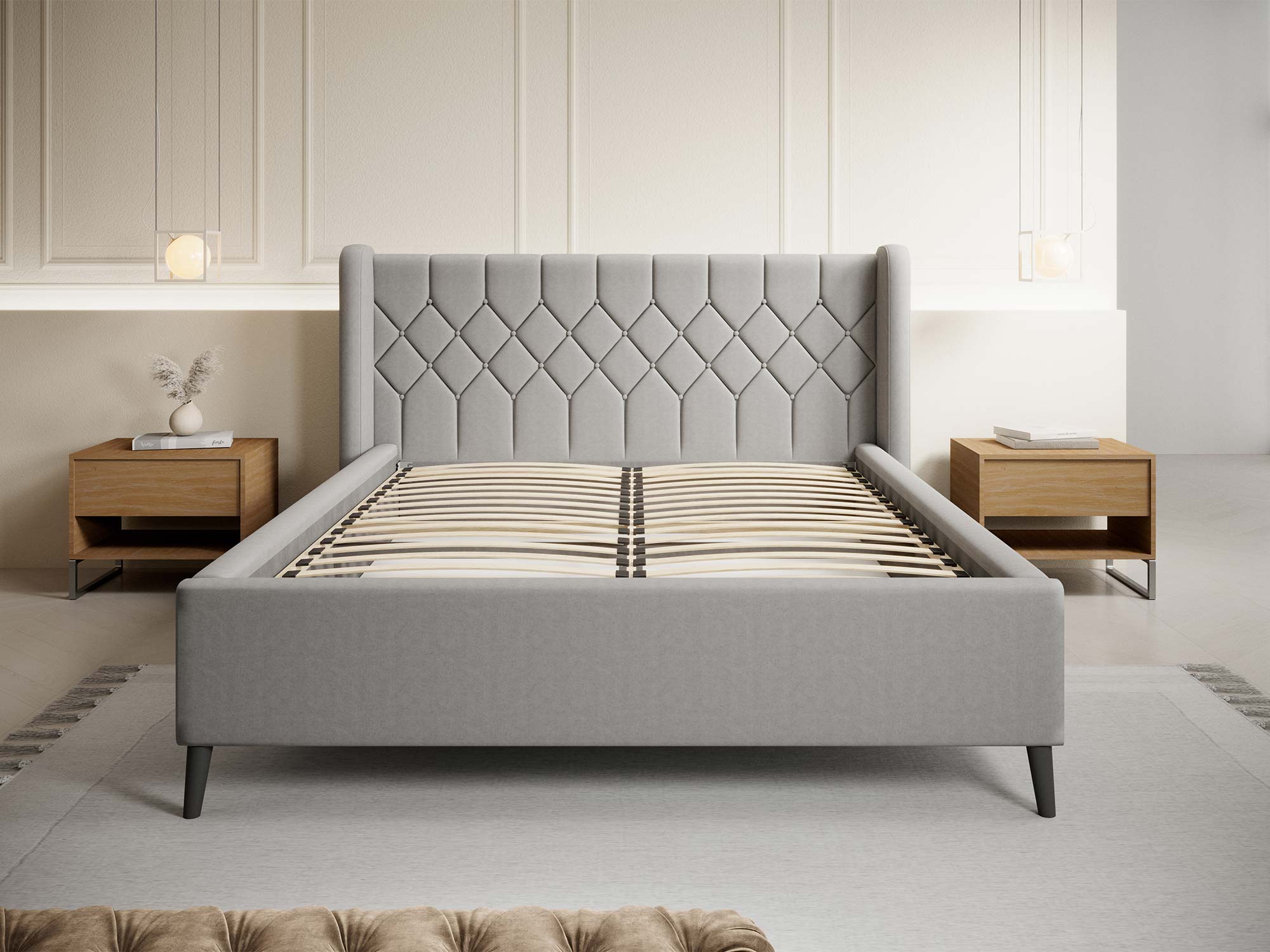 Łóżko tapicerowane DIANA – eleganckie łóżko do sypialni: forma, materiały, detale