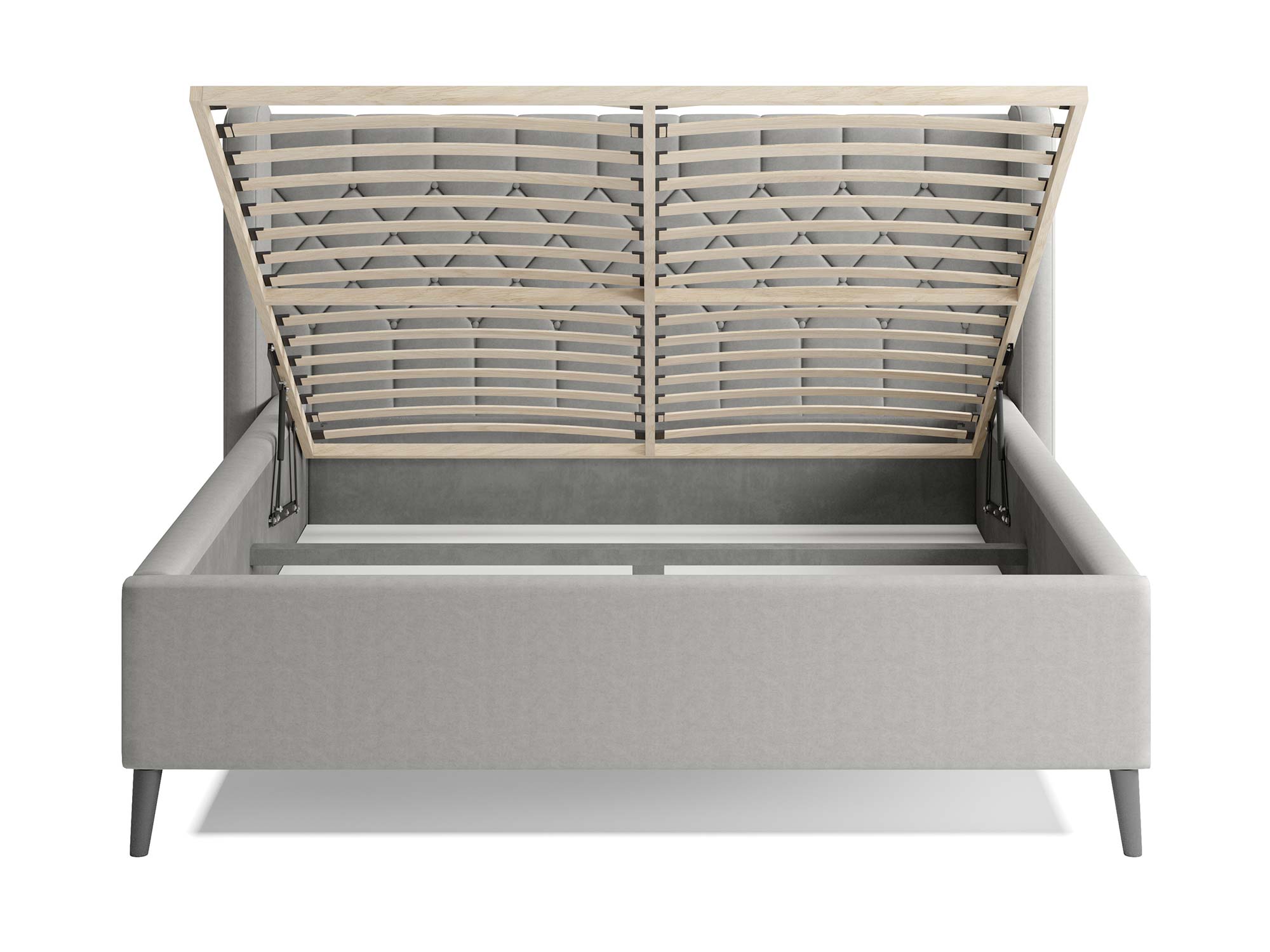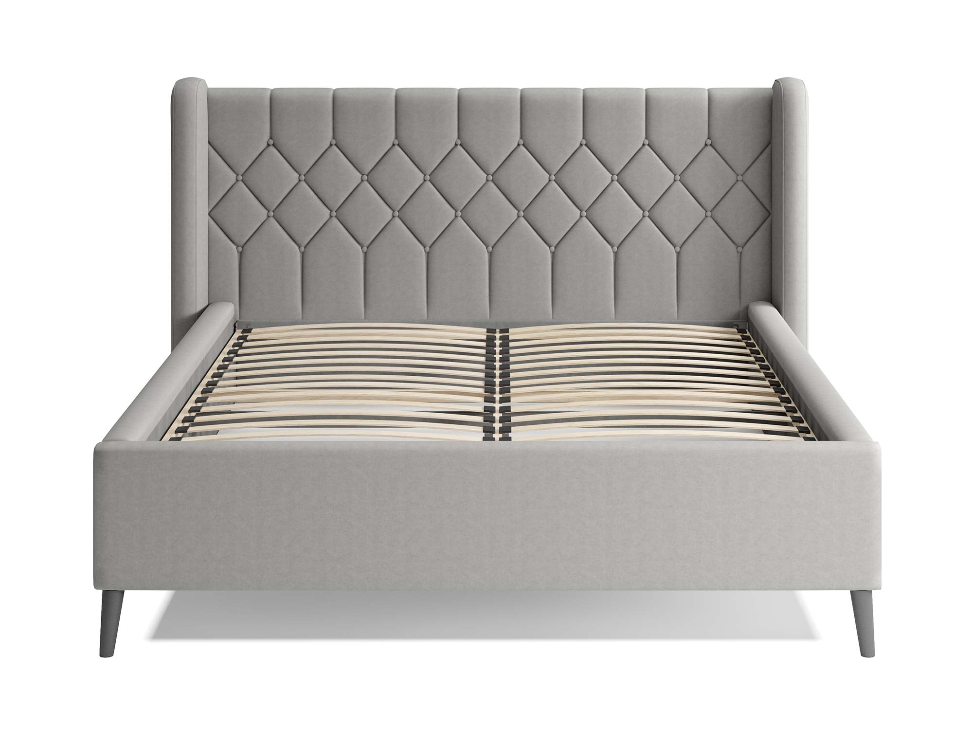 Pod tą elegancją stoi konkret: nośny szkielet z drewna sosnowego, wzmocniony płytą HDF oraz płytą szarą w newralgicznych elementach zagłowia. Komfort oparcia zapewnia zestaw pianki N2130 i owaty 130 g/m², a tył zagłówka wykończony podbitką popiel pozwala postawić łóżko także poza ścianą – DIANA prezentuje się świetnie z każdej strony.