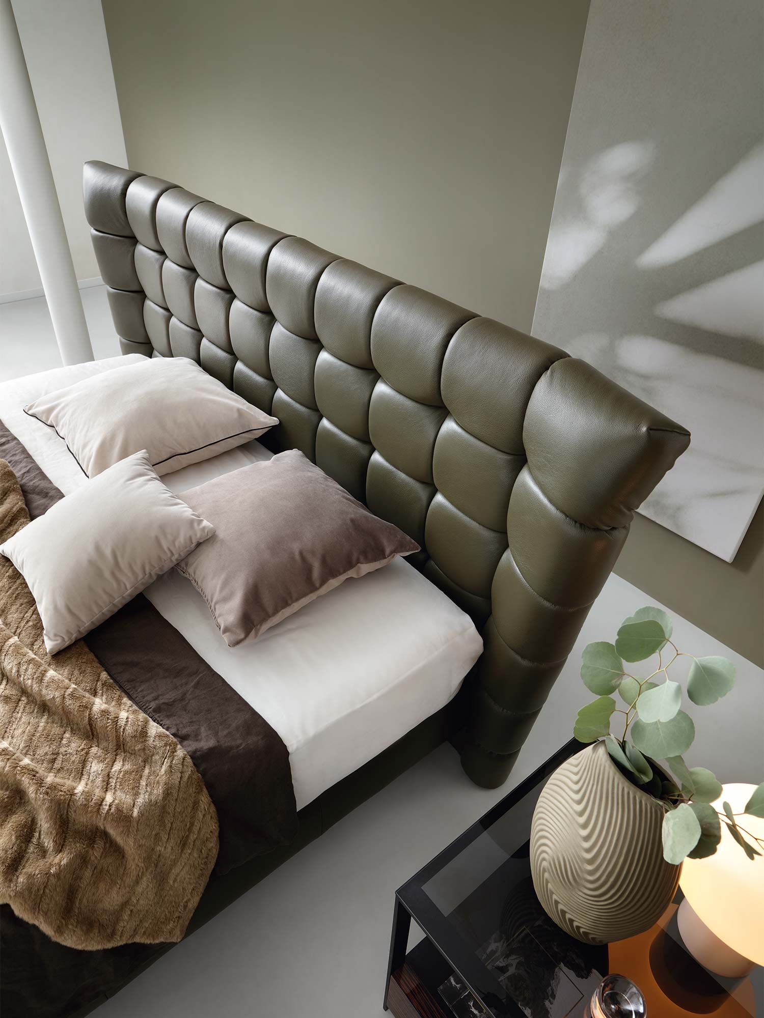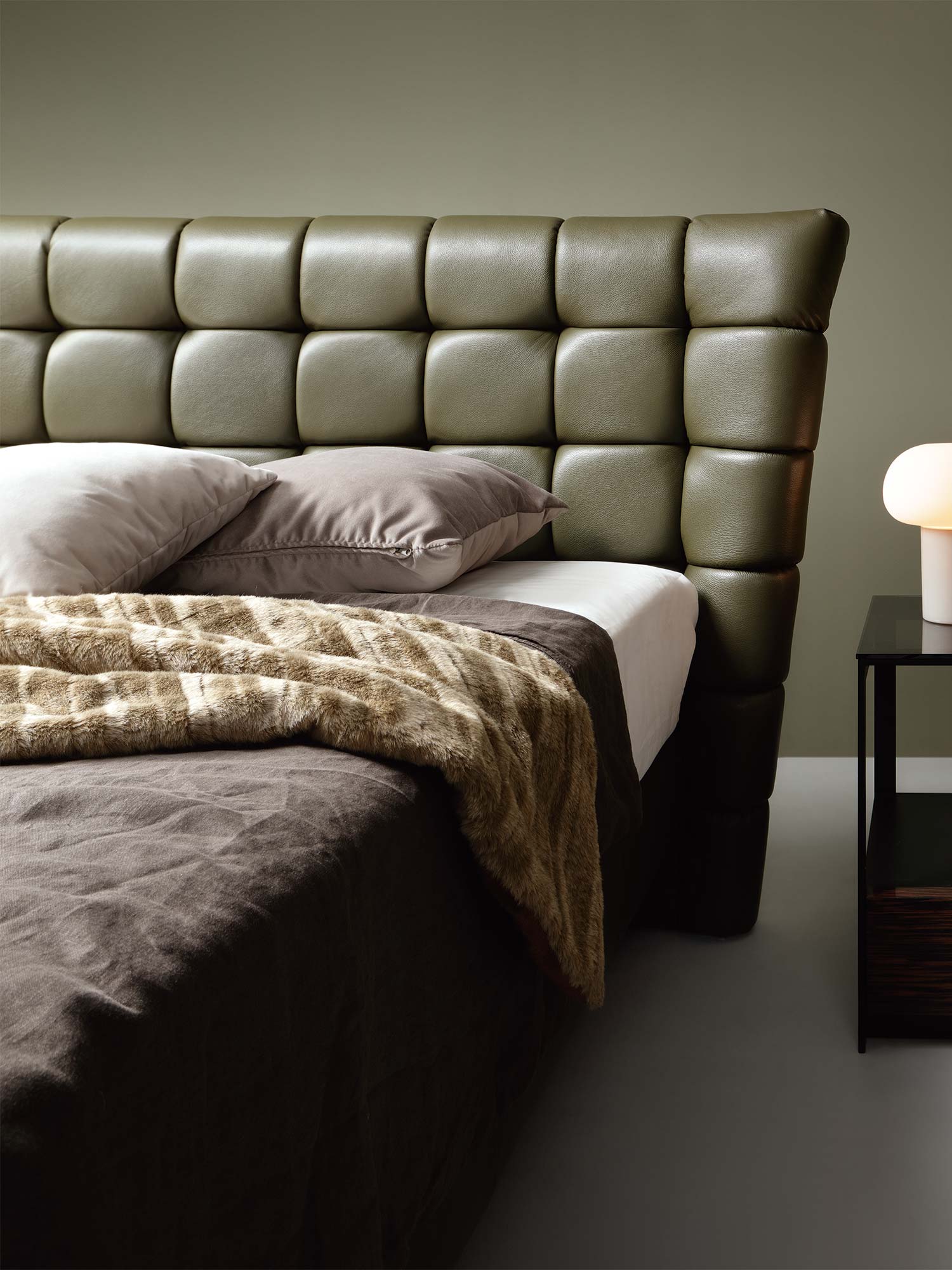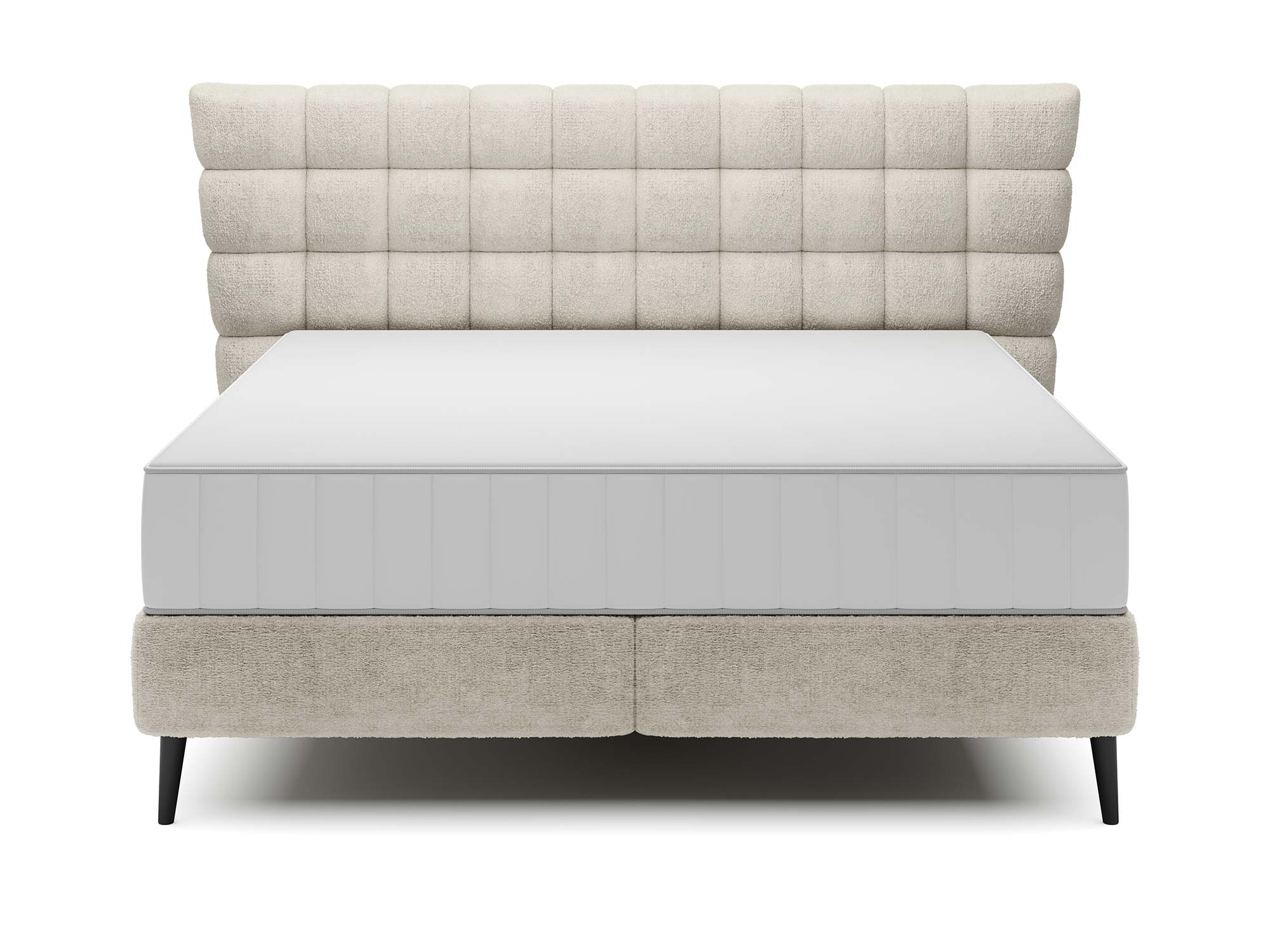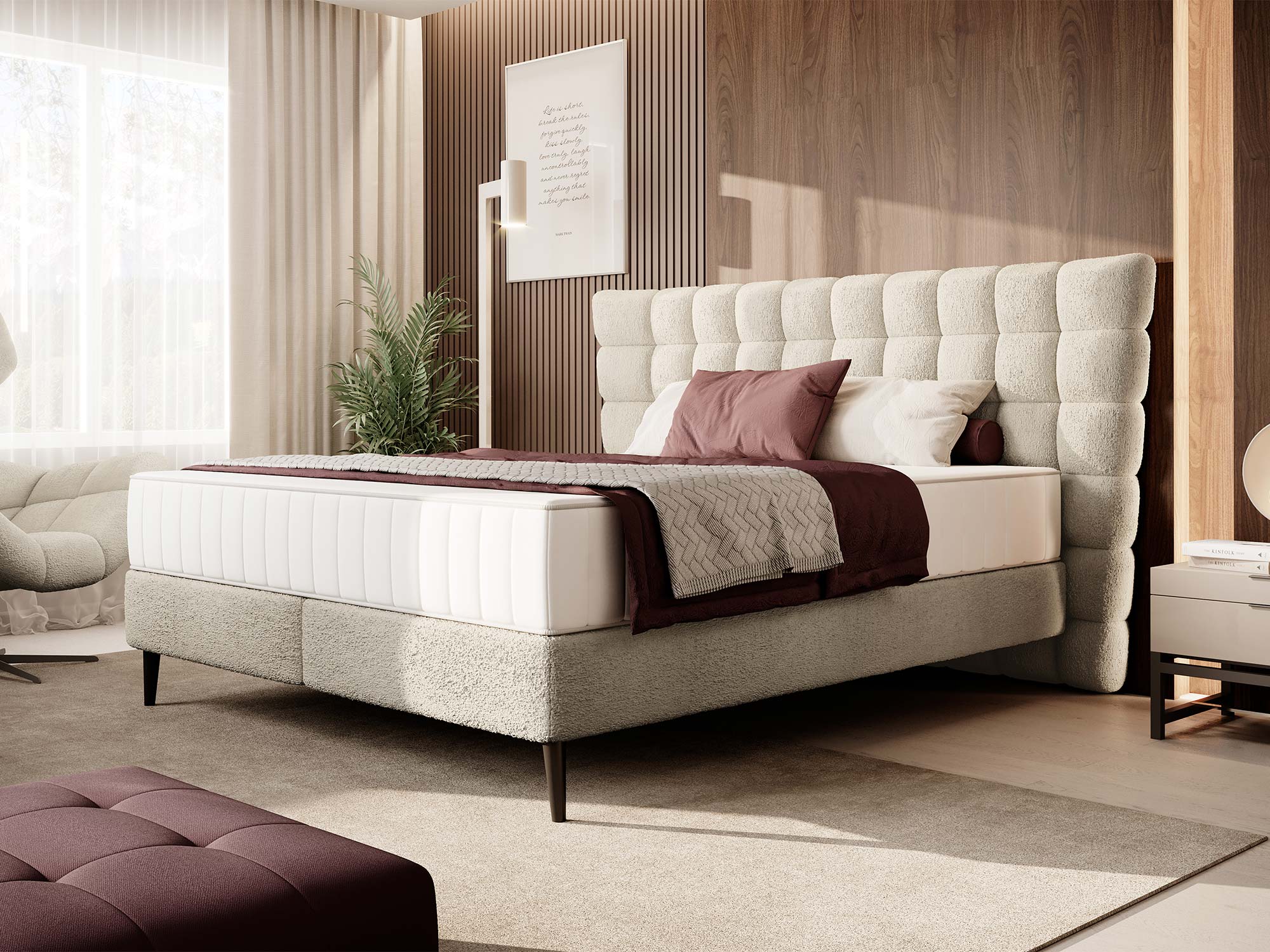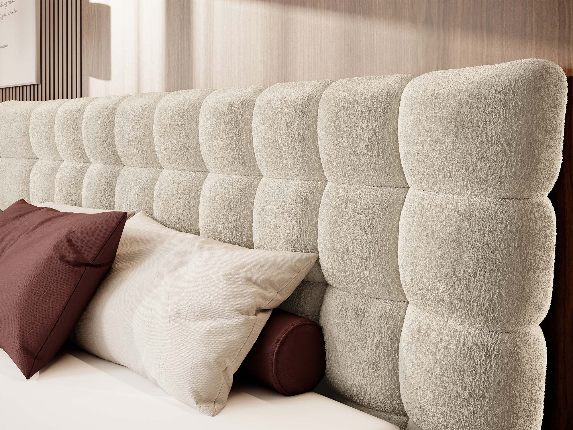 Sercem projektu jest wysokie wezgłowie 124 cm z geometrycznym pikowaniem. Głębokie wciągi i liczne przeszycia na piance tworzą grę światła i cienia, dzięki czemu łóżko staje się statement piece – dekoracją i funkcją w jednym. To nie tylko estetyka: miękka struktura wezgłowia zapewnia wygodne podparcie pleców podczas czytania książki, pracy przy laptopie czy porannej kawy.