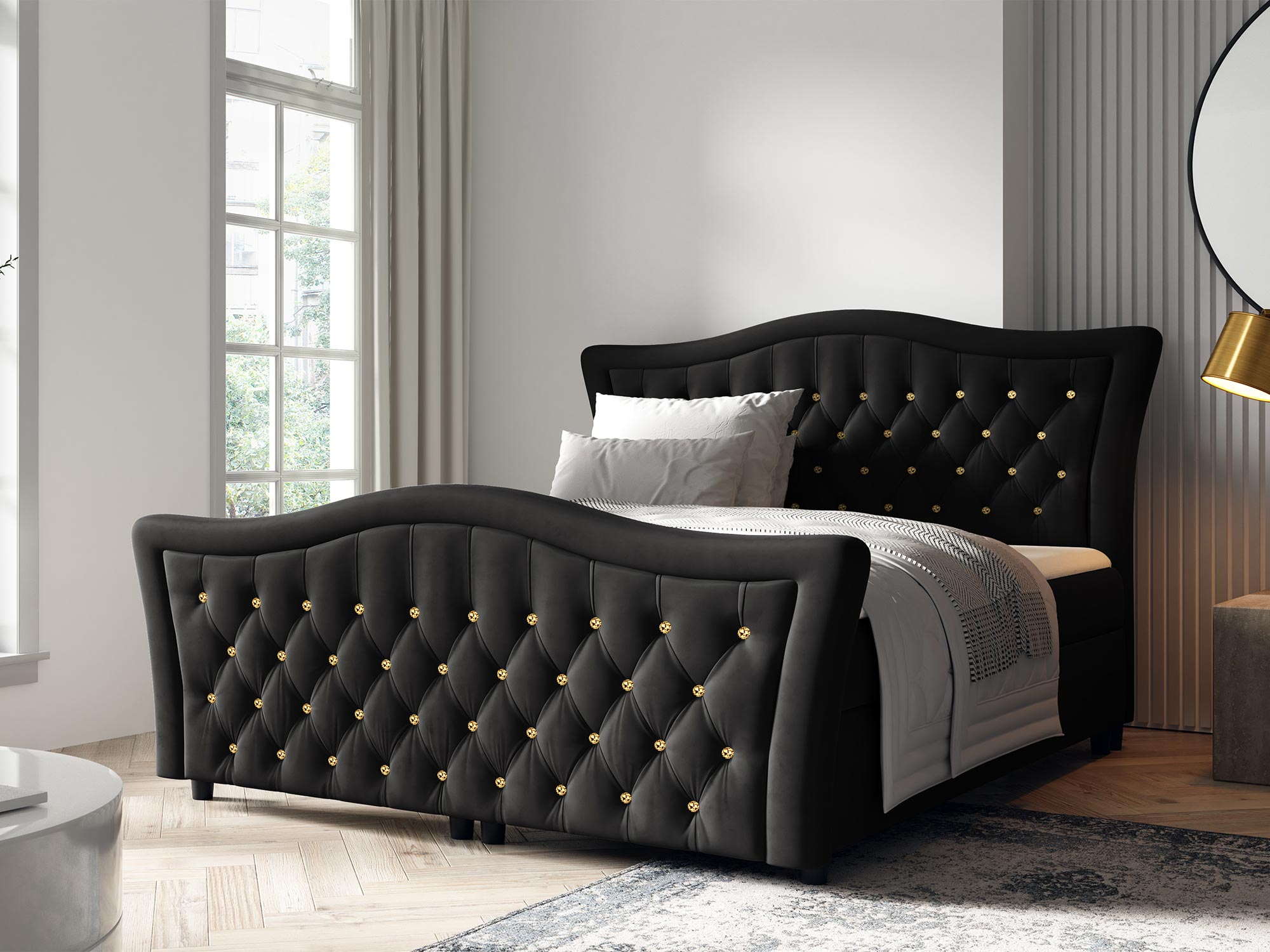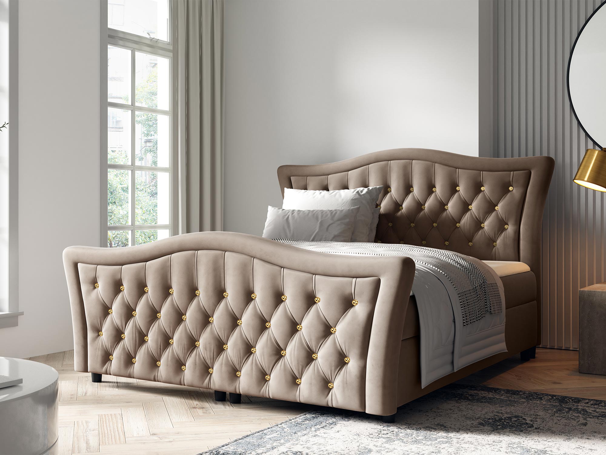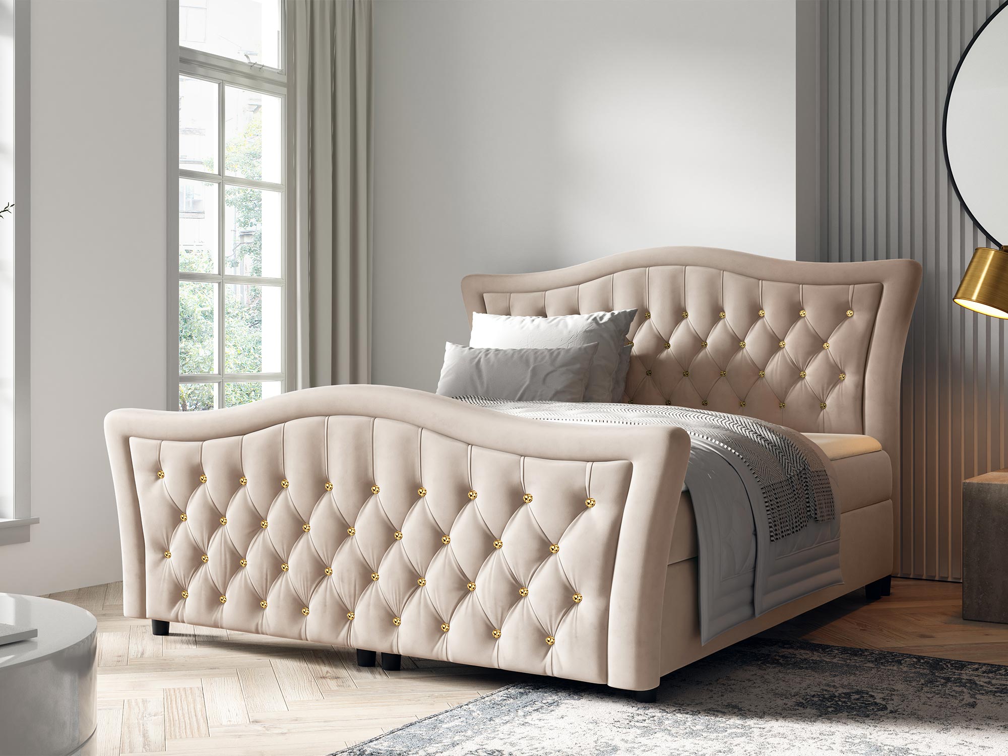 Dzięki swojemu falistemu zagłówkowi oraz klasycznym zdobieniom, łóżko Belmondo doskonale wpisuje się w aranżacje sypialni w stylu classic luxury. Jego elegancki design oraz funkcjonalność sprawiają, że łóżko będzie stanowić nie tylko komfortowe miejsce do spania, ale również stylową ozdobę wnętrza. Dodatkowo, niskie nóżki dodają łóżku nowoczesnego akcentu, jednocześnie zapewniając jego stabilność.