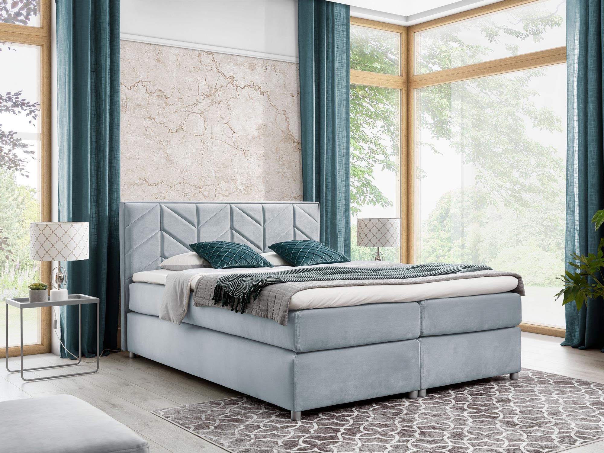 Łóżko Foret to nie tylko estetyka, ale również funkcjonalność. Brak pojemnika na pościel nadaje meblowi lekkości i nowoczesnego charakteru, co wpisuje się w minimalistyczne trendy aranżacyjne. Drewniane nóżki w srebrnym wykończeniu dodają elegancji i subtelności, a jednocześnie zapewniają stabilność i trwałość. Niezwykle ważnym elementem są też przeszycia na zagłowiu, które oprócz swojej estetycznej funkcji, dodają luksusu i elegancji, nawiązując do klasycznych wzorów w nowoczesnej interpretacji.