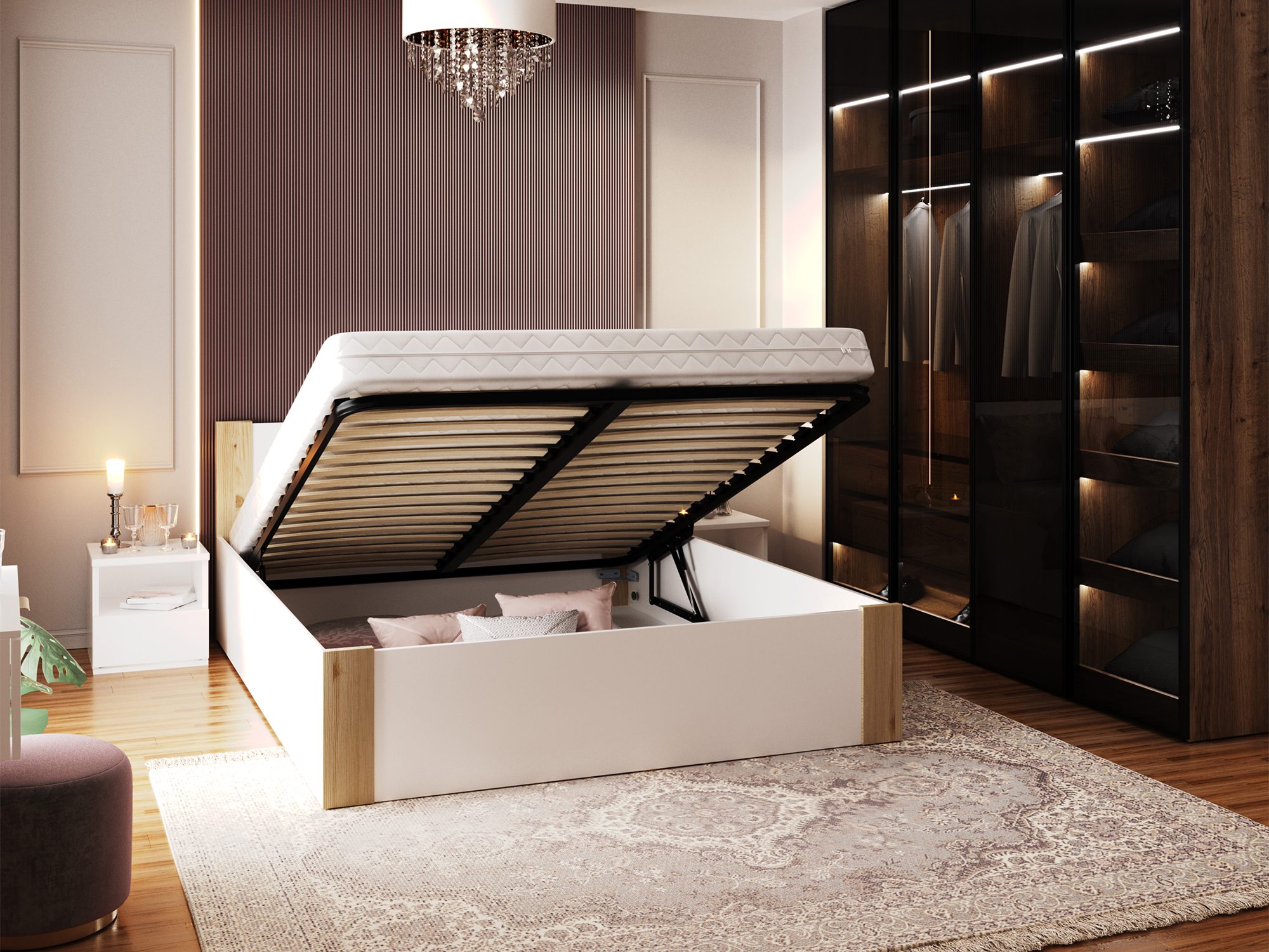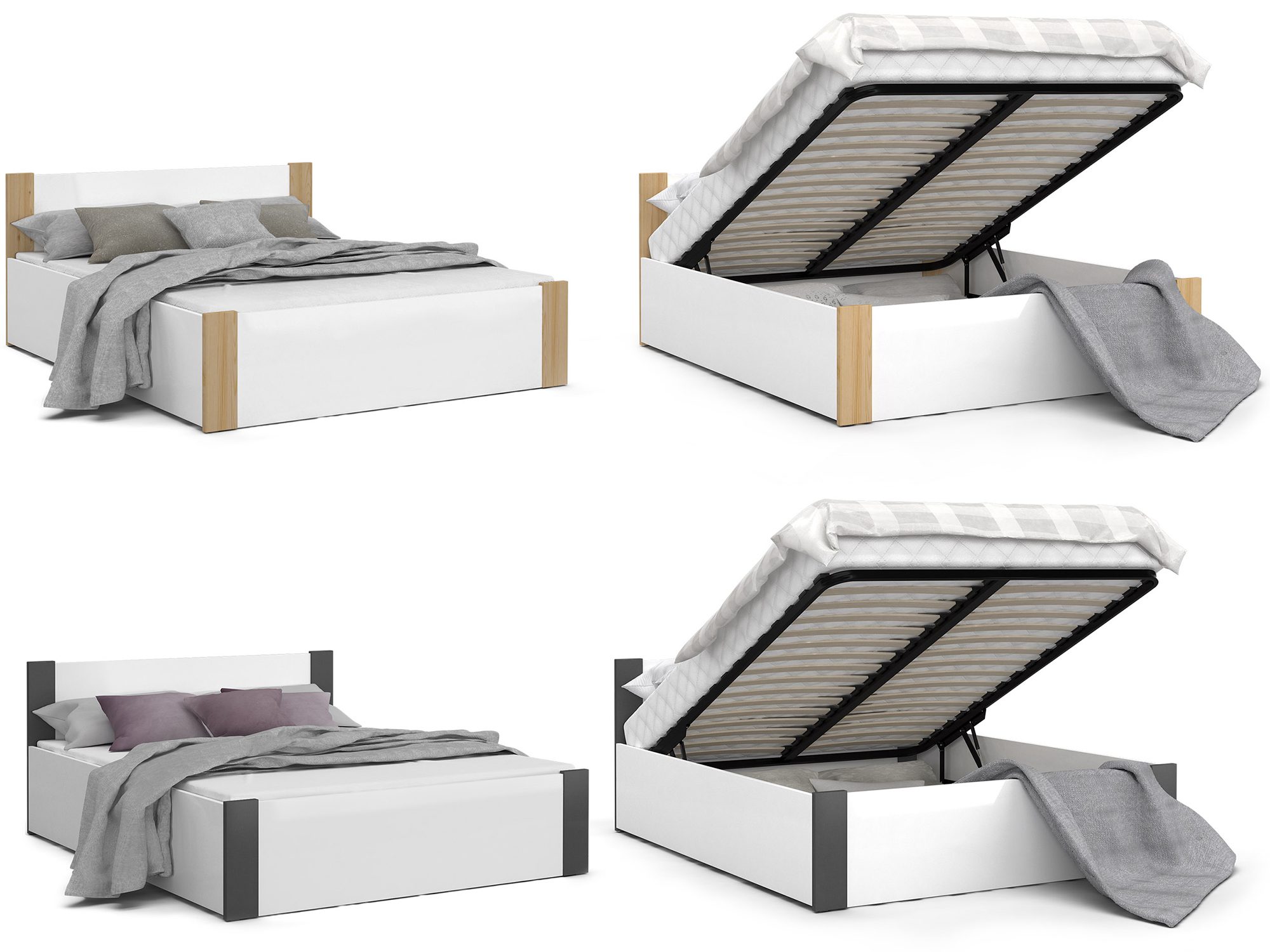 Wersja ze stelażem drewnianym to propozycja dla tych, którzy cenią prostotę i naturalne rozwiązania. Stabilna konstrukcja zapewnia komfort snu oraz trwałość przez długie lata. Z kolei wersja ze stelażem metalowym podnoszonym to idealna opcja, jeśli cenisz praktyczne wykorzystanie przestrzeni – dzięki wbudowanemu pojemnikowi zyskasz dodatkowe miejsce na pościel, koce czy sezonowe ubrania.