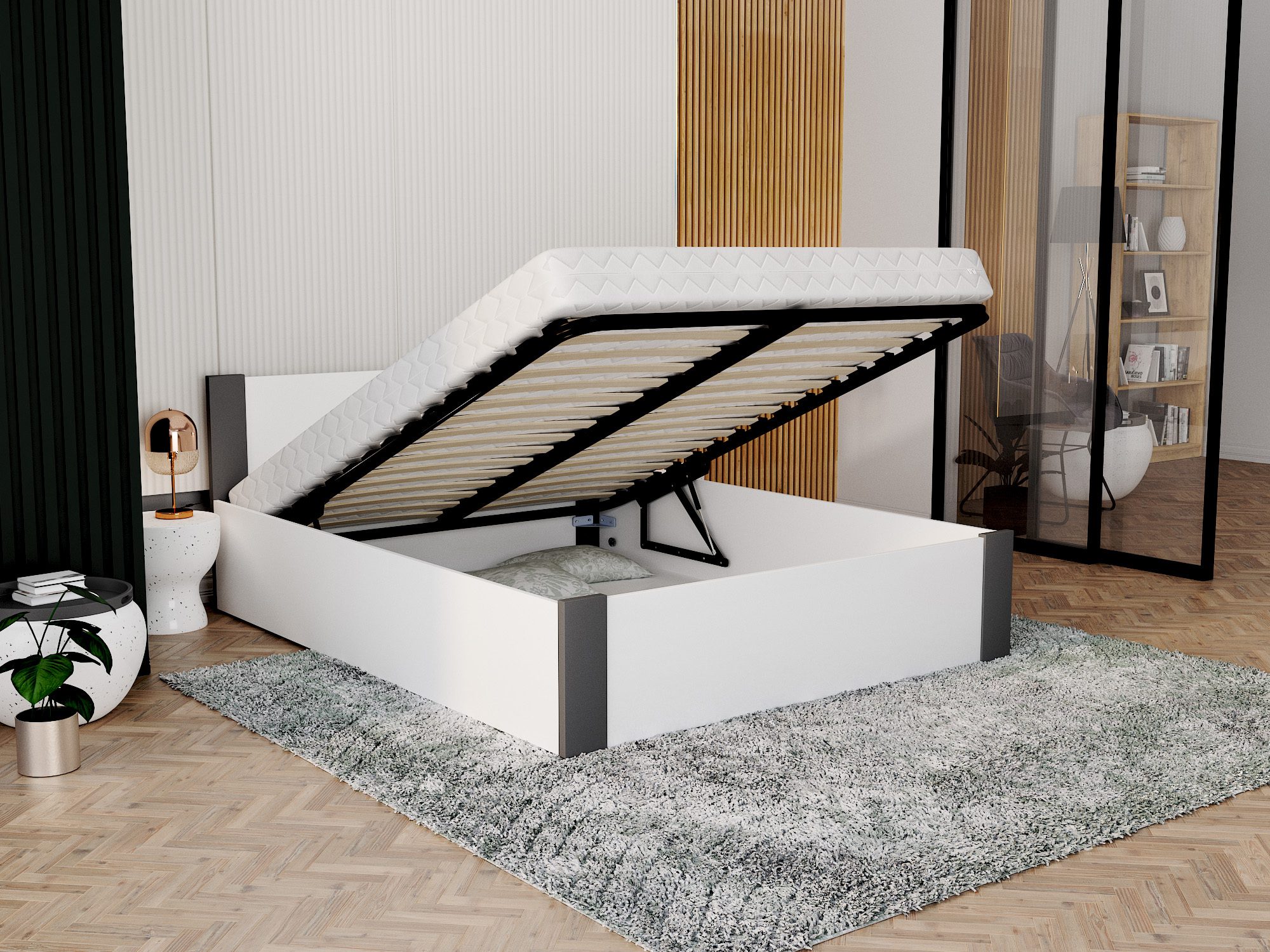 Łóżko z pojemnikiem białe nowoczesne do sypialni | Corner