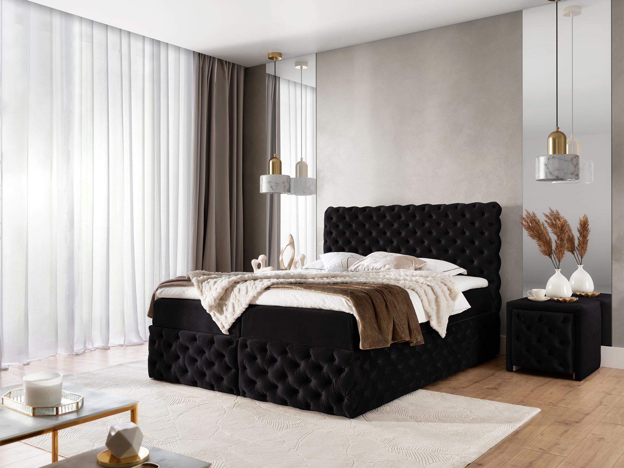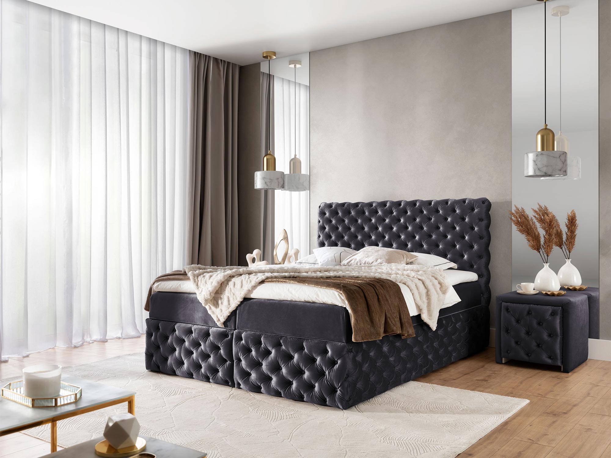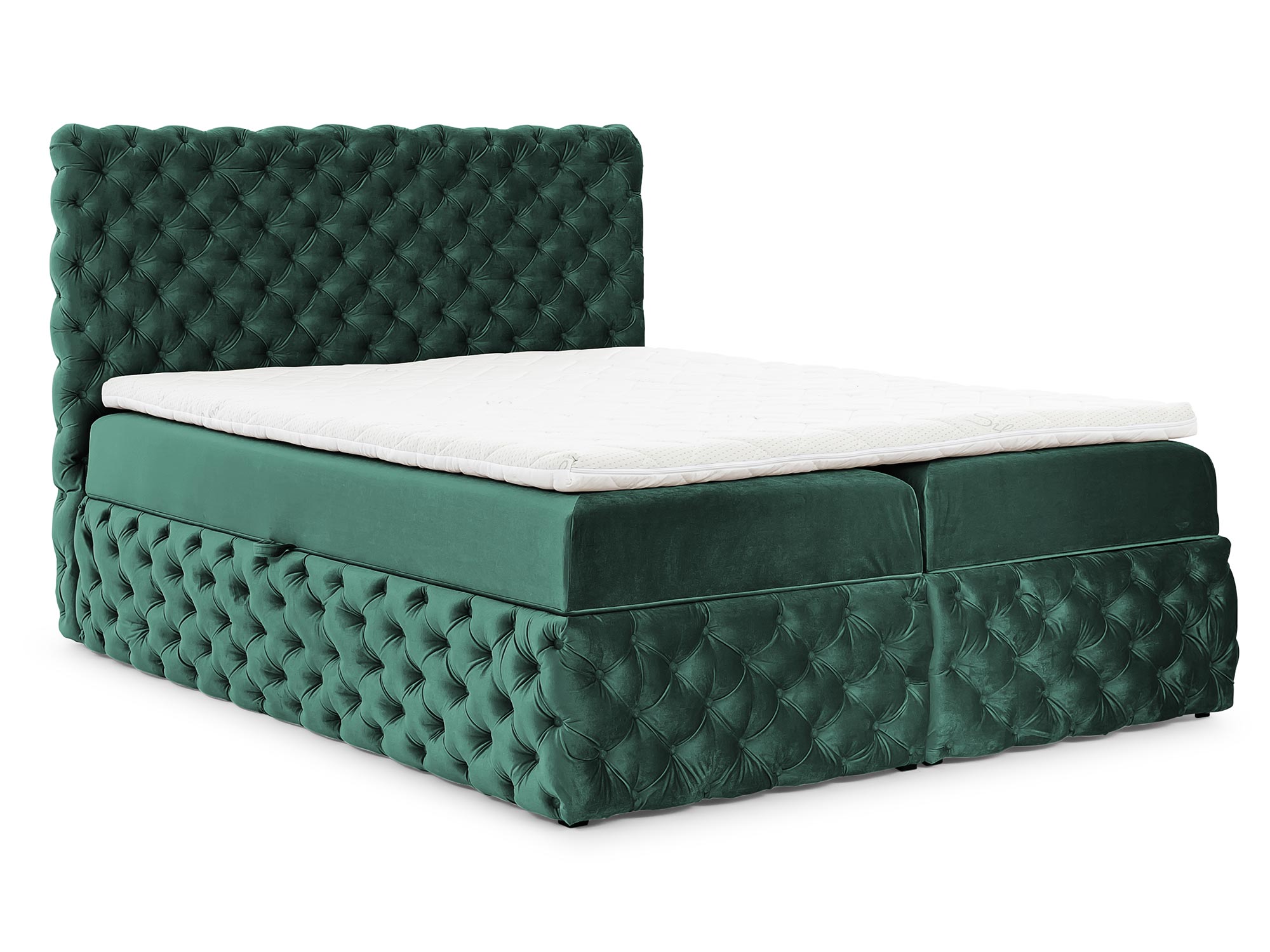 Luksusowe Łóżko ROSA wyróżnia się pięknie pikowanym zagłówkiem i korpusem, które wykonano w stylu Chesterfield. Pikowania w eleganckiej tkaninie podkreślają ekskluzywny charakter tego modelu. Wysoki, tapicerowany zagłówek z głębokimi guzikami doda Twojej sypialni klasy i szyku, a jednocześnie zapewni wygodę podczas czytania czy relaksu.